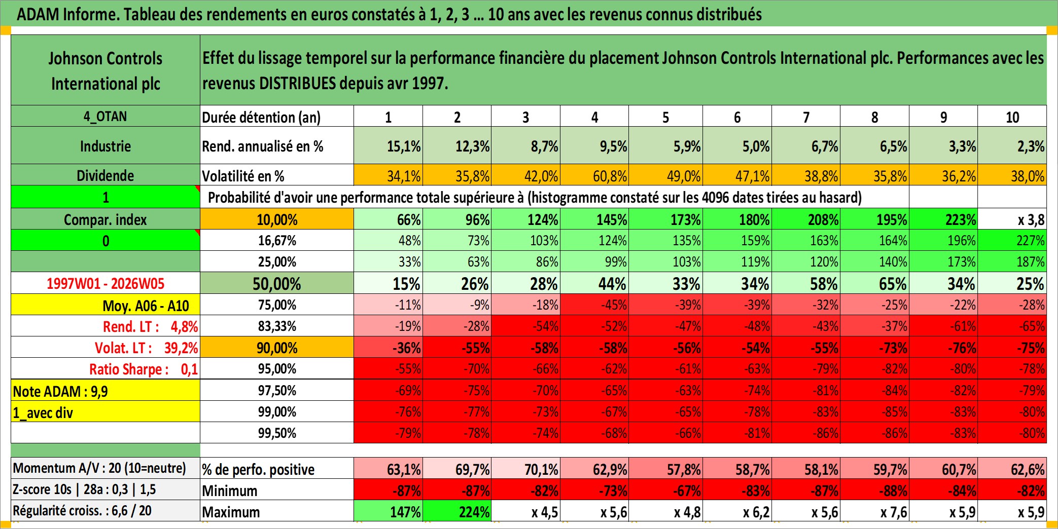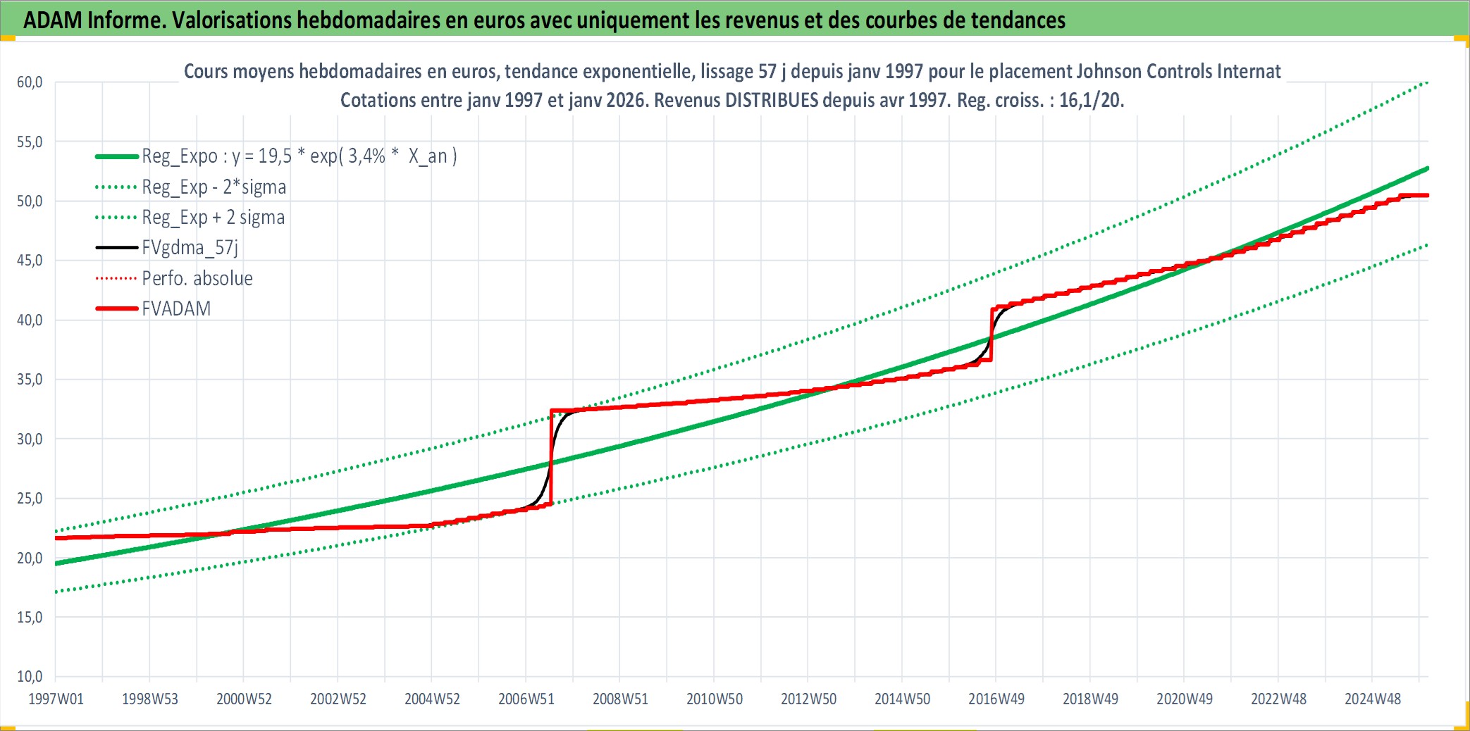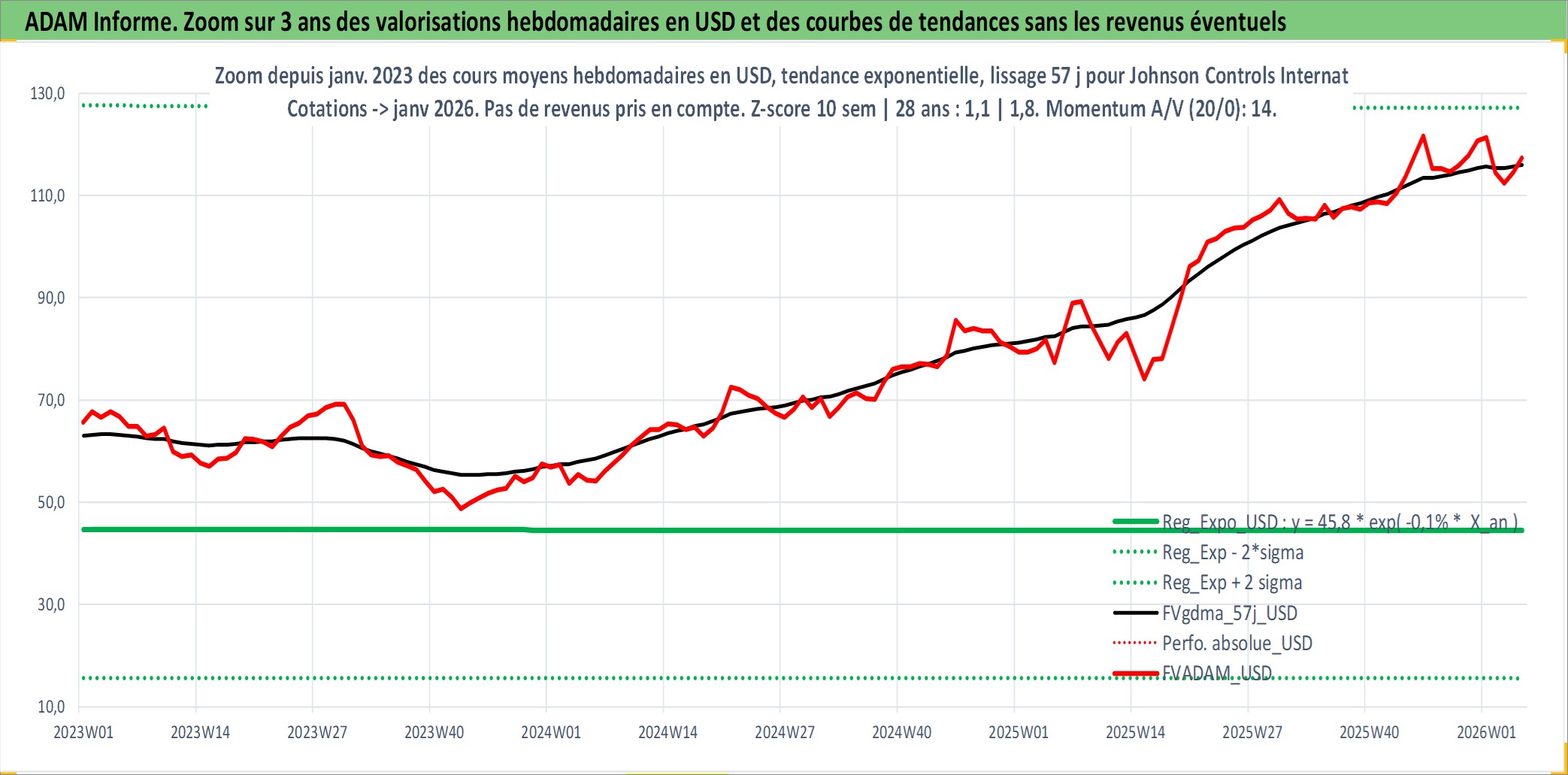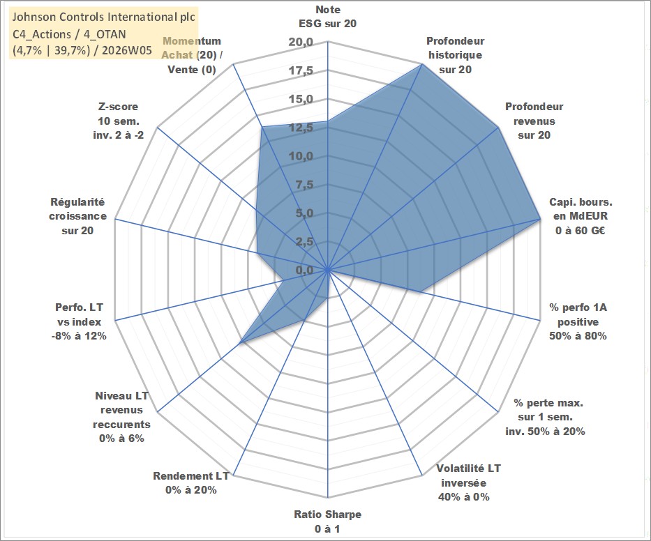 Site dédié aux investisseursPage dédiée sur site financeAnalyse des valorisations hebdomadaires de l'action Johnson Controls International plc. Cet actif est cote en USD. Les valorisations sont en contrevaleur EURO et couvrent les semaines 1997W01 a 2026W05. Les revenus de cet actif financier sont pris en compte depuis la semaine 1997W14. La note globale ESG de cet actif est estimee a 13.0 (apres rebasage entre 0 et 20).