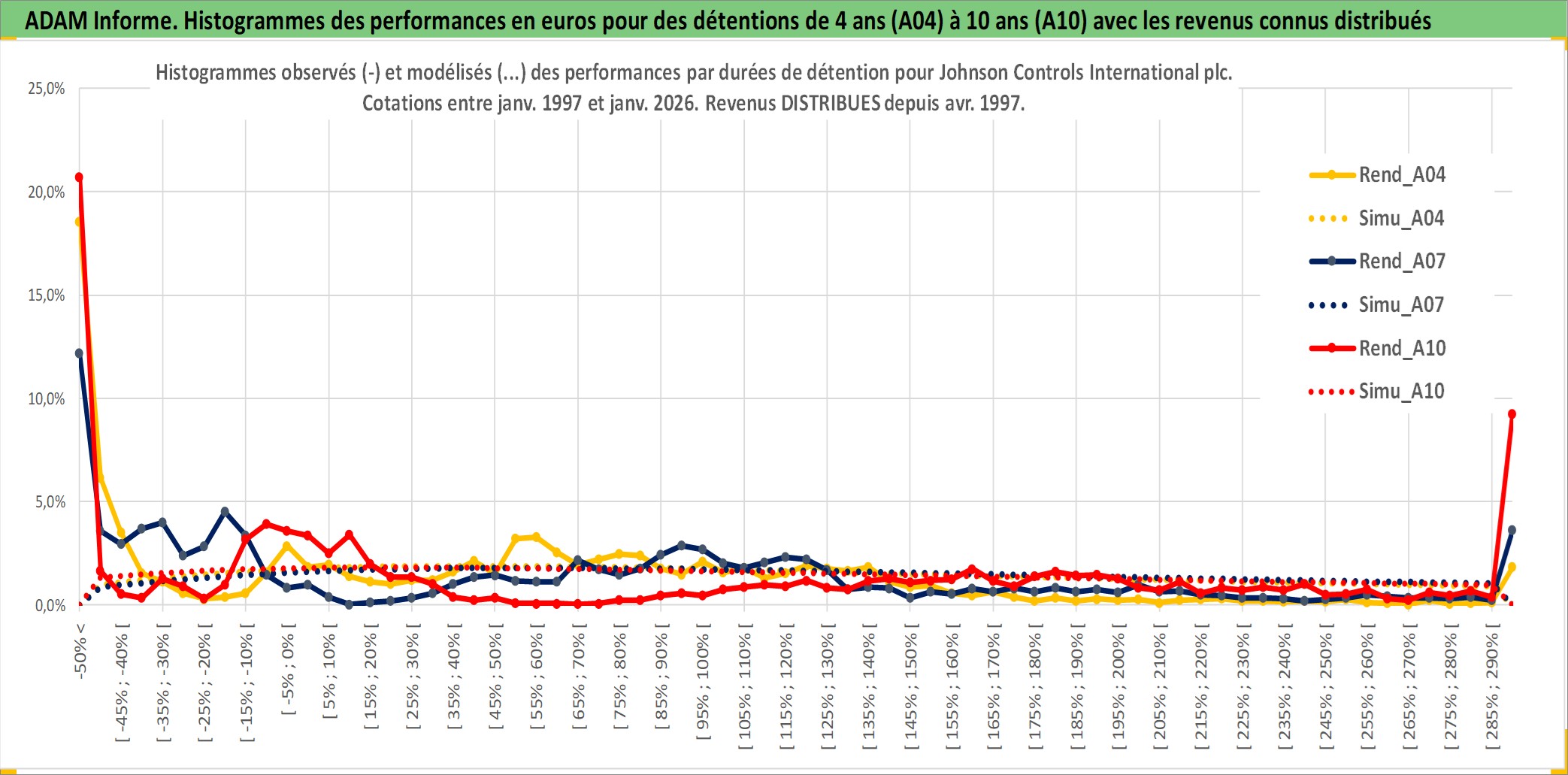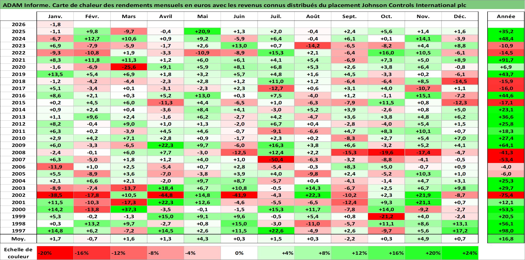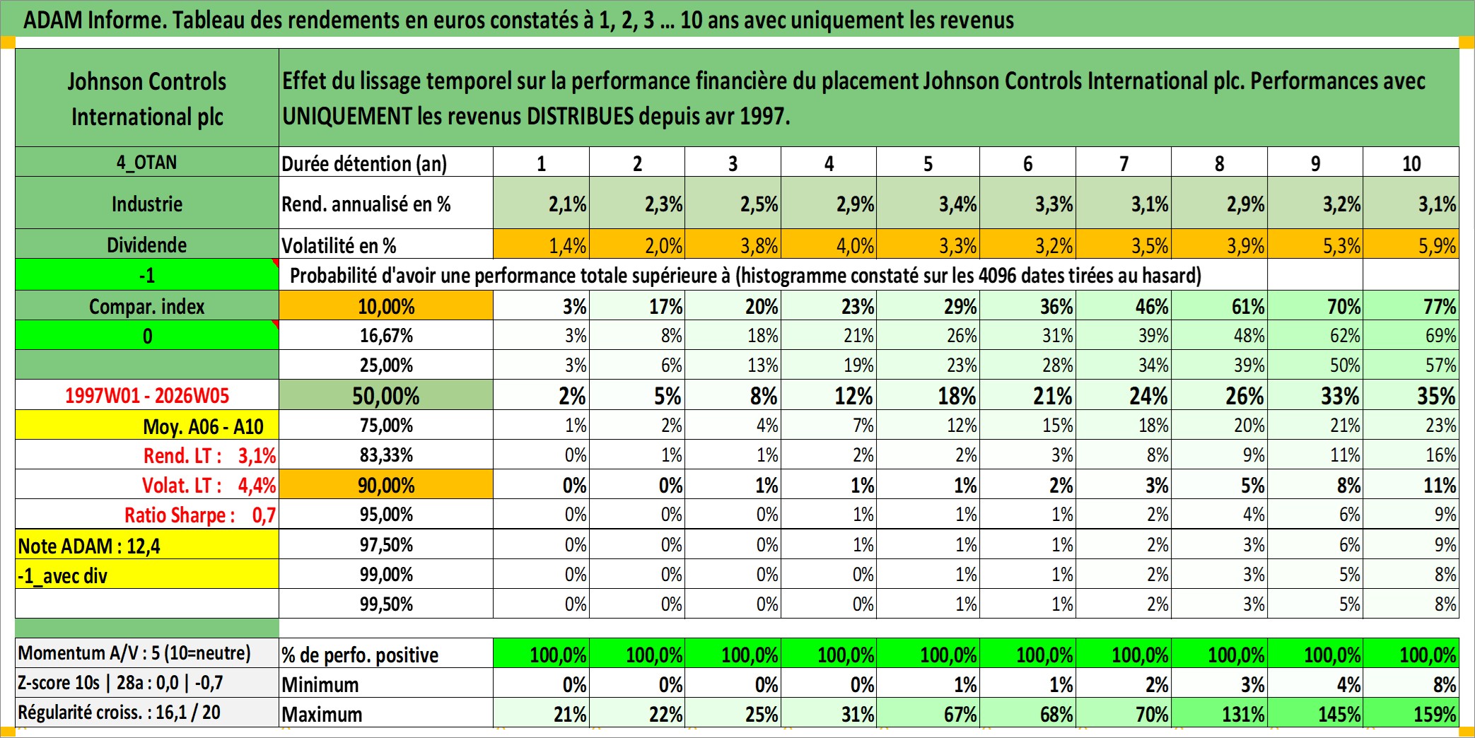 Site dédié aux investisseursPage dédiée sur site financeAnalyse des valorisations hebdomadaires de l'action Johnson Controls International plc. Cet actif est cote en USD. Les valorisations sont en contrevaleur EURO et couvrent les semaines 1997W01 a 2026W05. Les revenus de cet actif financier sont pris en compte depuis la semaine 1997W14. La note globale ESG de cet actif est estimee a 13.0 (apres rebasage entre 0 et 20).
