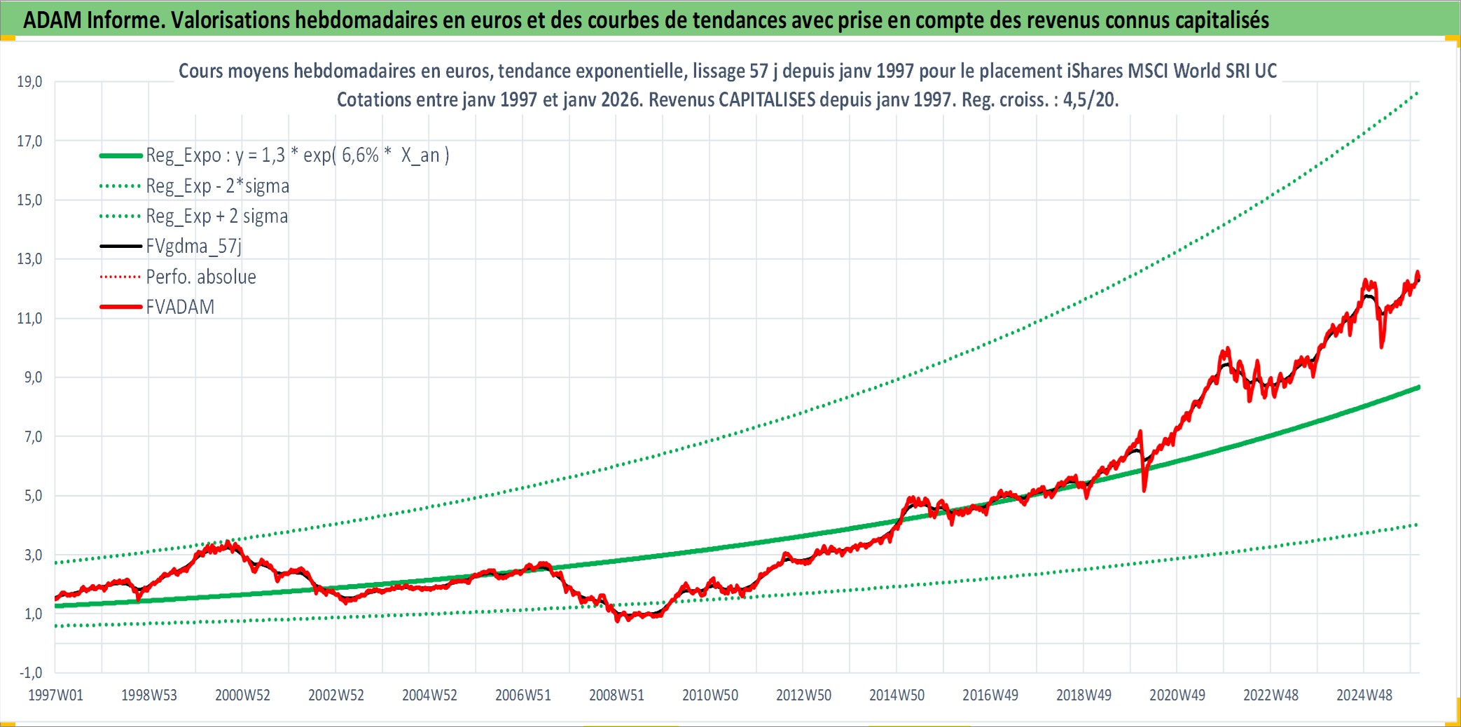 Site dédié aux investisseursPage dédiée sur site financeAnalyse des valorisations hebdomadaires du fonds iShares MSCI World SRI UCITS ETF Matla EUR Acc. Cet actif est cote en EUR. Les valorisations couvrent les semaines 1997W01 a 2026W05. Les revenus de cet actif financier sont pris en compte depuis la semaine 1997W01. La note globale ESG de cet actif est estimee a 8.3 (apres rebasage entre 0 et 20).