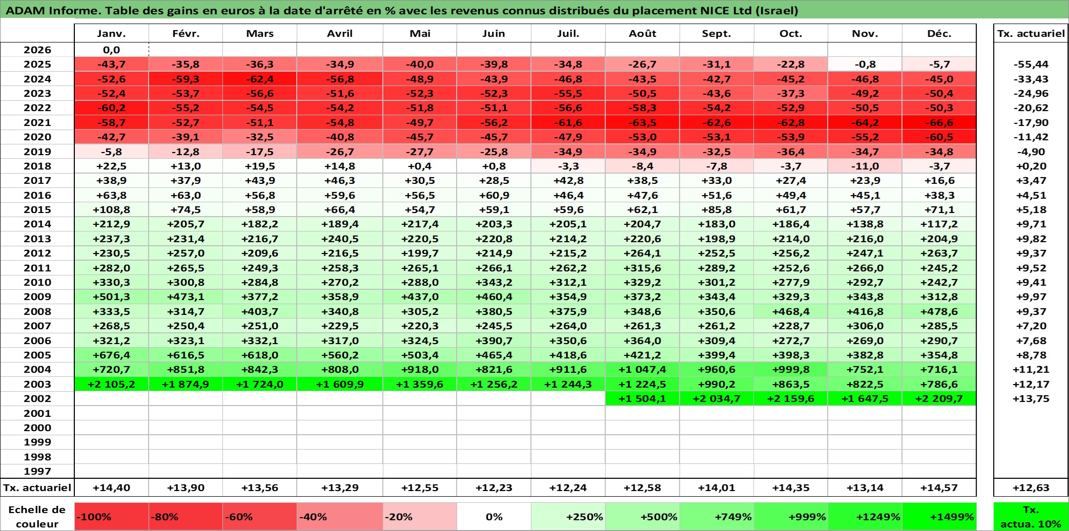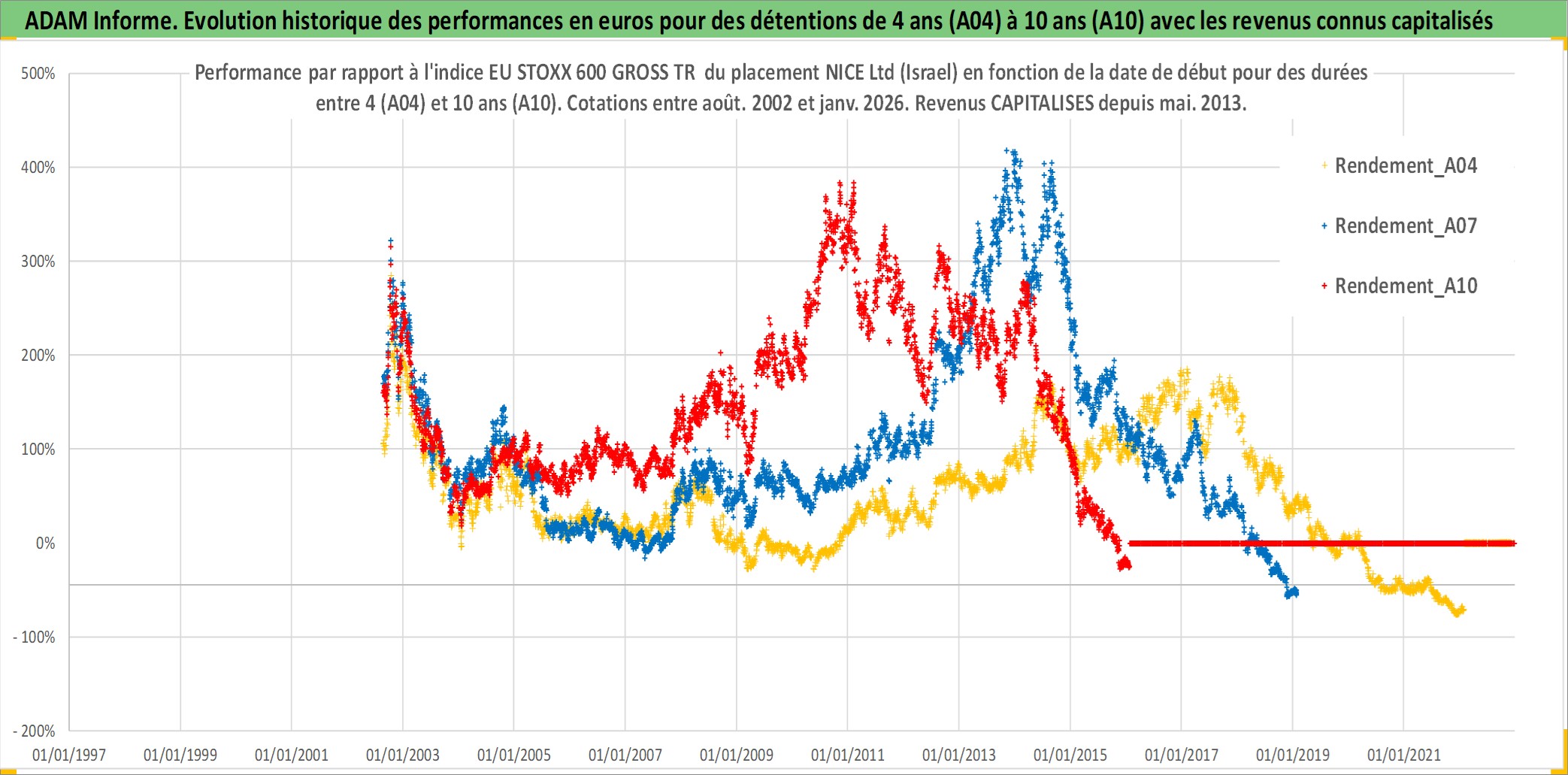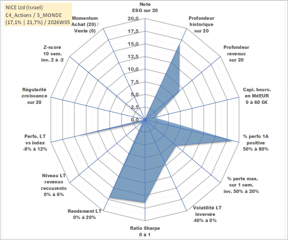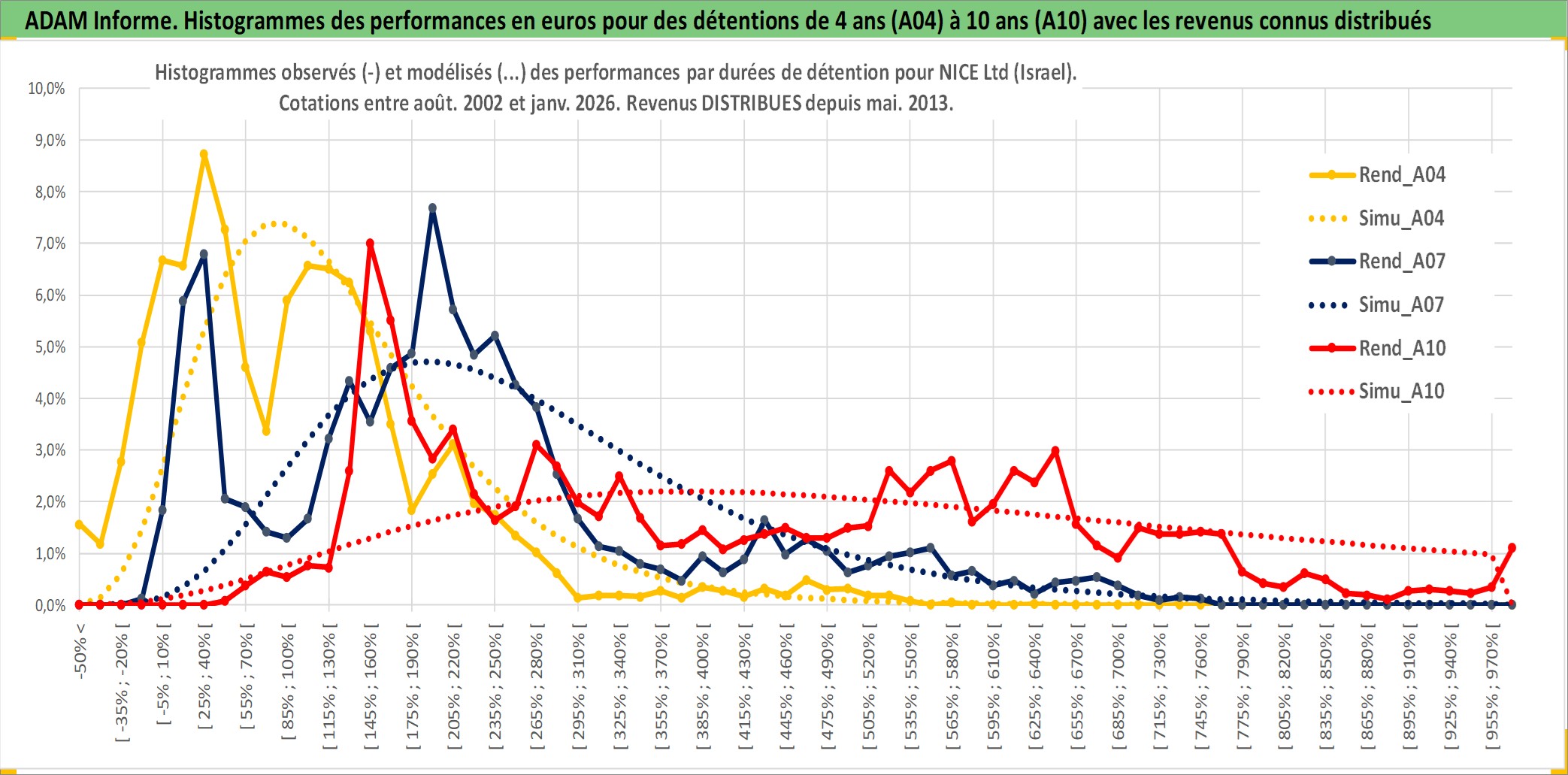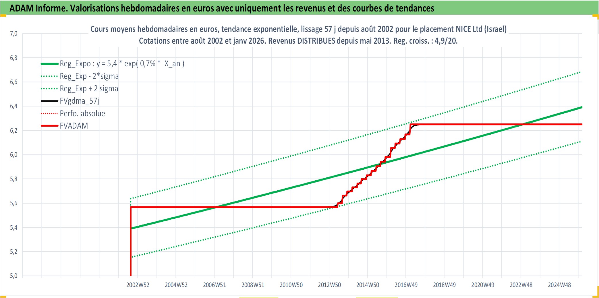 Site dédié aux investisseursPage dédiée sur site financeAnalyse des valorisations hebdomadaires de l'action NICE Ltd (Israel). Cet actif est cote en ILA. Les valorisations sont en contrevaleur EURO et couvrent les semaines 2002W33 a 2026W05. Les revenus de cet actif financier sont pris en compte depuis la semaine 2013W21. La note ESG de cet actif n'est pas connue.