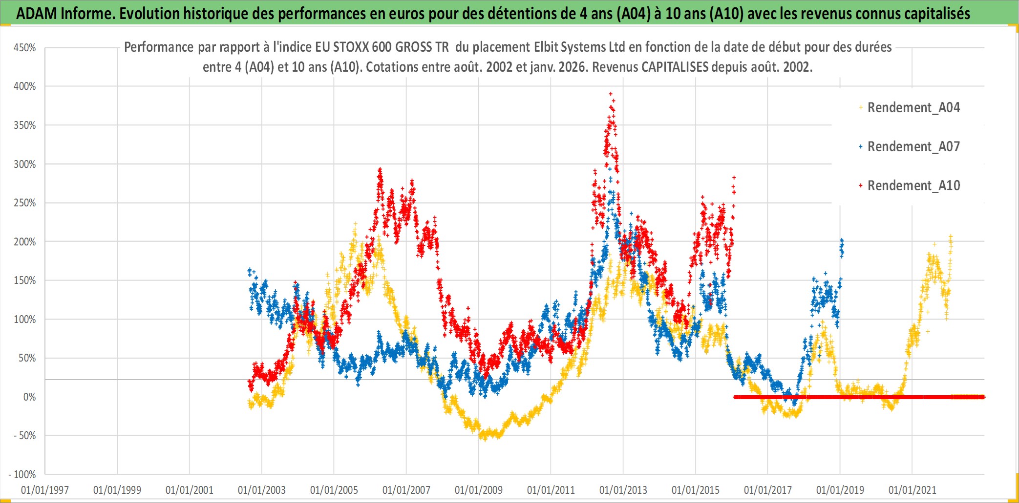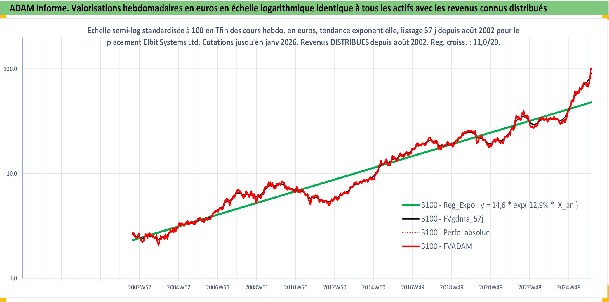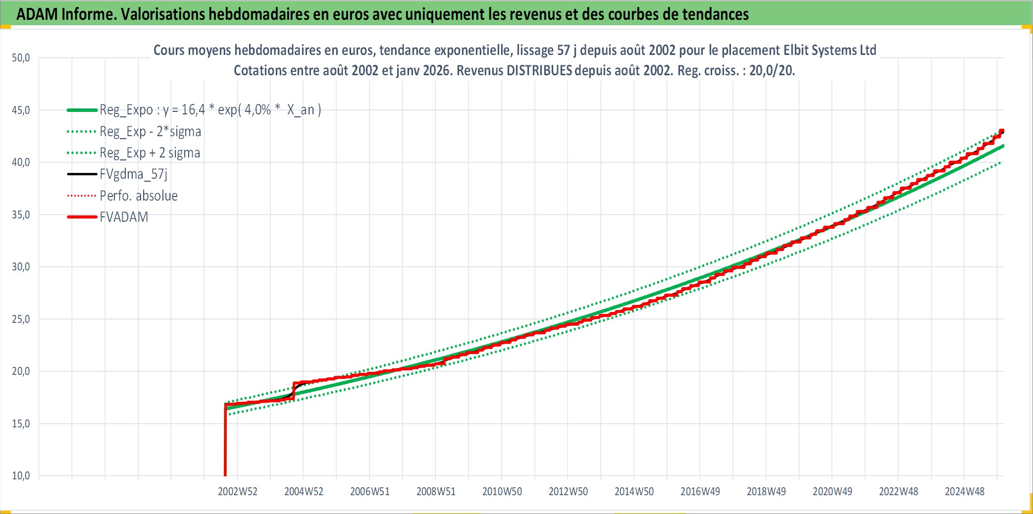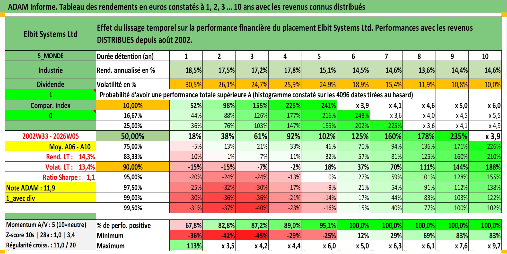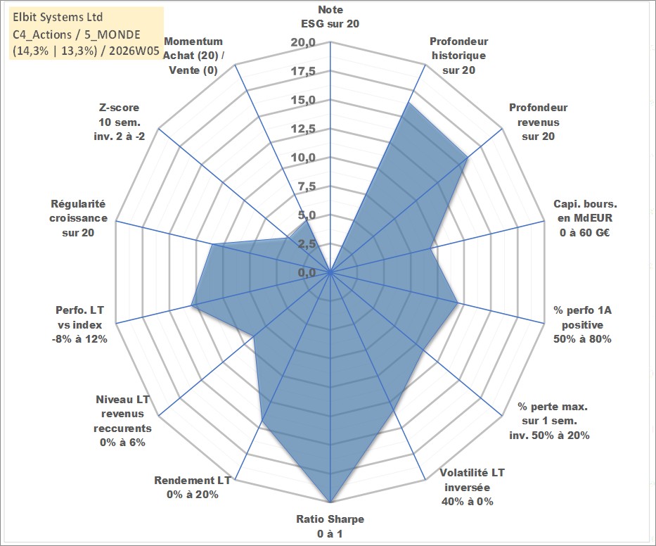Site dédié aux investisseursPage dédiée sur site financeAnalyse des valorisations hebdomadaires de l'action Elbit Systems Ltd. Cet actif est cote en ILA. Les valorisations sont en contrevaleur EURO et couvrent les semaines 2002W33 a 2026W05. Les revenus de cet actif financier sont pris en compte depuis la semaine 2002W35. La note ESG de cet actif n'est pas connue.