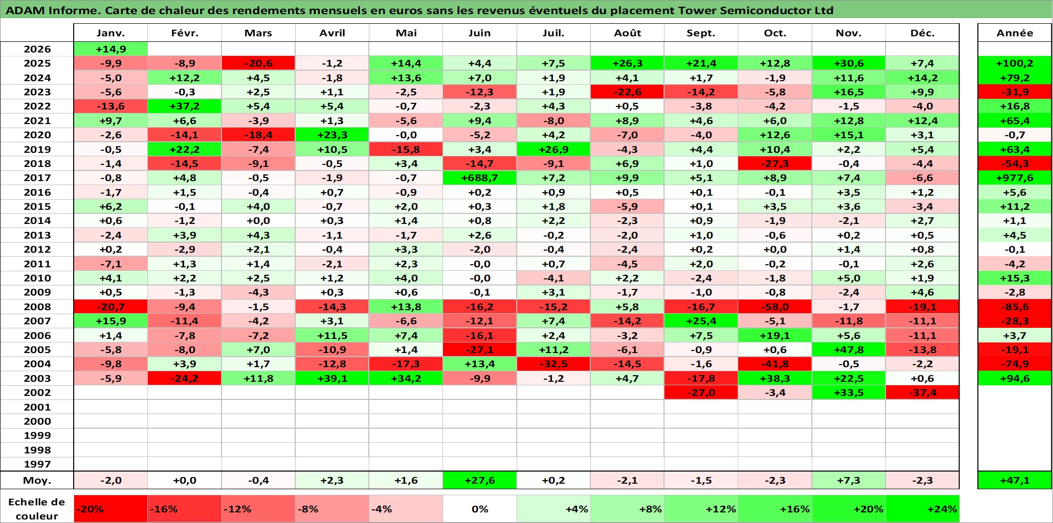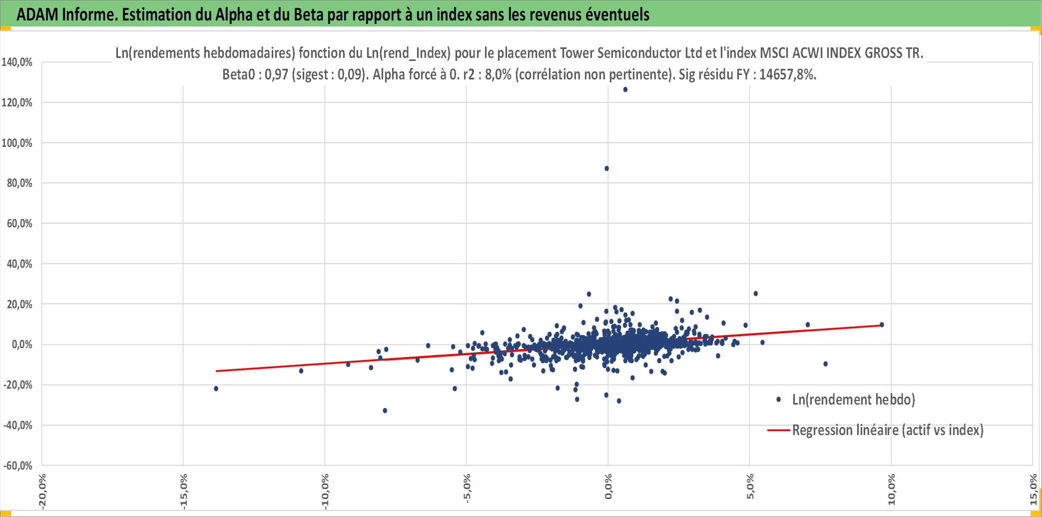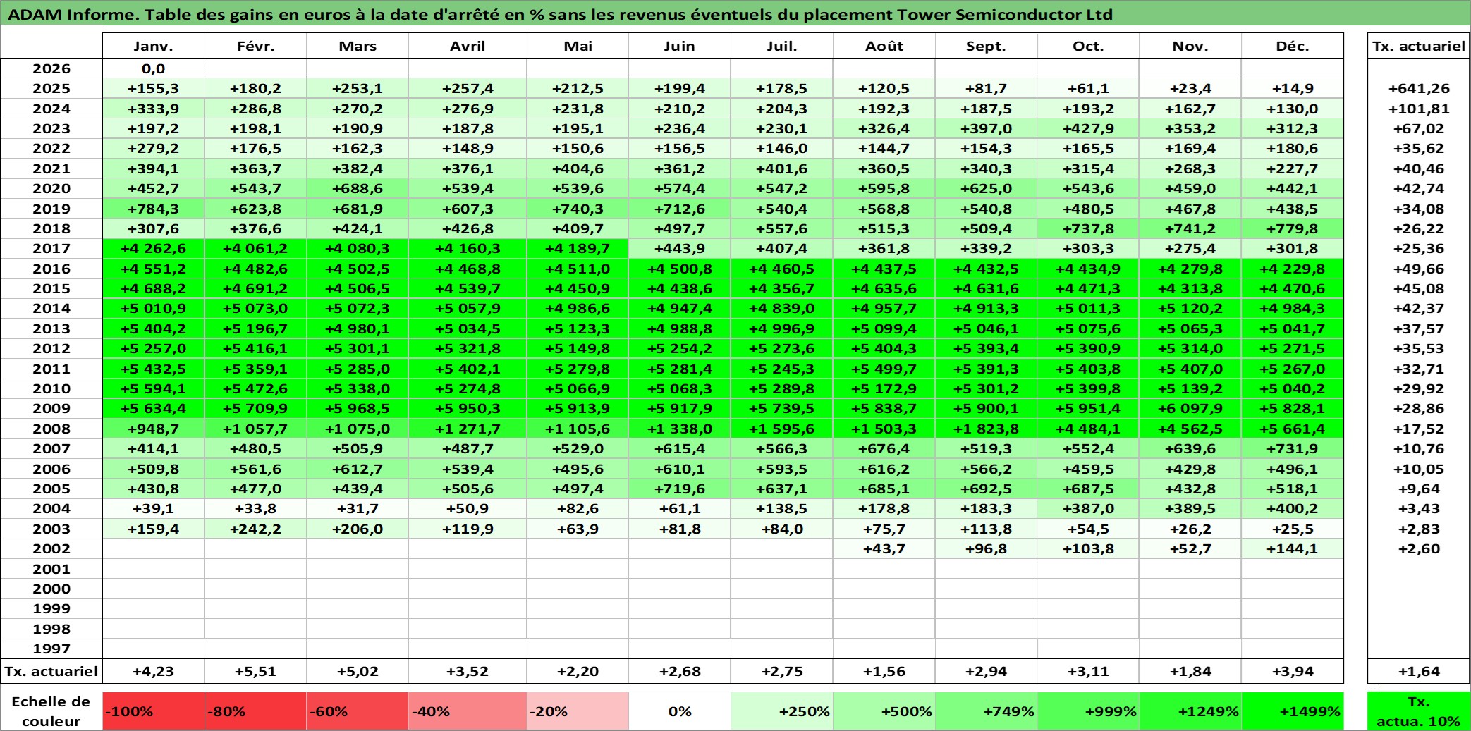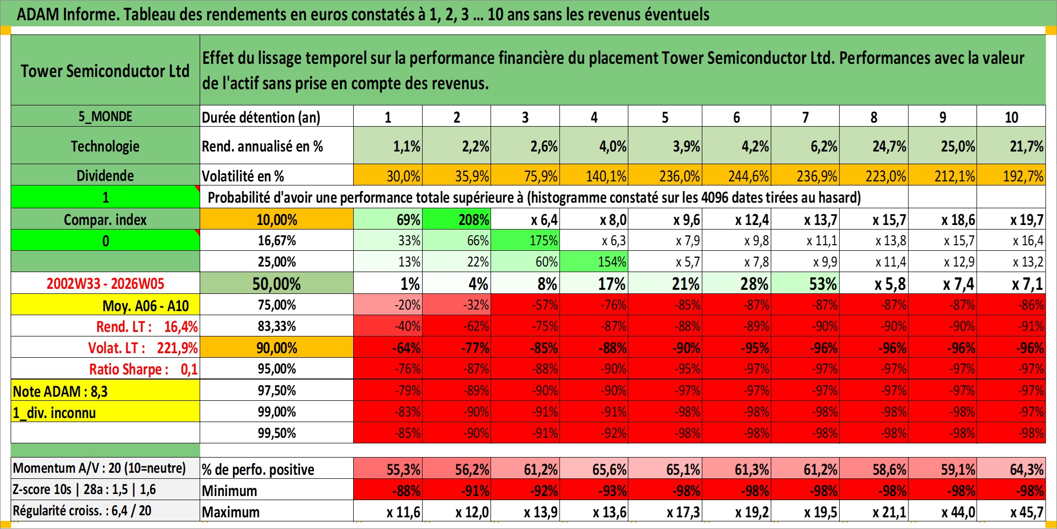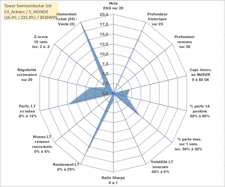 Site dédié aux investisseursPage dédiée sur site financeAnalyse des valorisations hebdomadaires de l'action Tower Semiconductor Ltd. Cet actif est cote en ILA. Les valorisations sont en contrevaleur EURO et couvrent les semaines 2002W33 a 2026W05. Les revenus de cet actif financier ne sont pas connus car non existants ou non disponibles sur le site Yahoo Finance. La note ESG de cet actif n'est pas connue.