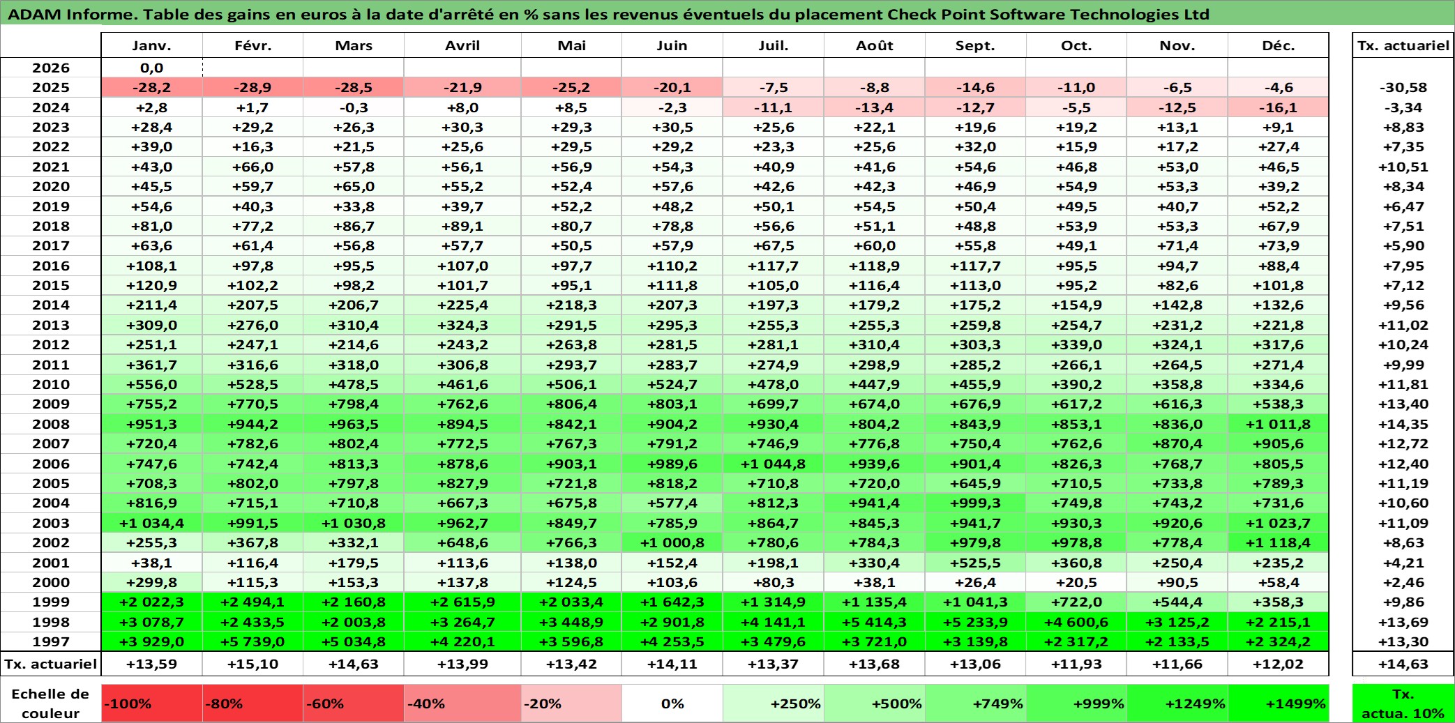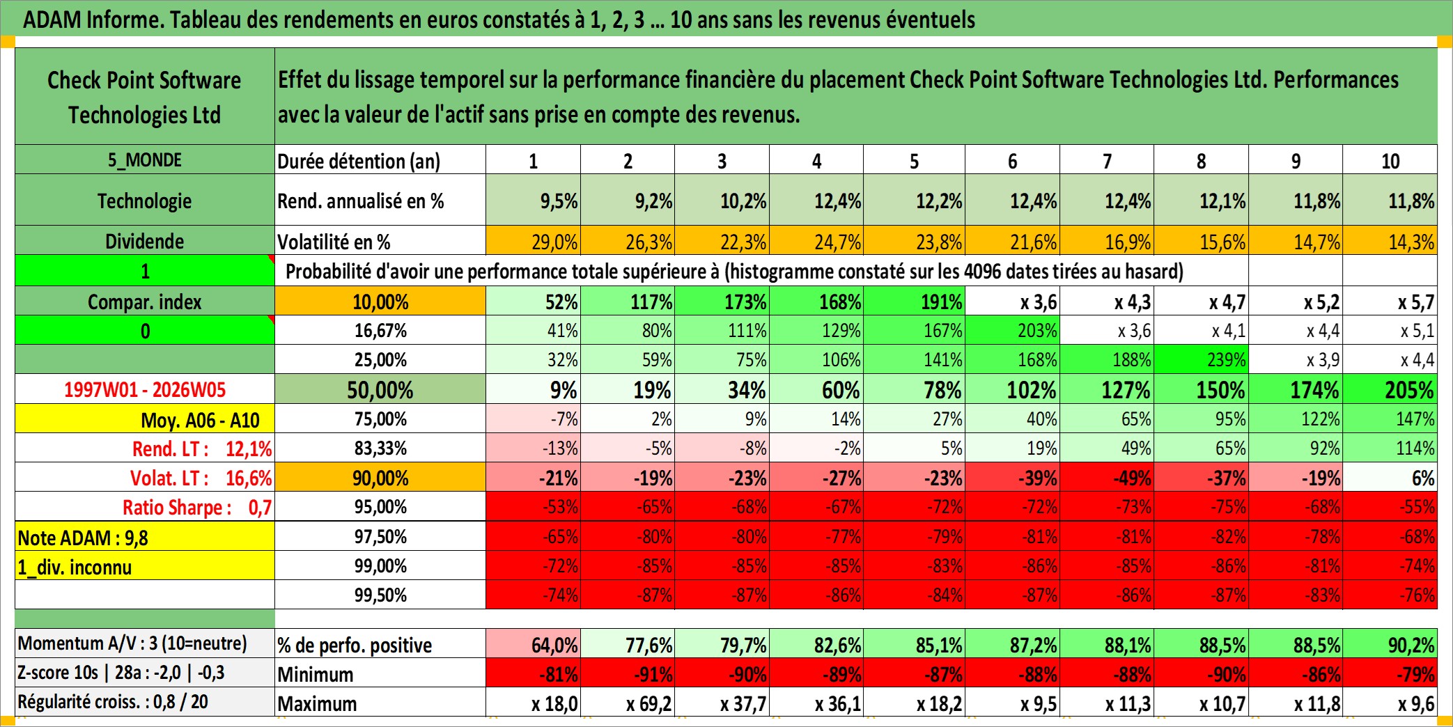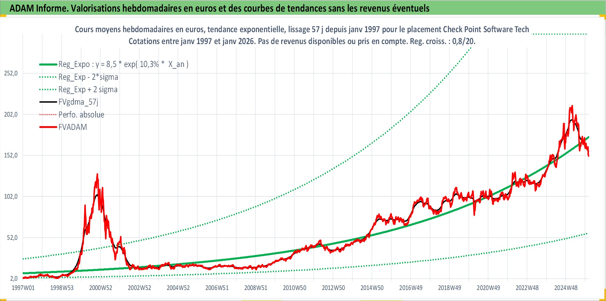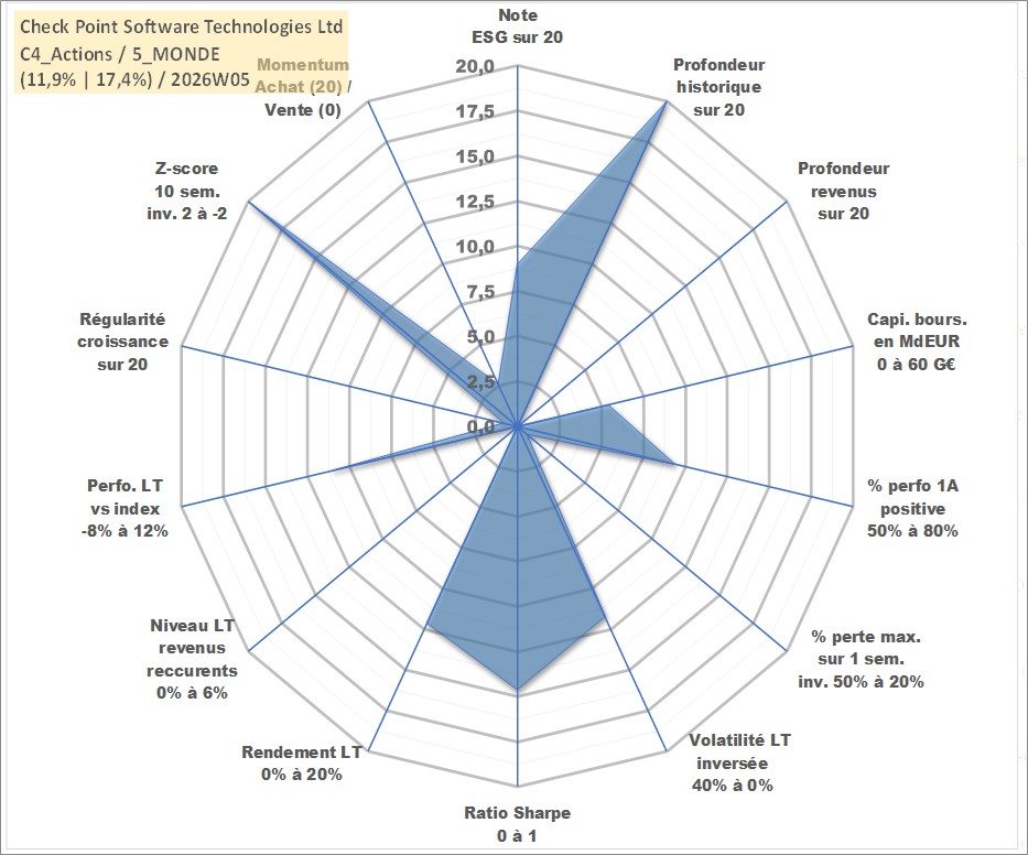 Site dédié aux investisseursPage dédiée sur site financeAnalyse des valorisations hebdomadaires de l'action Check Point Software Technologies Ltd. Cet actif est cote en USD. Les valorisations sont en contrevaleur EURO et couvrent les semaines 1997W01 a 2026W05. Les revenus de cet actif financier ne sont pas connus car non existants ou non disponibles sur le site Yahoo Finance. La note globale ESG de cet actif est estimee a 9.0 (apres rebasage entre 0 et 20).