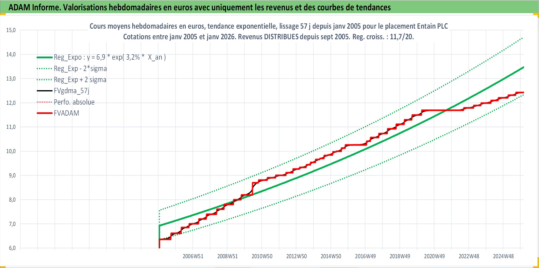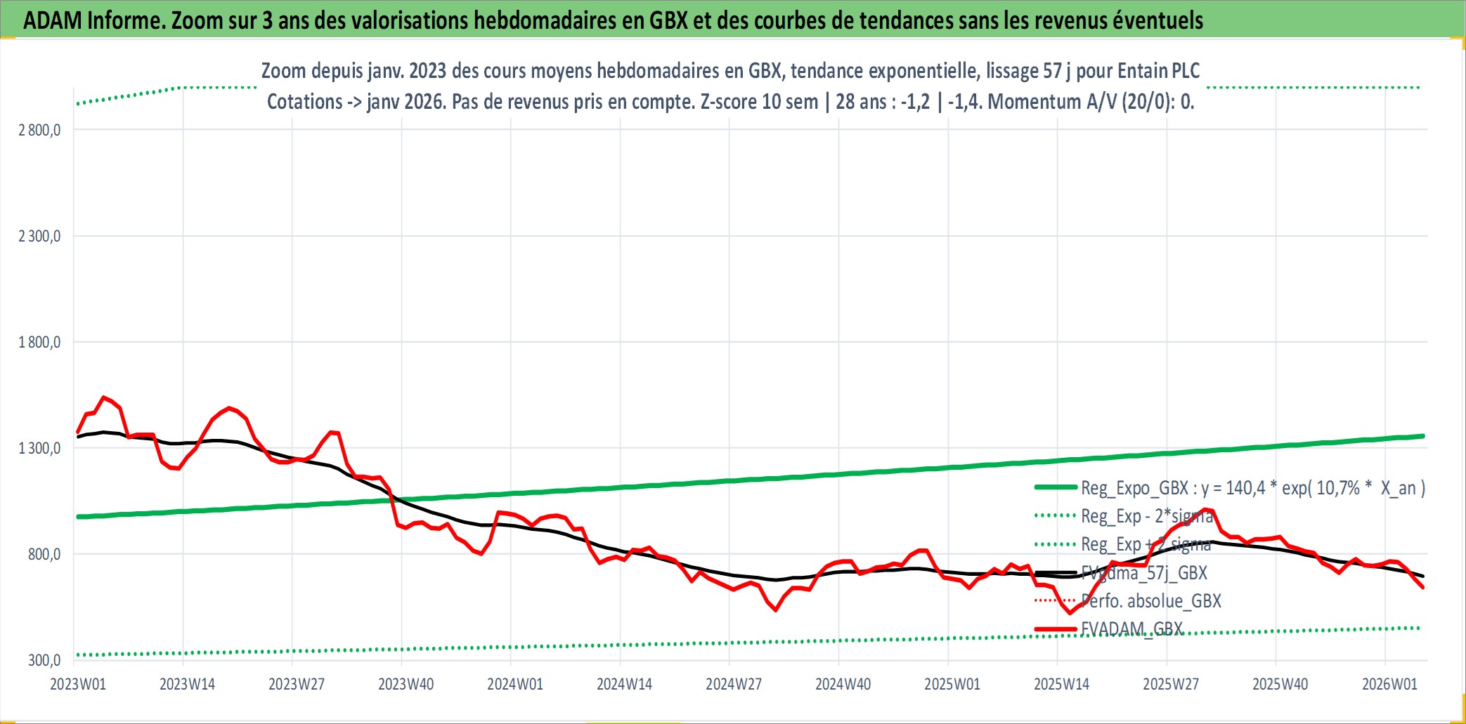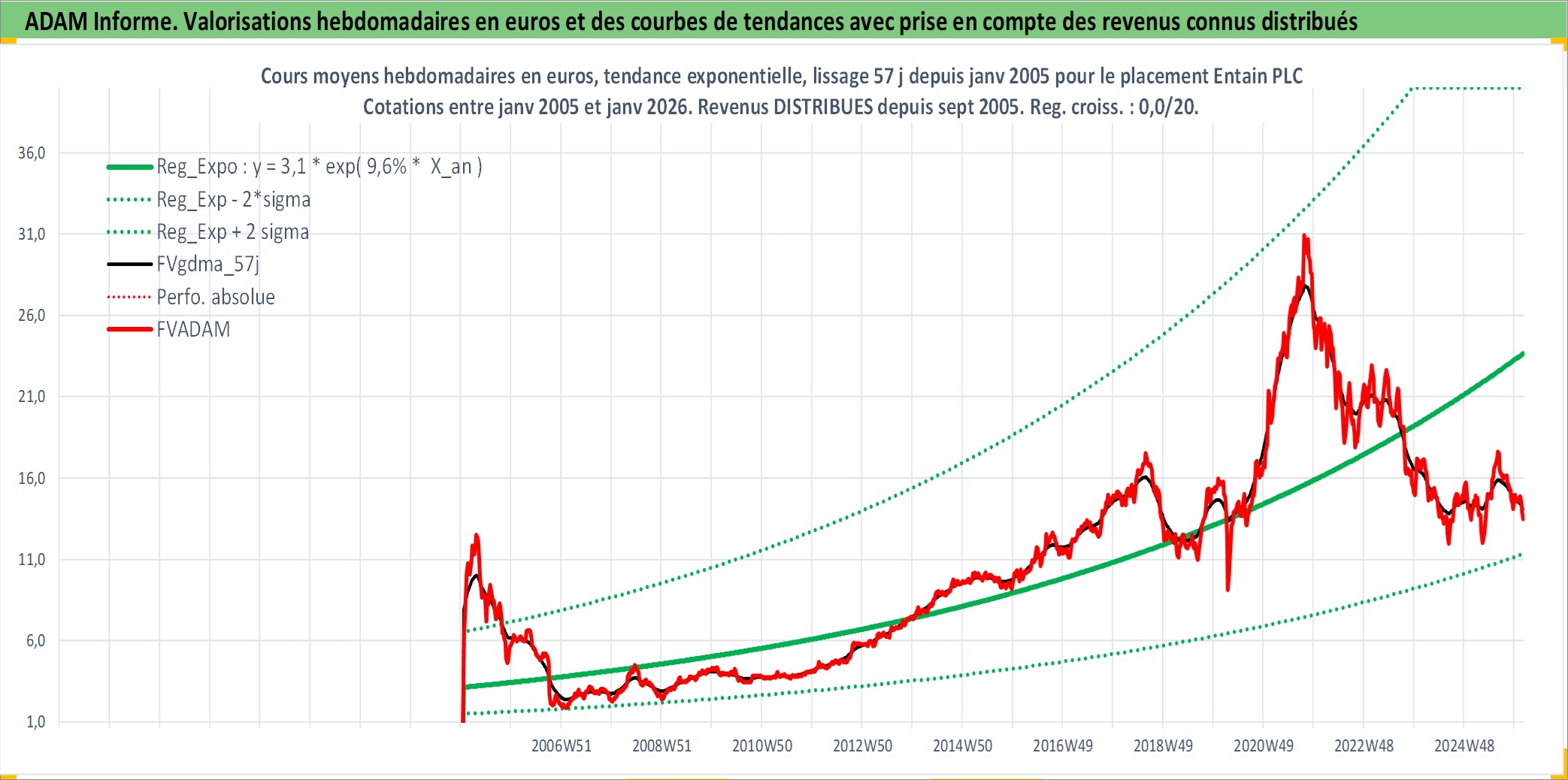 Site dédié aux investisseursPage dédiée sur site financeAnalyse des valorisations hebdomadaires de l'action Entain PLC. Cet actif est cote en GBX. Les valorisations sont en contrevaleur EURO et couvrent les semaines 2005W02 a 2026W05. Les revenus de cet actif financier sont pris en compte depuis la semaine 2005W37. La note ESG de cet actif n'est pas connue.