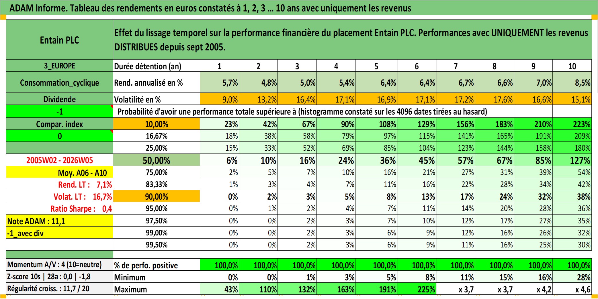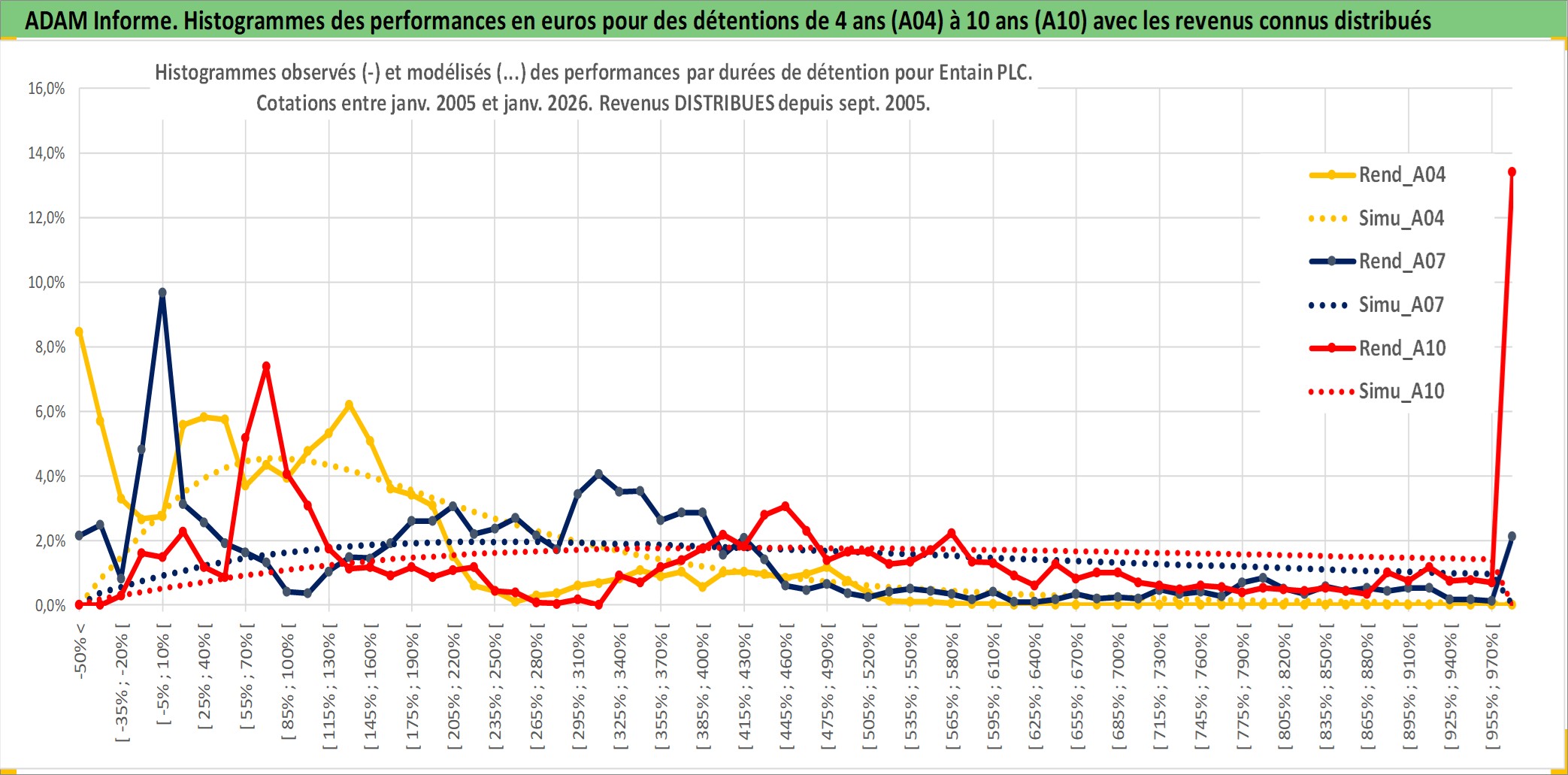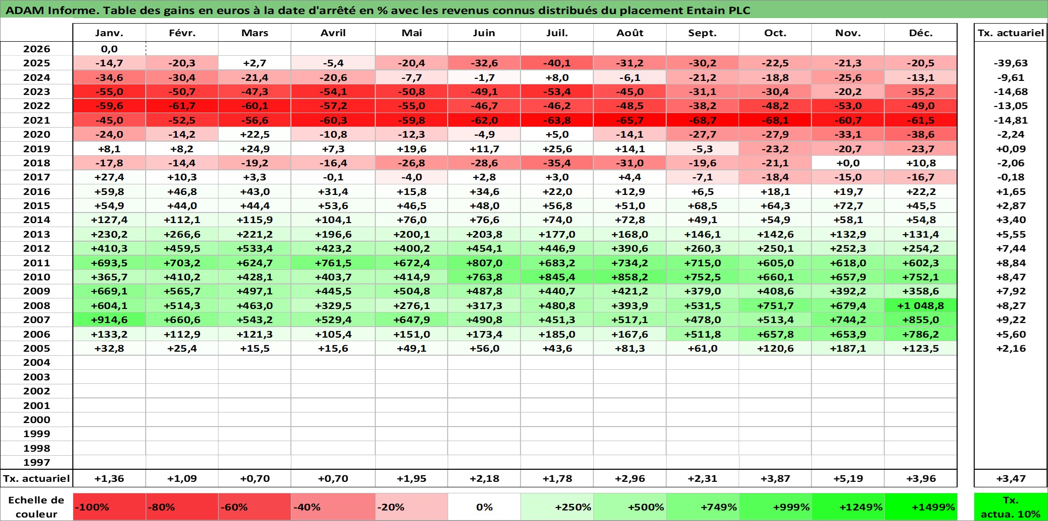 Site dédié aux investisseursPage dédiée sur site financeAnalyse des valorisations hebdomadaires de l'action Entain PLC. Cet actif est cote en GBX. Les valorisations sont en contrevaleur EURO et couvrent les semaines 2005W02 a 2026W05. Les revenus de cet actif financier sont pris en compte depuis la semaine 2005W37. La note ESG de cet actif n'est pas connue.