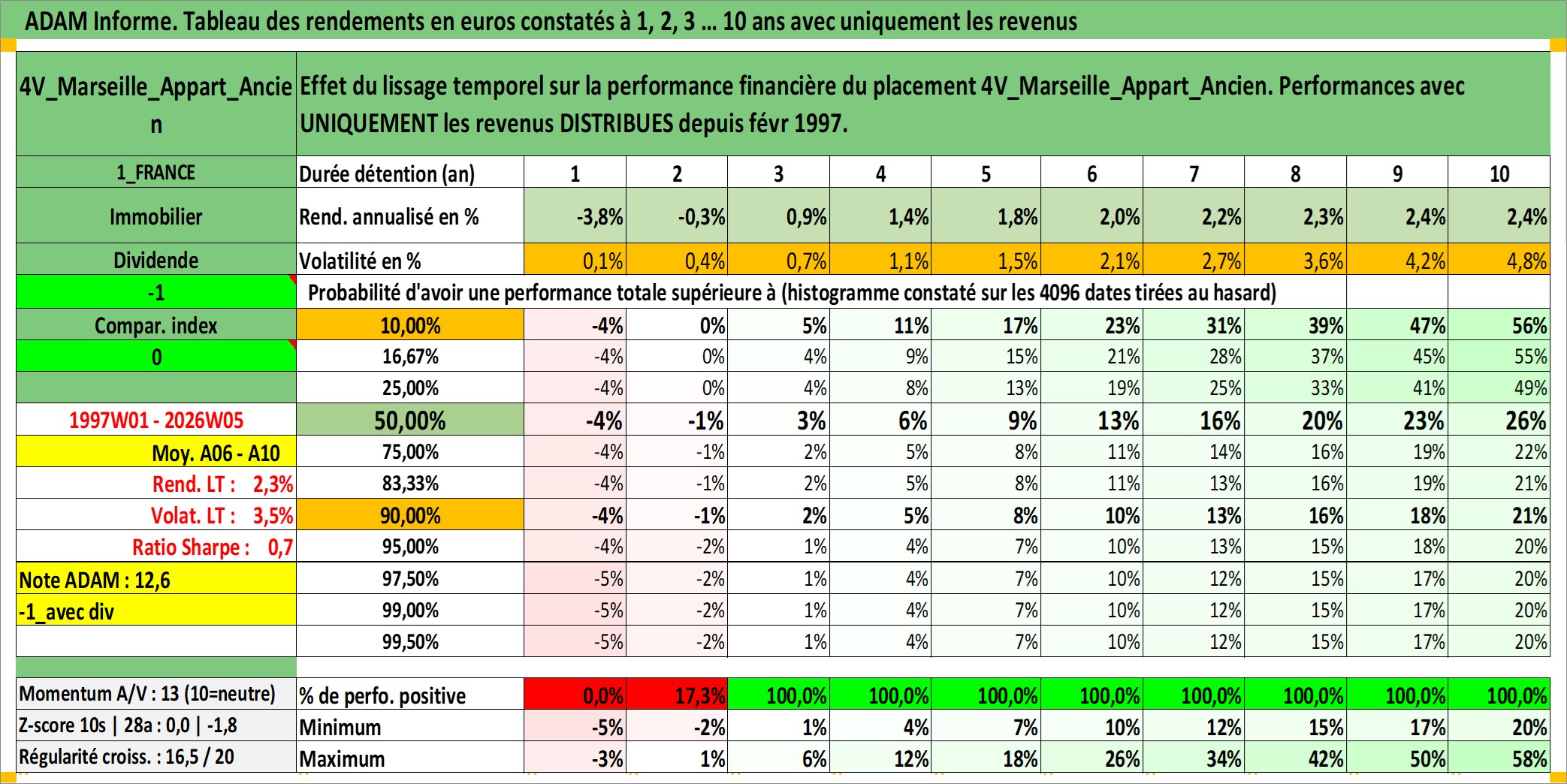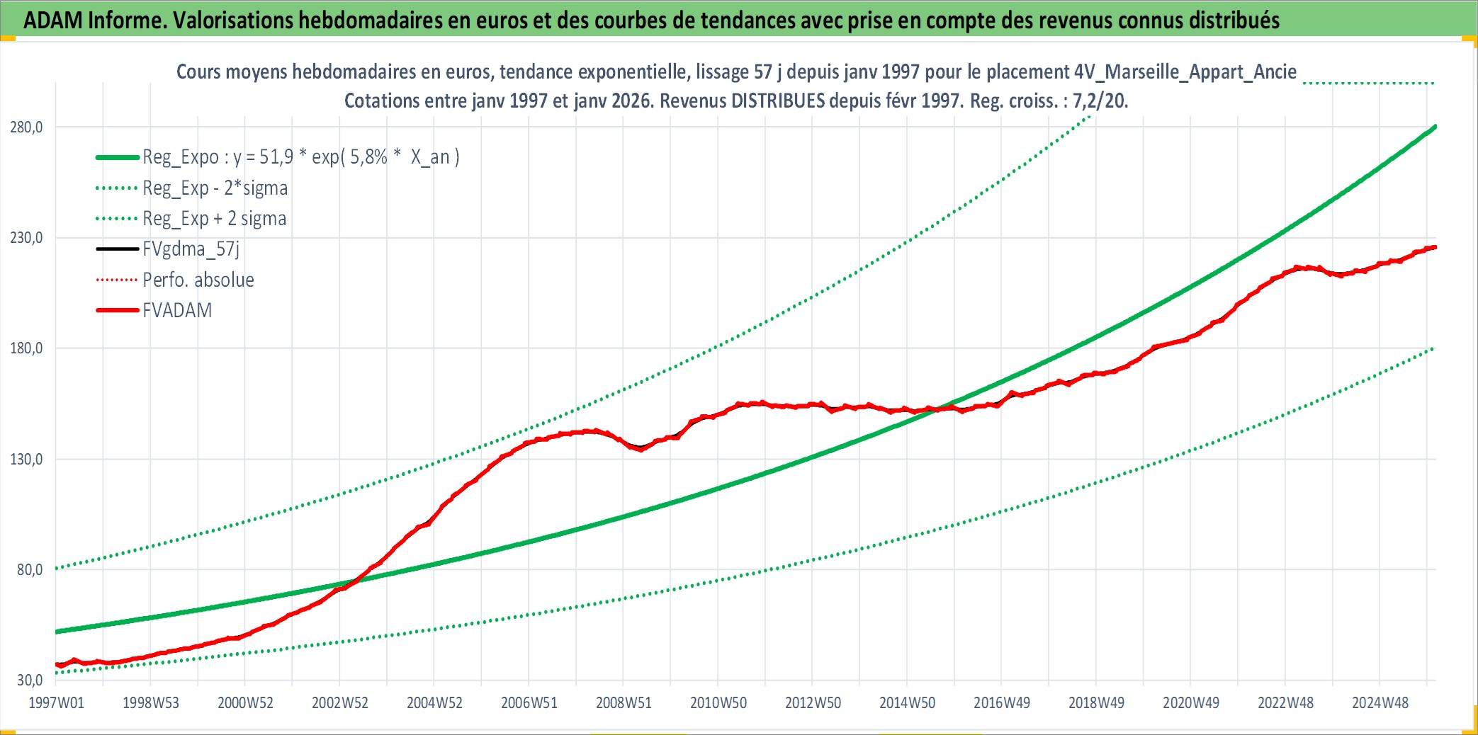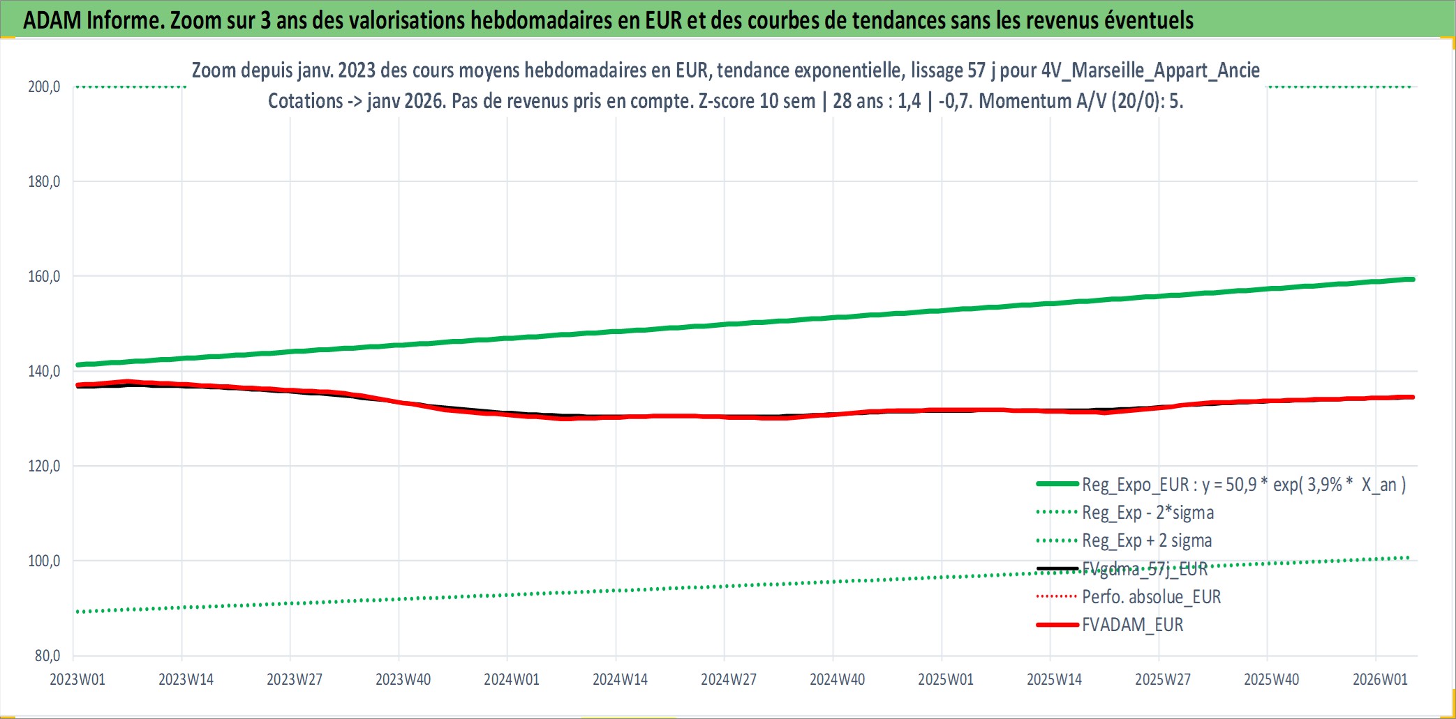 Site dédié aux investisseursPage dédiée sur site financeAnalyse des valorisations hebdomadaires de l'actif 4V_Marseille_Appart_Ancien. Cet actif est cote en EUR. Les valorisations couvrent les semaines 1997W01 a 2026W05. Les loyers de cet actif immobilier sont pris egaux a 3,33% annuels de la valeur venale du logement.