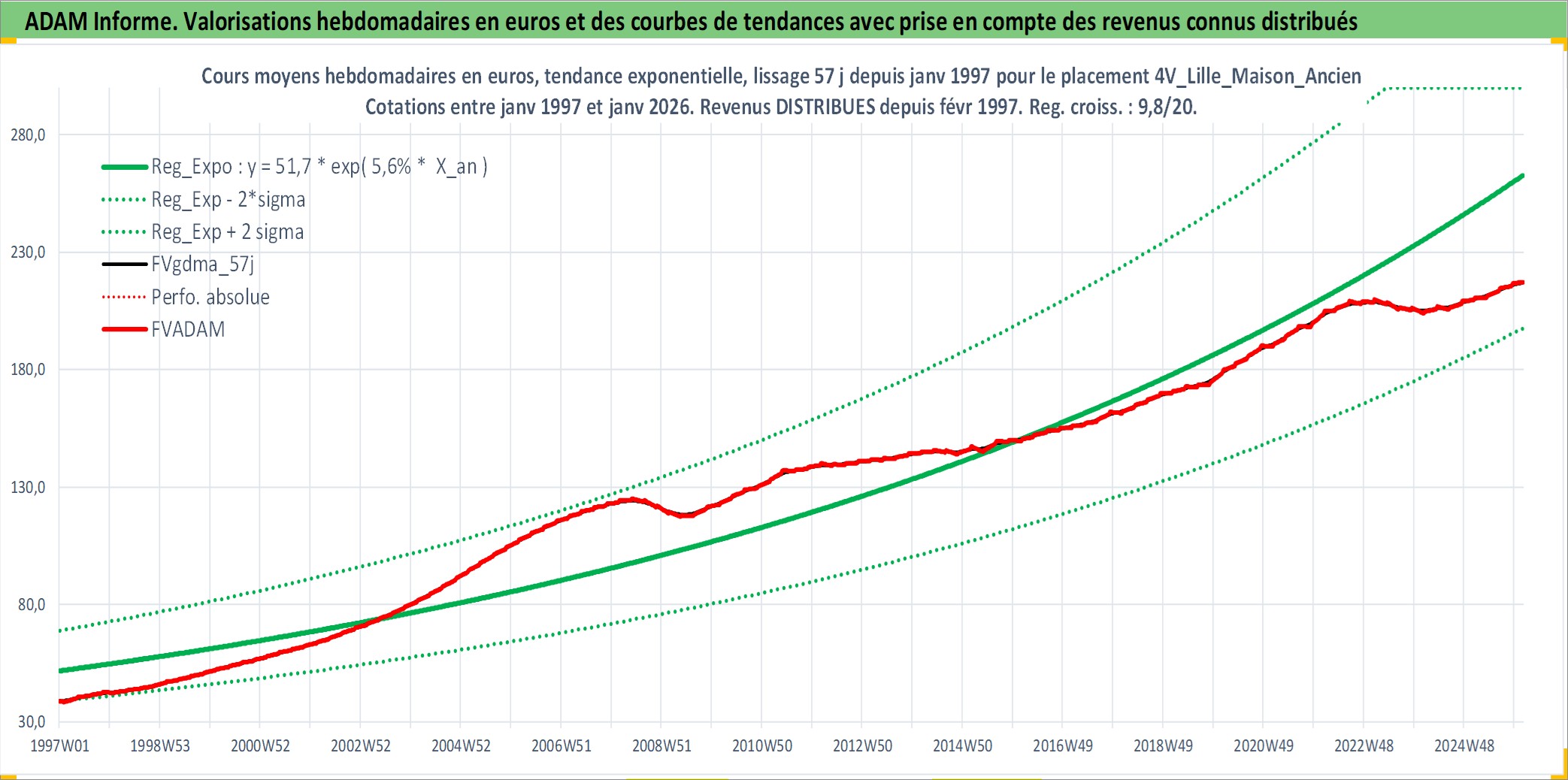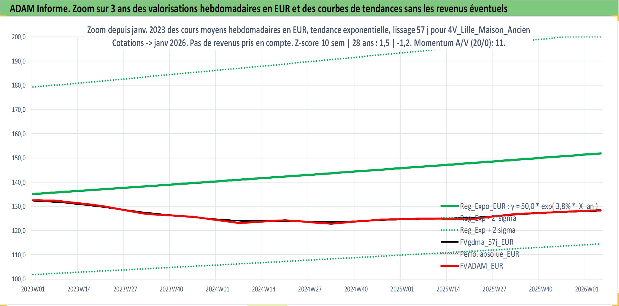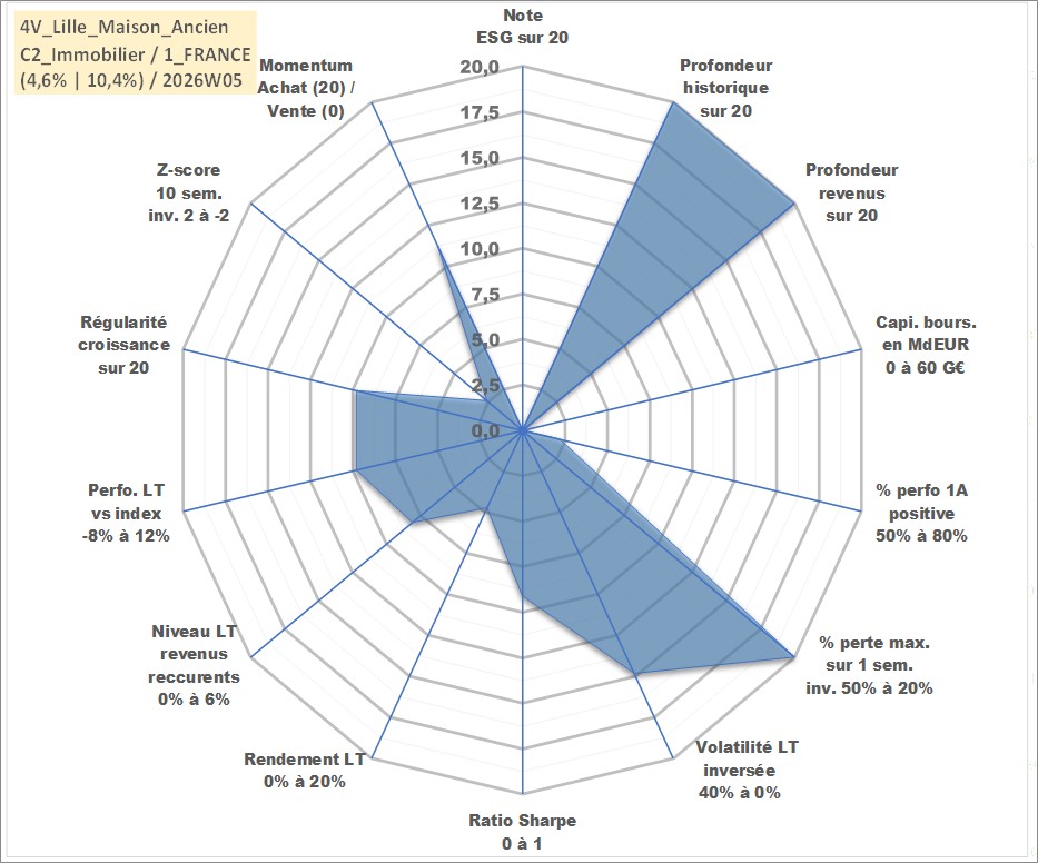 Site dédié aux investisseursPage dédiée sur site financeAnalyse des valorisations hebdomadaires de l'actif 4V_Lille_Maison_Ancien. Cet actif est cote en EUR. Les valorisations couvrent les semaines 1997W01 a 2026W05. Les loyers de cet actif immobilier sont pris egaux a 3,33% annuels de la valeur venale du logement.