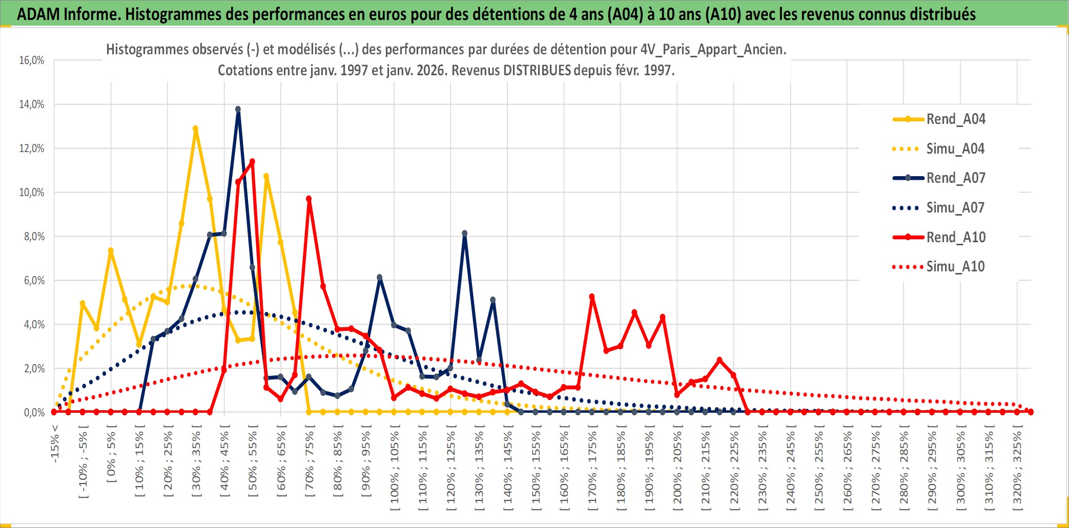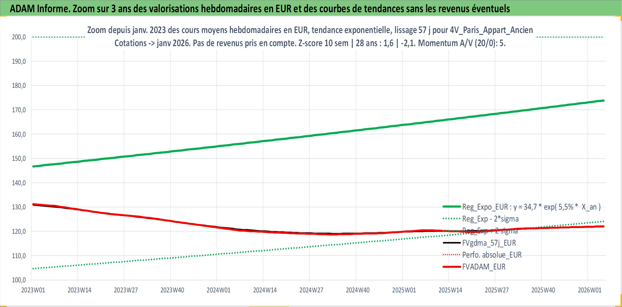 Site dédié aux investisseursPage dédiée sur site financeAnalyse des valorisations hebdomadaires de l'actif 4V_Paris_Appart_Ancien. Cet actif est cote en EUR. Les valorisations couvrent les semaines 1997W01 a 2026W05. Les loyers de cet actif immobilier sont pris egaux a 3,33% annuels de la valeur venale du logement.