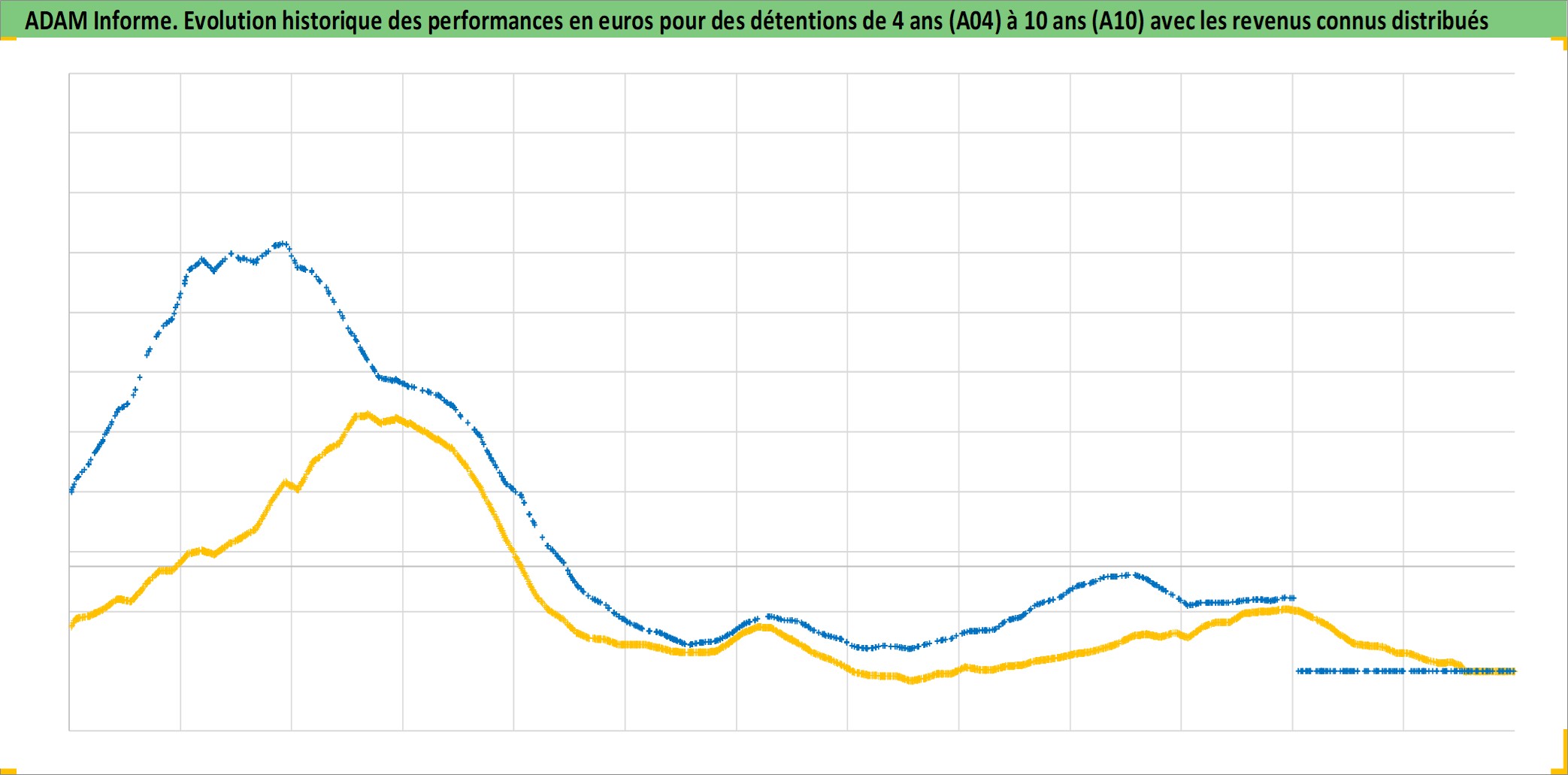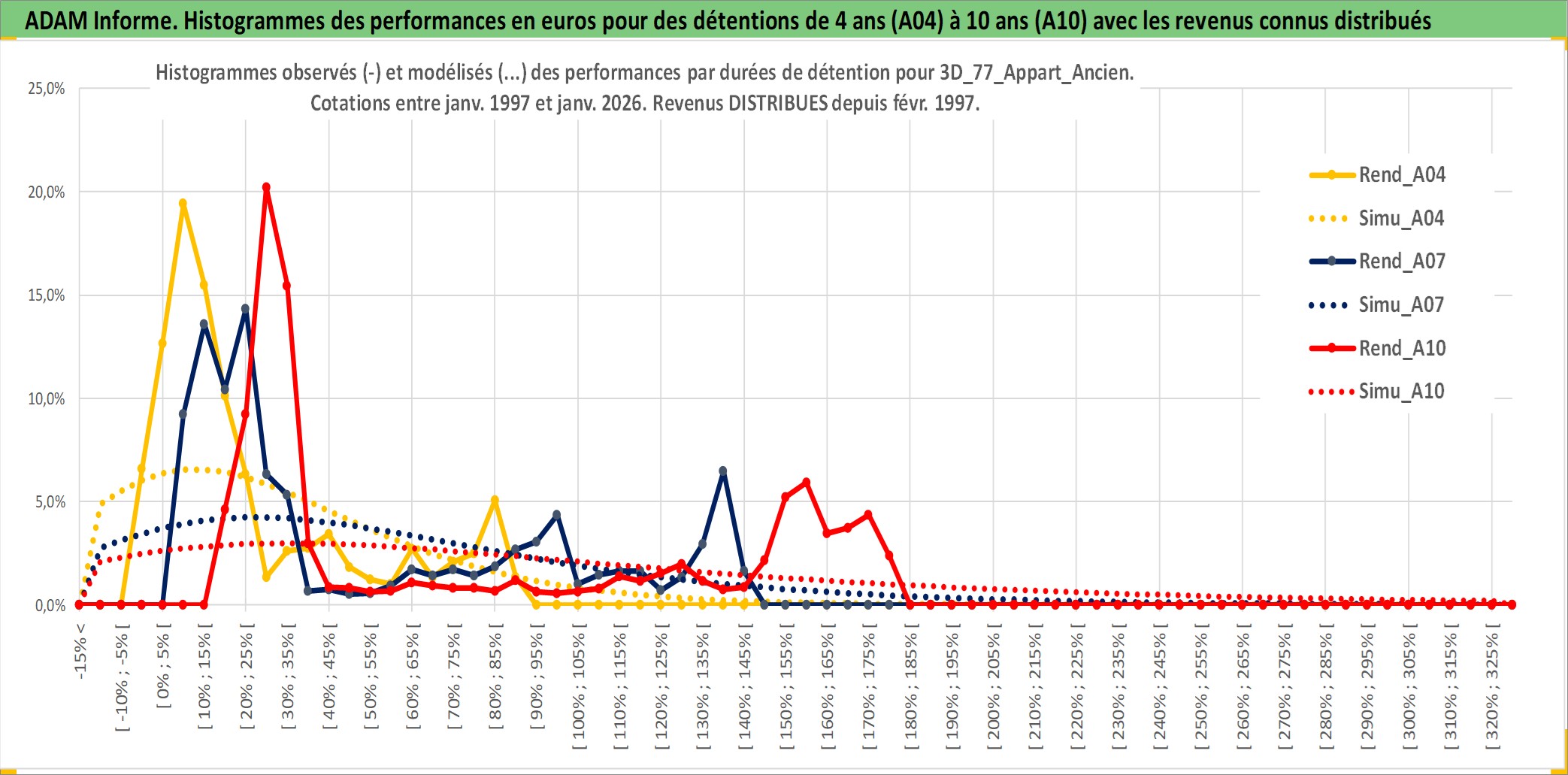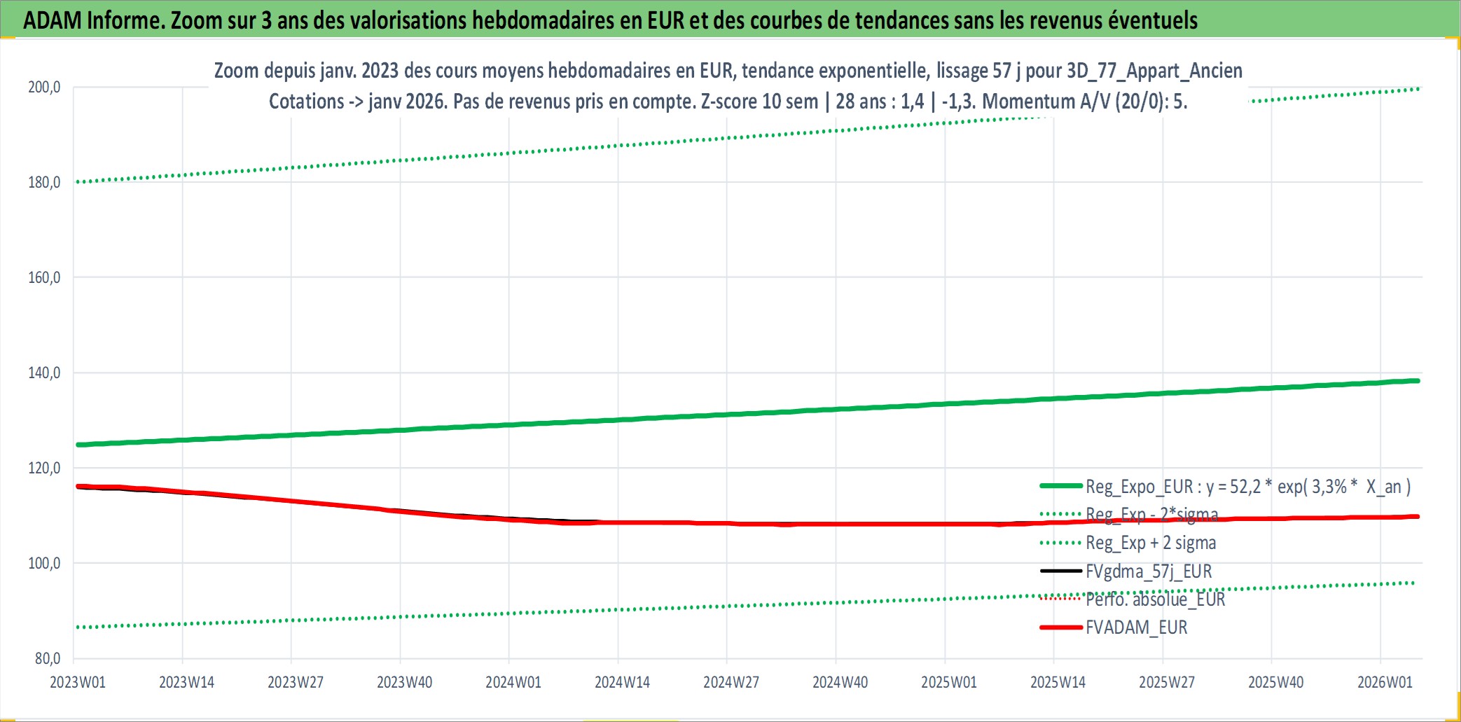 Site dédié aux investisseursPage dédiée sur site financeAnalyse des valorisations hebdomadaires de l'actif 3D_77_Appart_Ancien. Cet actif est cote en EUR. Les valorisations couvrent les semaines 1997W01 a 2026W05. Les loyers de cet actif immobilier sont pris egaux a 3,33% annuels de la valeur venale du logement.