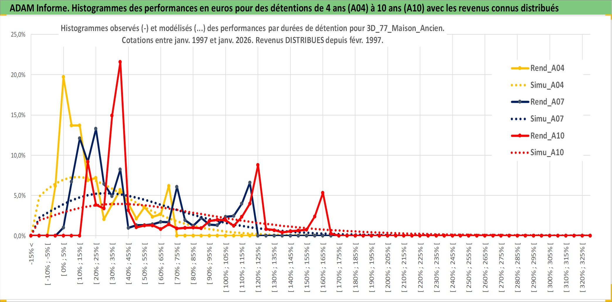 Site dédié aux investisseursPage dédiée sur site financeAnalyse des valorisations hebdomadaires de l'actif 3D_77_Maison_Ancien. Cet actif est cote en EUR. Les valorisations couvrent les semaines 1997W01 a 2026W05. Les loyers de cet actif immobilier sont pris egaux a 3,33% annuels de la valeur venale du logement.