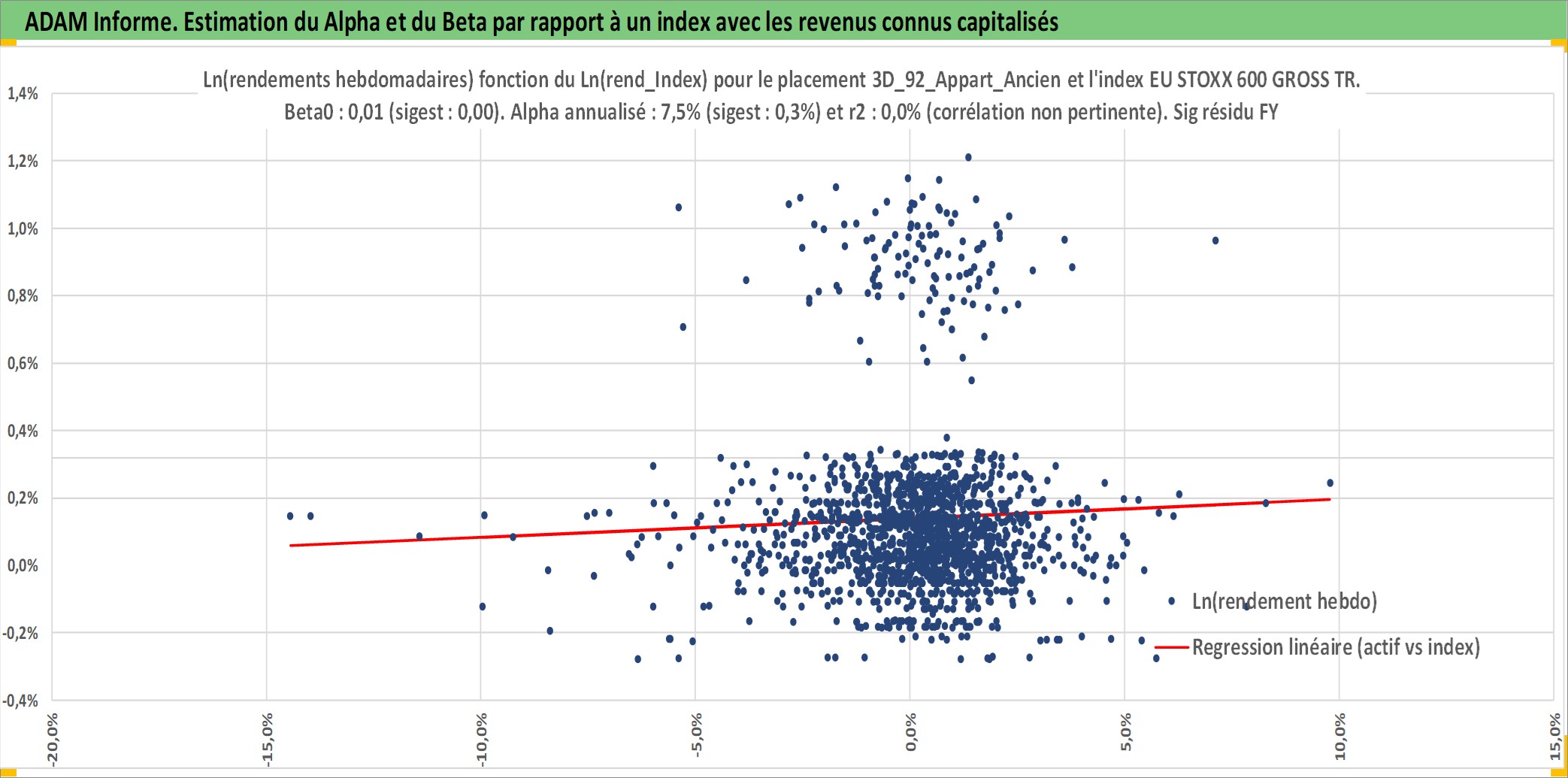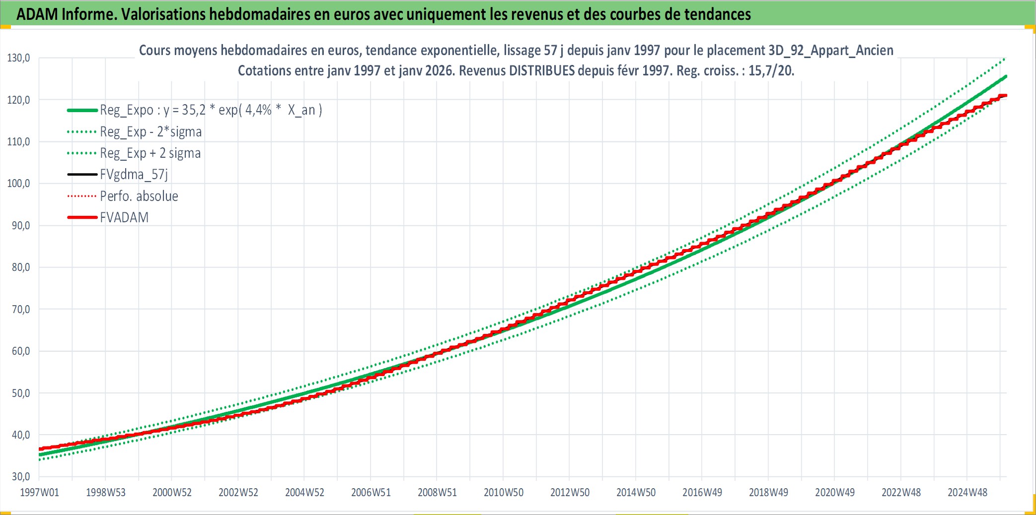 Site dédié aux investisseursPage dédiée sur site financeAnalyse des valorisations hebdomadaires de l'actif 3D_92_Appart_Ancien. Cet actif est cote en EUR. Les valorisations couvrent les semaines 1997W01 a 2026W05. Les loyers de cet actif immobilier sont pris egaux a 3,33% annuels de la valeur venale du logement.