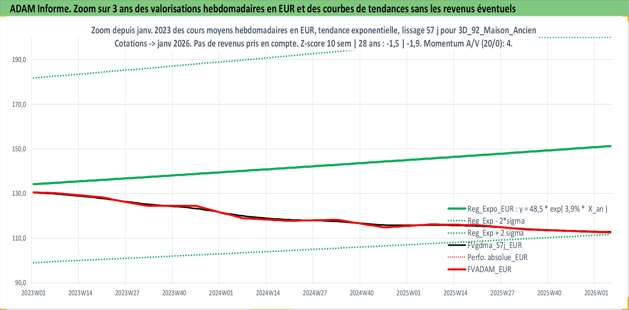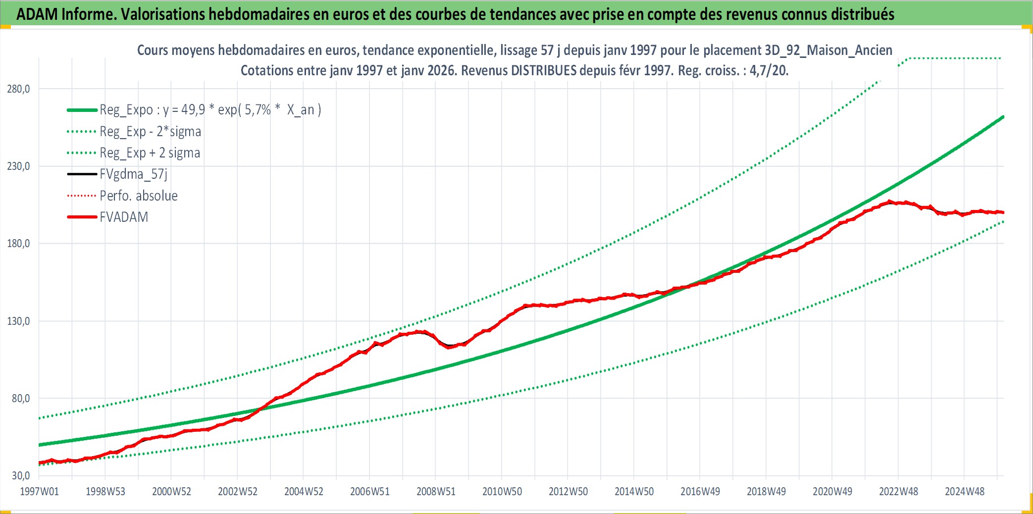 Site dédié aux investisseursPage dédiée sur site financeAnalyse des valorisations hebdomadaires de l'actif 3D_92_Maison_Ancien. Cet actif est cote en EUR. Les valorisations couvrent les semaines 1997W01 a 2026W05. Les loyers de cet actif immobilier sont pris egaux a 3,33% annuels de la valeur venale du logement.
