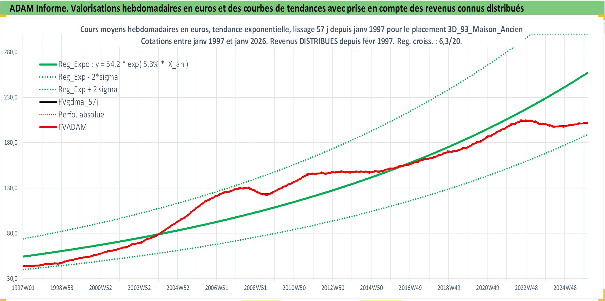 Site dédié aux investisseursPage dédiée sur site financeAnalyse des valorisations hebdomadaires de l'actif 3D_93_Maison_Ancien. Cet actif est cote en EUR. Les valorisations couvrent les semaines 1997W01 a 2026W05. Les loyers de cet actif immobilier sont pris egaux a 3,33% annuels de la valeur venale du logement.