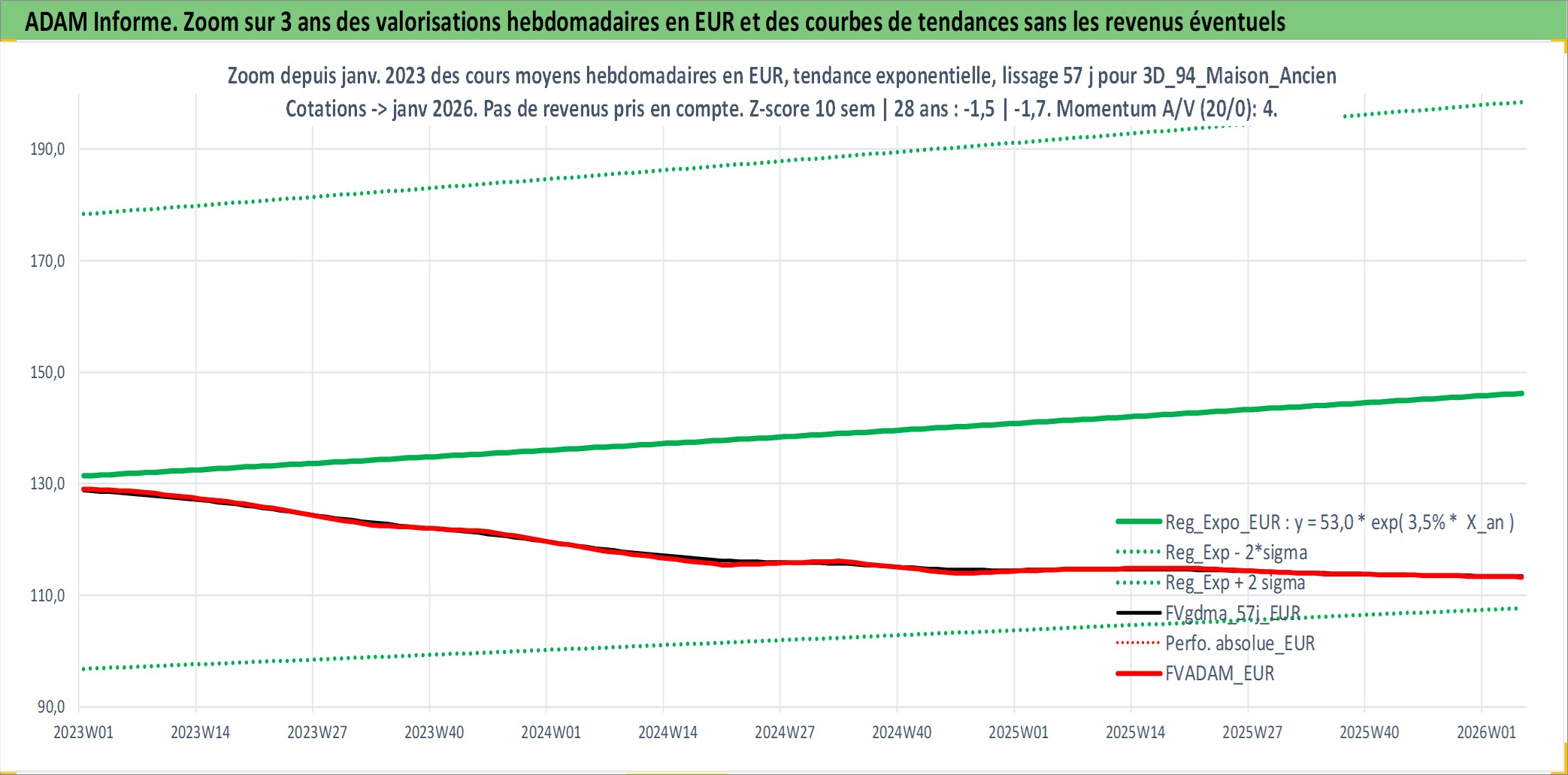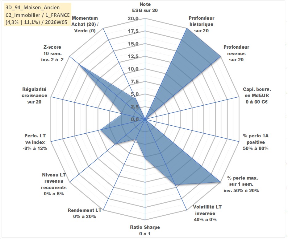 Site dédié aux investisseursPage dédiée sur site financeAnalyse des valorisations hebdomadaires de l'actif 3D_94_Maison_Ancien. Cet actif est cote en EUR. Les valorisations couvrent les semaines 1997W01 a 2026W05. Les loyers de cet actif immobilier sont pris egaux a 3,33% annuels de la valeur venale du logement.