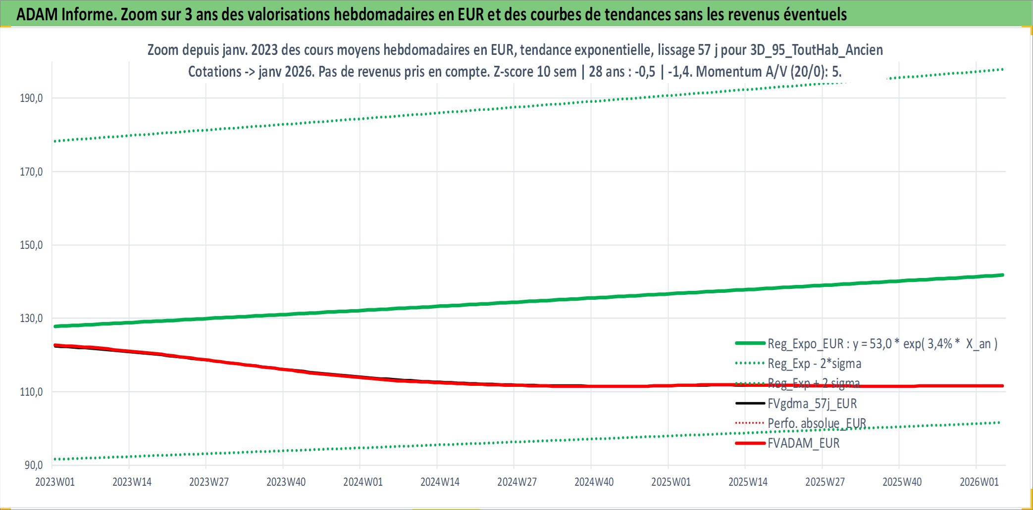 Site dédié aux investisseursPage dédiée sur site financeAnalyse des valorisations hebdomadaires de l'actif 3D_95_ToutHab_Ancien. Cet actif est cote en EUR. Les valorisations couvrent les semaines 1997W01 a 2026W05. Les loyers de cet actif immobilier sont pris egaux a 3,33% annuels de la valeur venale du logement.