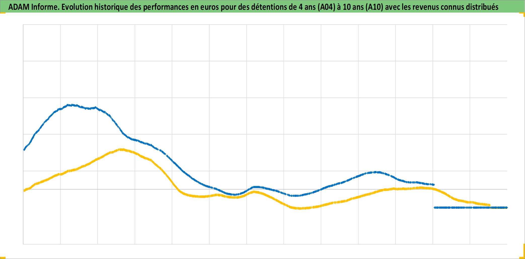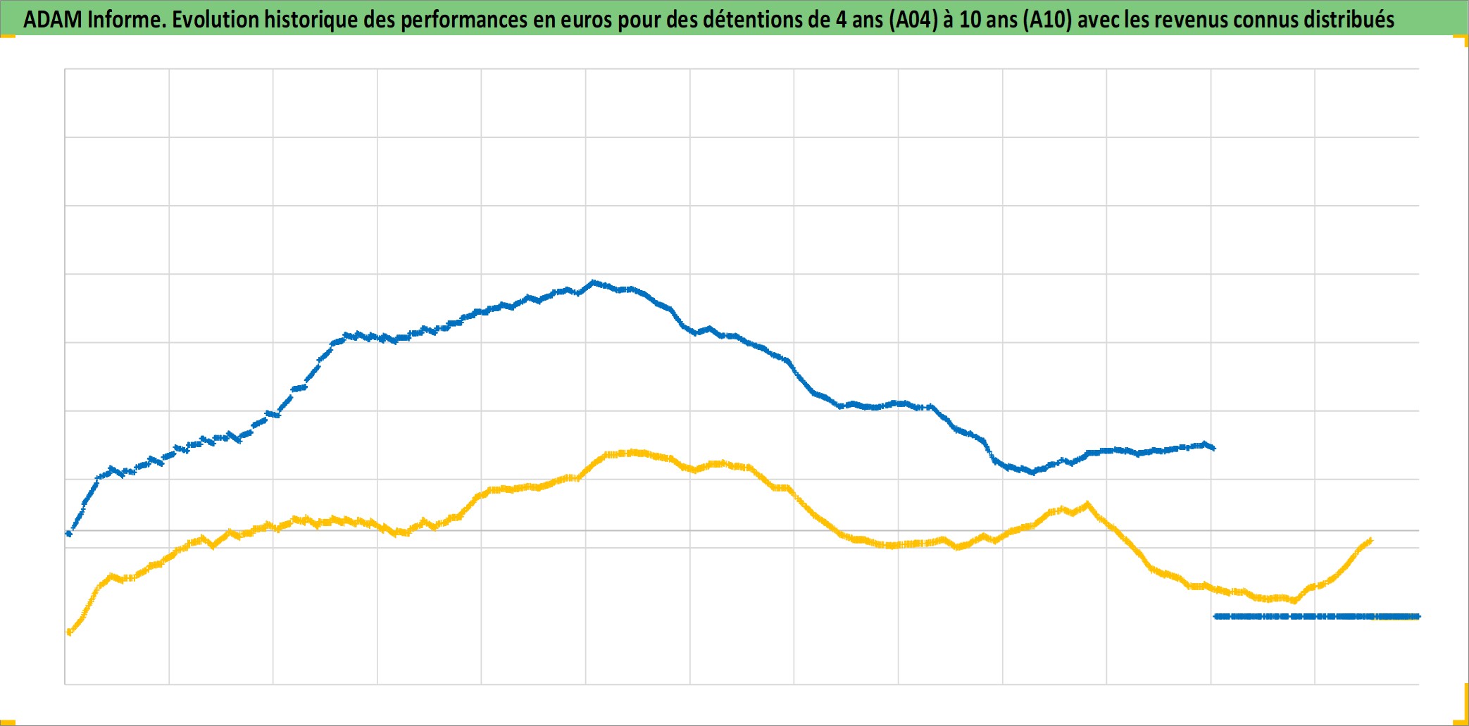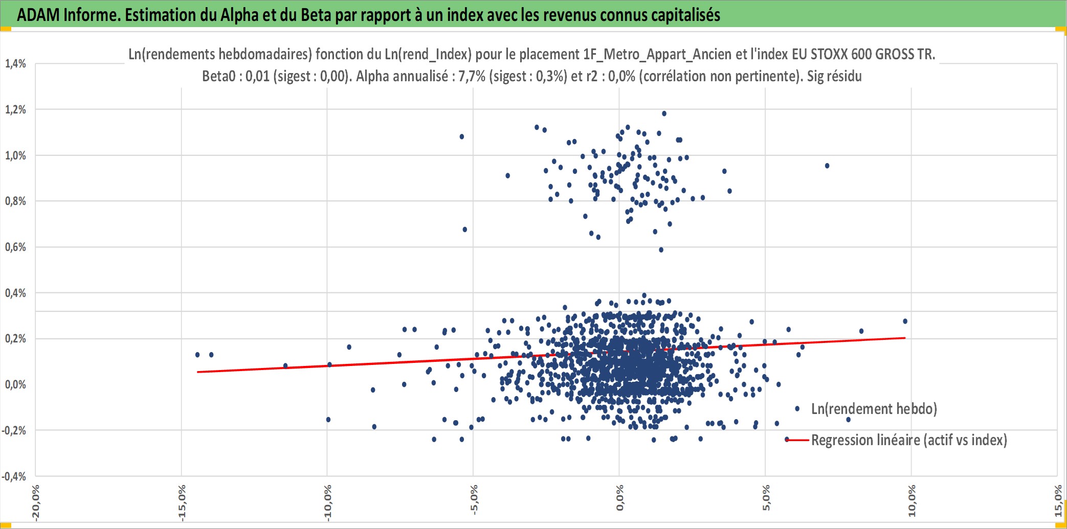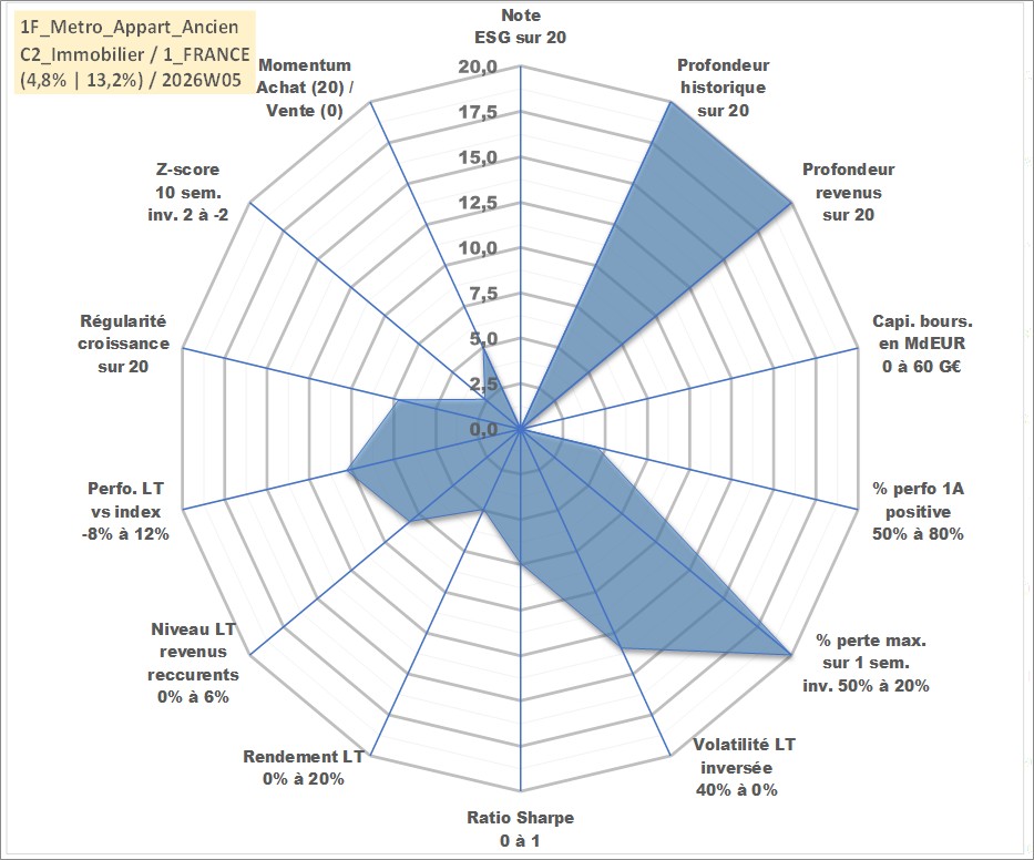 Site dédié aux investisseursPage dédiée sur site financeAnalyse des valorisations hebdomadaires de l'actif 1F_Metro_Appart_Ancien. Cet actif est cote en EUR. Les valorisations couvrent les semaines 1997W01 a 2026W05. Les loyers de cet actif immobilier sont pris egaux a 3,33% annuels de la valeur venale du logement.