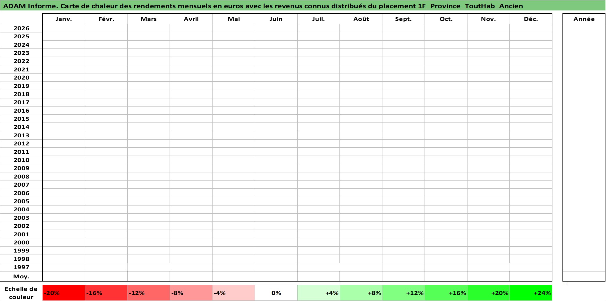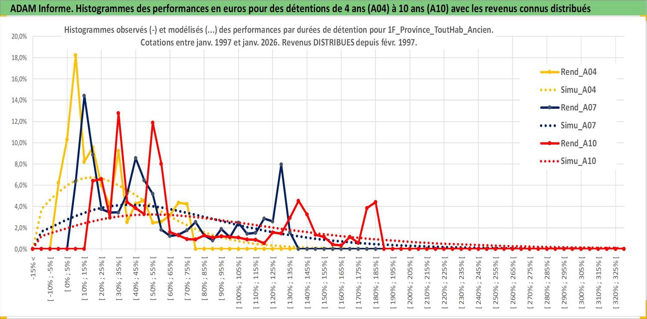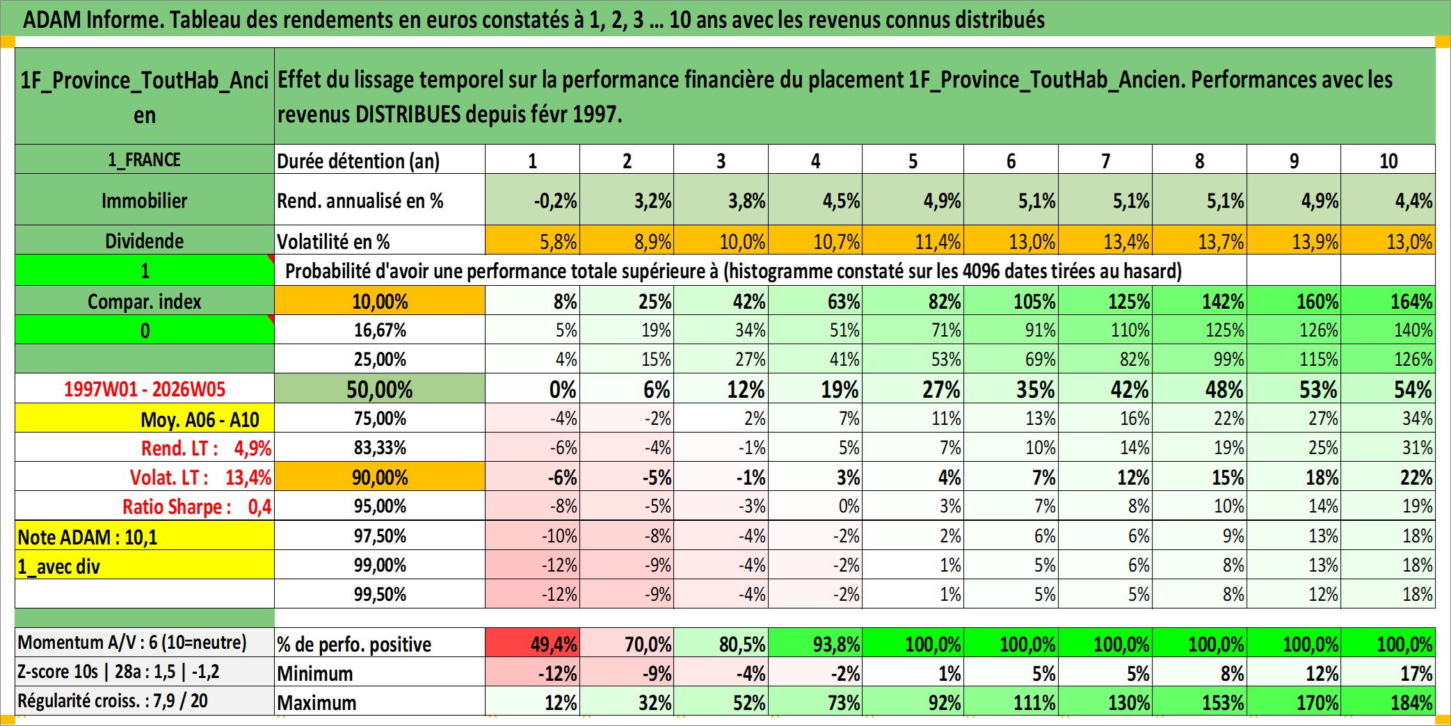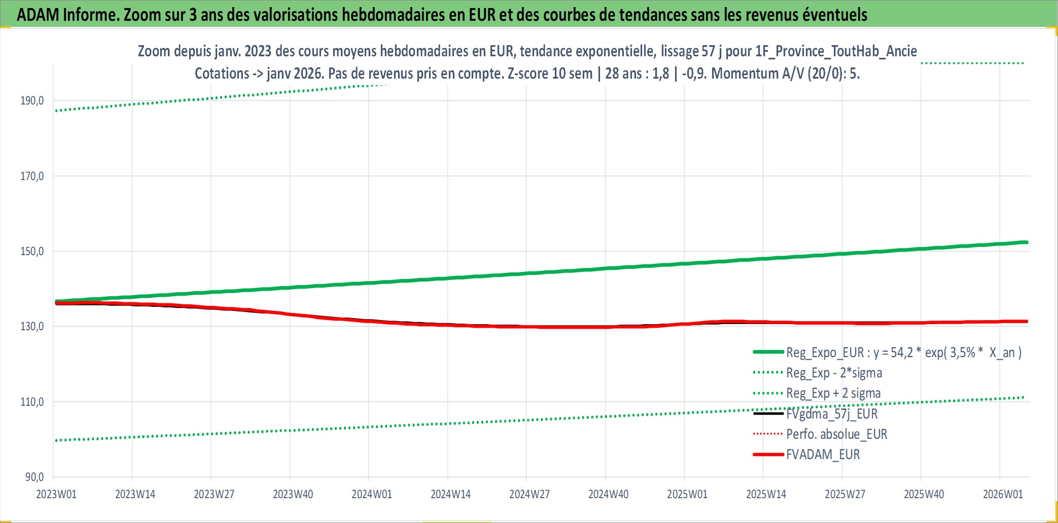 Site dédié aux investisseursPage dédiée sur site financeAnalyse des valorisations hebdomadaires de l'actif 1F_Province_ToutHab_Ancien. Cet actif est cote en EUR. Les valorisations couvrent les semaines 1997W01 a 2026W05. Les loyers de cet actif immobilier sont pris egaux a 3,33% annuels de la valeur venale du logement.