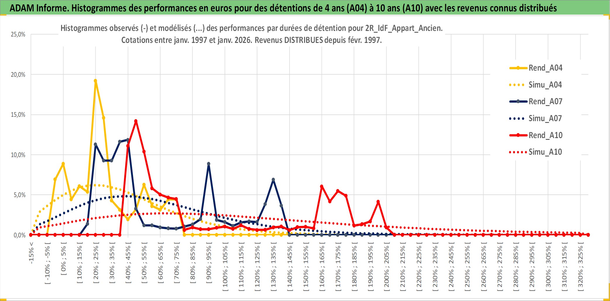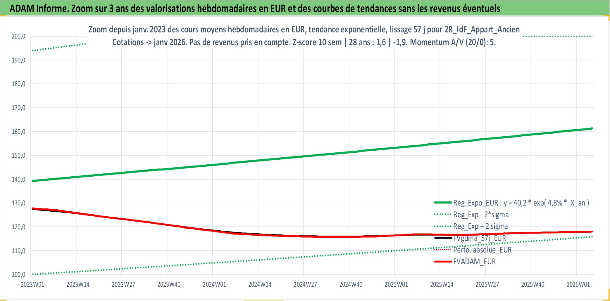 Site dédié aux investisseursPage dédiée sur site financeAnalyse des valorisations hebdomadaires de l'actif 2R_IdF_Appart_Ancien. Cet actif est cote en EUR. Les valorisations couvrent les semaines 1997W01 a 2026W05. Les loyers de cet actif immobilier sont pris egaux a 3,33% annuels de la valeur venale du logement.