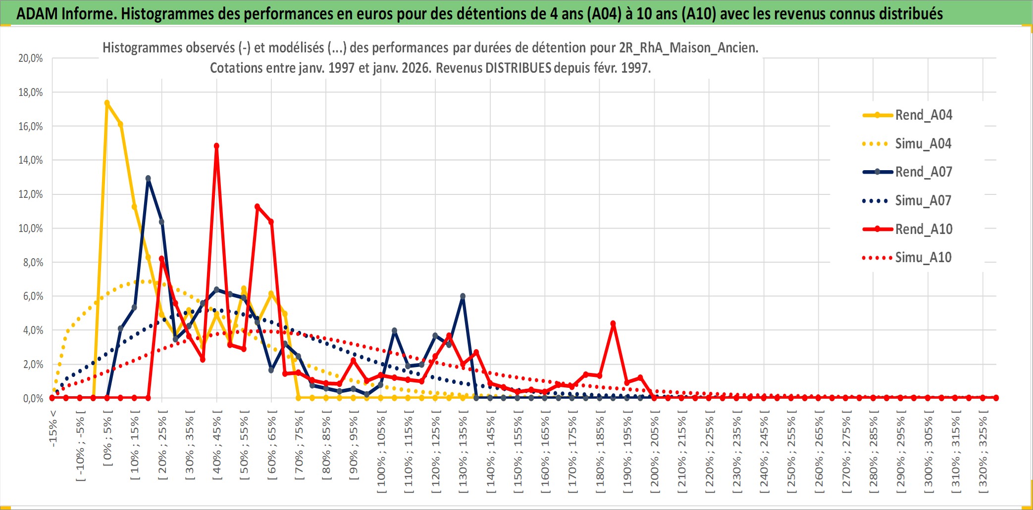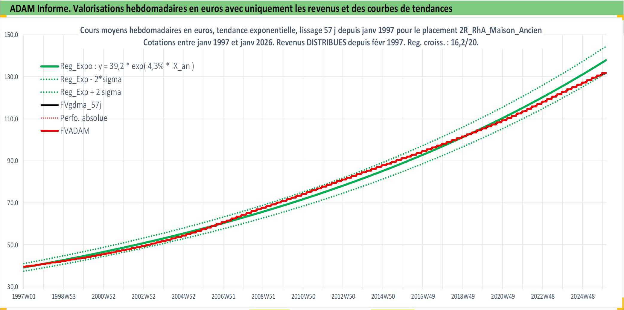 Site dédié aux investisseursPage dédiée sur site financeAnalyse des valorisations hebdomadaires de l'actif 2R_RhA_Maison_Ancien. Cet actif est cote en EUR. Les valorisations couvrent les semaines 1997W01 a 2026W05. Les loyers de cet actif immobilier sont pris egaux a 3,33% annuels de la valeur venale du logement.