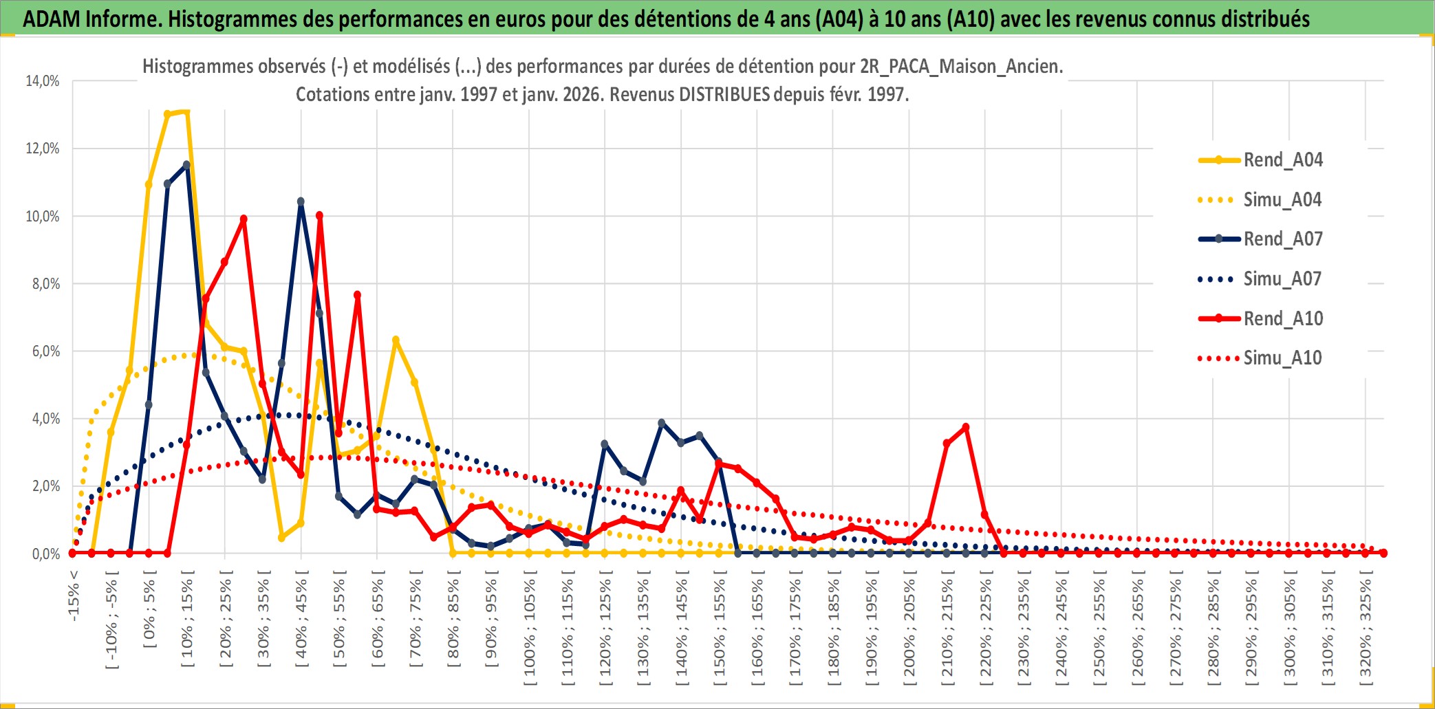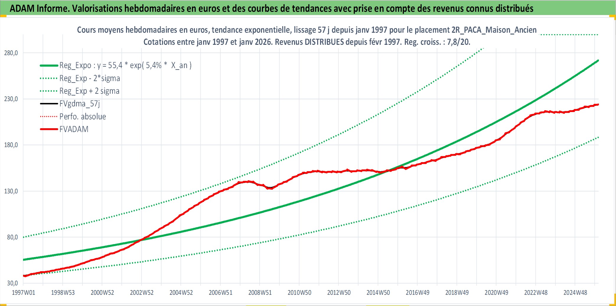 Site dédié aux investisseursPage dédiée sur site financeAnalyse des valorisations hebdomadaires de l'actif 2R_PACA_Maison_Ancien. Cet actif est cote en EUR. Les valorisations couvrent les semaines 1997W01 a 2026W05. Les loyers de cet actif immobilier sont pris egaux a 3,33% annuels de la valeur venale du logement.