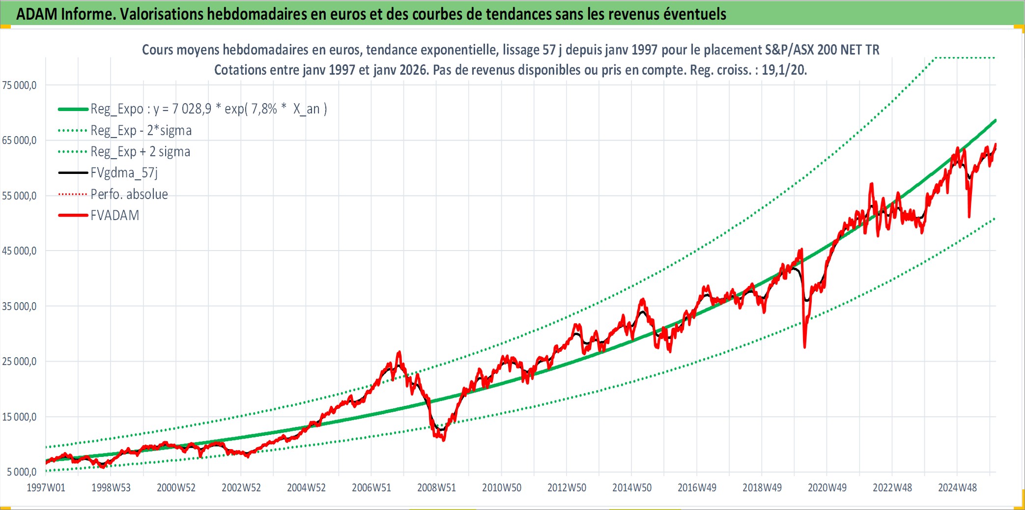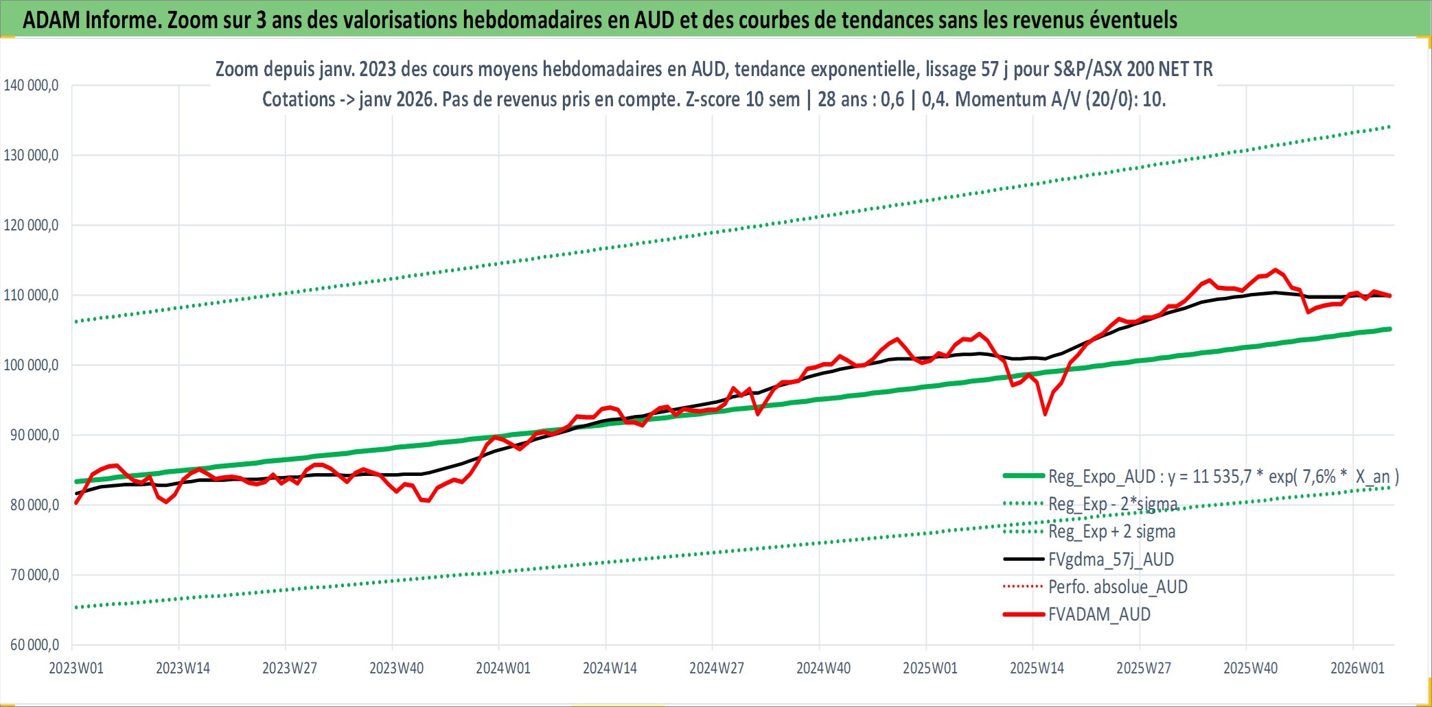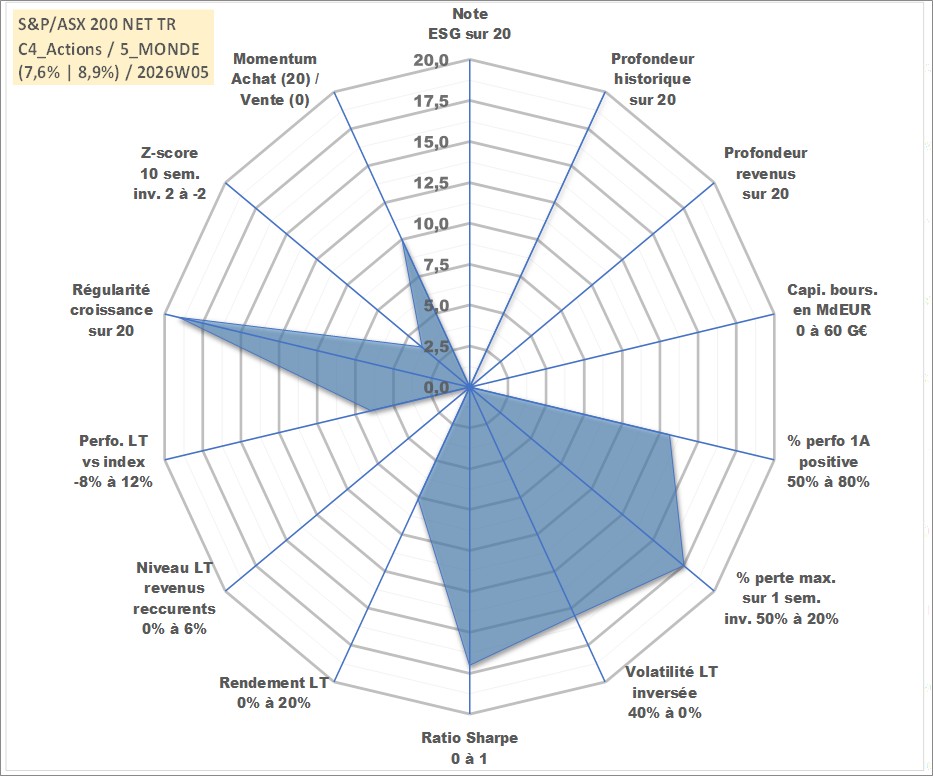 Site dédié aux investisseursPage dédiée sur site financeAnalyse des valorisations hebdomadaires de l'actif S&P/ASX 200 NET TR. Cet actif est cote en AUD. Les valorisations sont en contrevaleur EURO et couvrent les semaines 1997W01 a 2026W05. Les revenus de cet actif financier ne sont pas connus car non existants ou non disponibles sur le site Yahoo Finance. La note ESG de cet actif n'est pas connue.