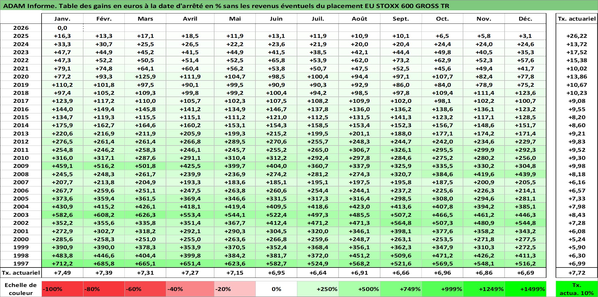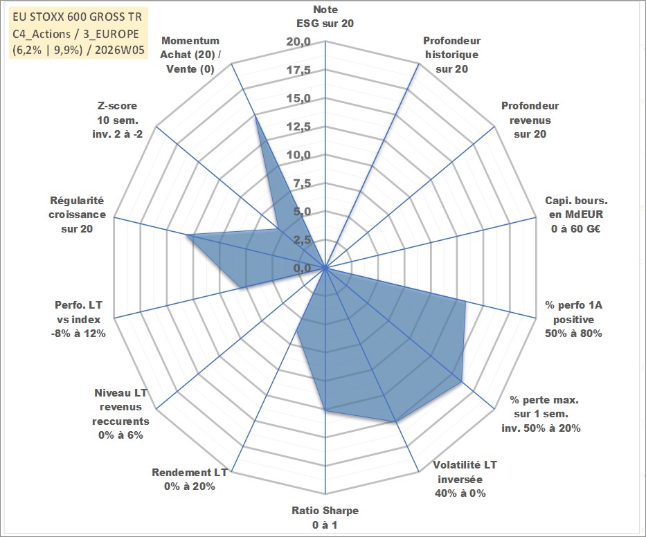 Site dédié aux investisseursPage dédiée sur site financeAnalyse des valorisations hebdomadaires de l'actif EU STOXX 600 GROSS TR. Cet actif est cote en EUR. Les valorisations couvrent les semaines 1997W01 a 2026W05. Les revenus de cet actif financier ne sont pas connus car non existants ou non disponibles sur le site Yahoo Finance. La note ESG de cet actif n'est pas connue.