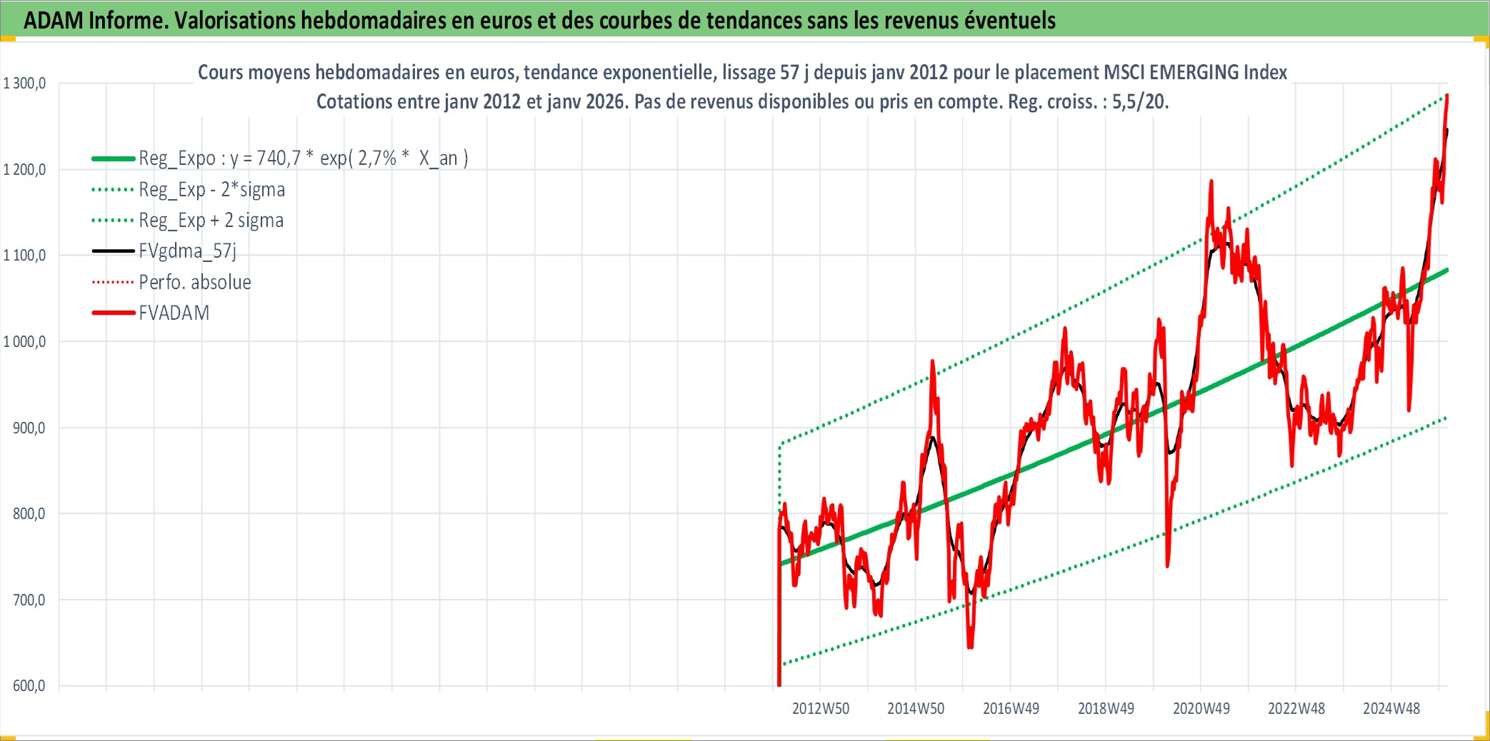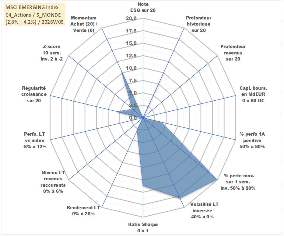 Site dédié aux investisseursPage dédiée sur site financeAnalyse des valorisations hebdomadaires de l'actif MSCI EMERGING Index. Cet actif est cote en USD. Les valorisations sont en contrevaleur EURO et couvrent les semaines 2012W05 a 2025W14. Les revenus de cet actif financier ne sont pas connus car non existants ou non disponibles sur le site Yahoo Finance. La note ESG de cet actif n'est pas connue.
