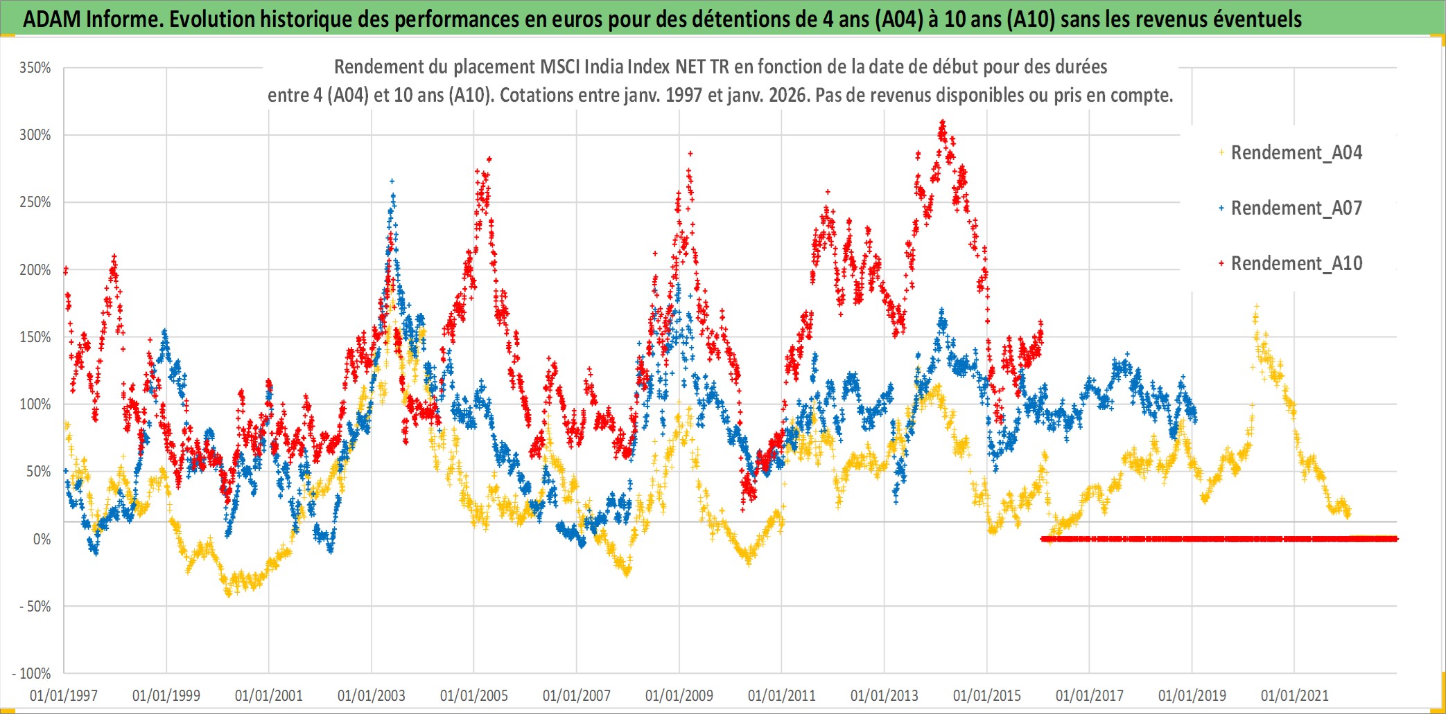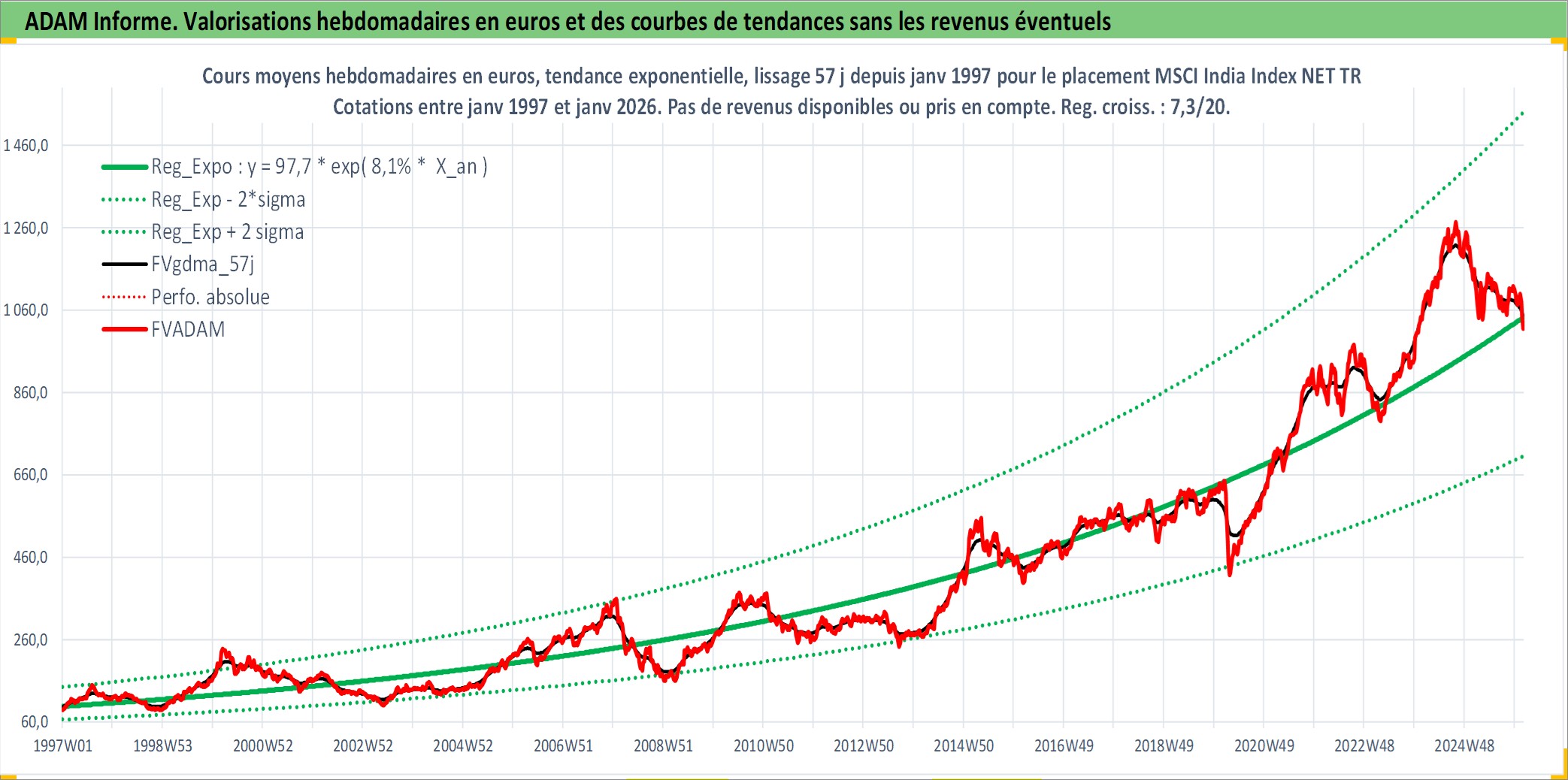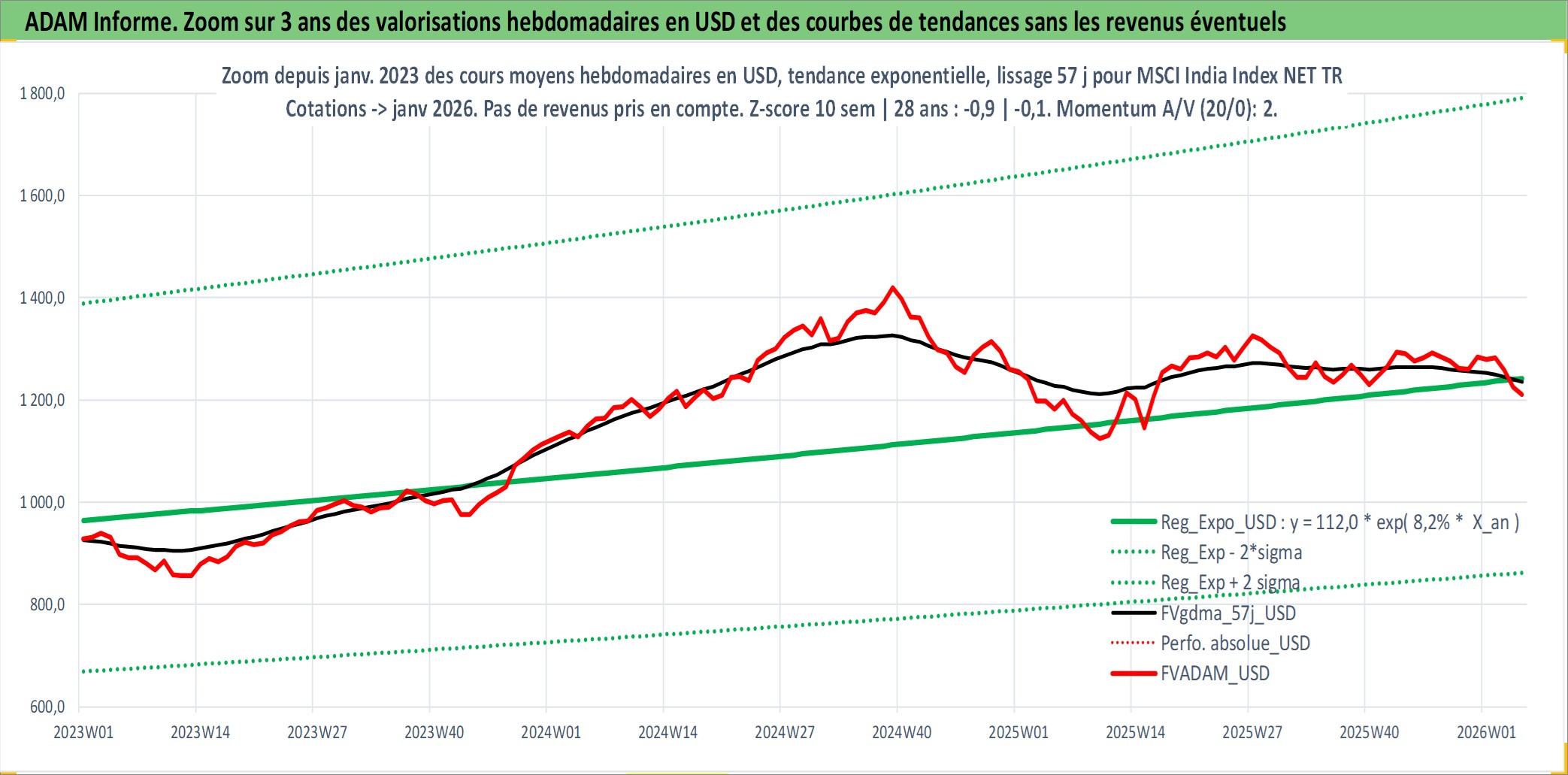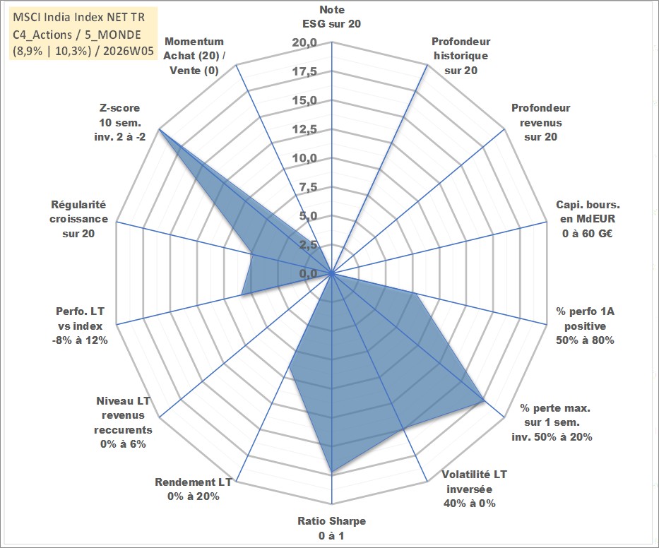 Site dédié aux investisseursPage dédiée sur site financeAnalyse des valorisations hebdomadaires de l'actif MSCI India Index NET TR. Cet actif est cote en USD. Les valorisations sont en contrevaleur EURO et couvrent les semaines 1997W01 a 2026W05. Les revenus de cet actif financier ne sont pas connus car non existants ou non disponibles sur le site Yahoo Finance. La note ESG de cet actif n'est pas connue.