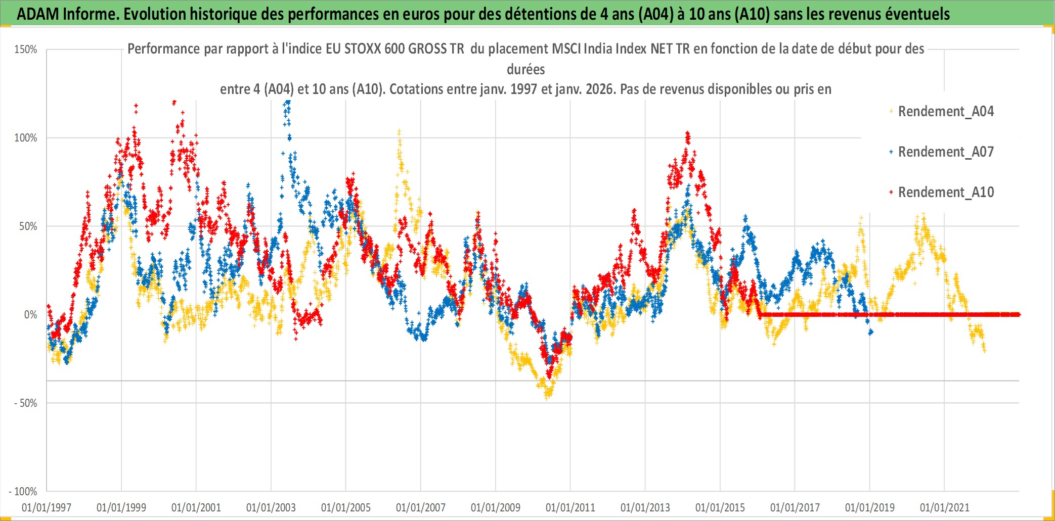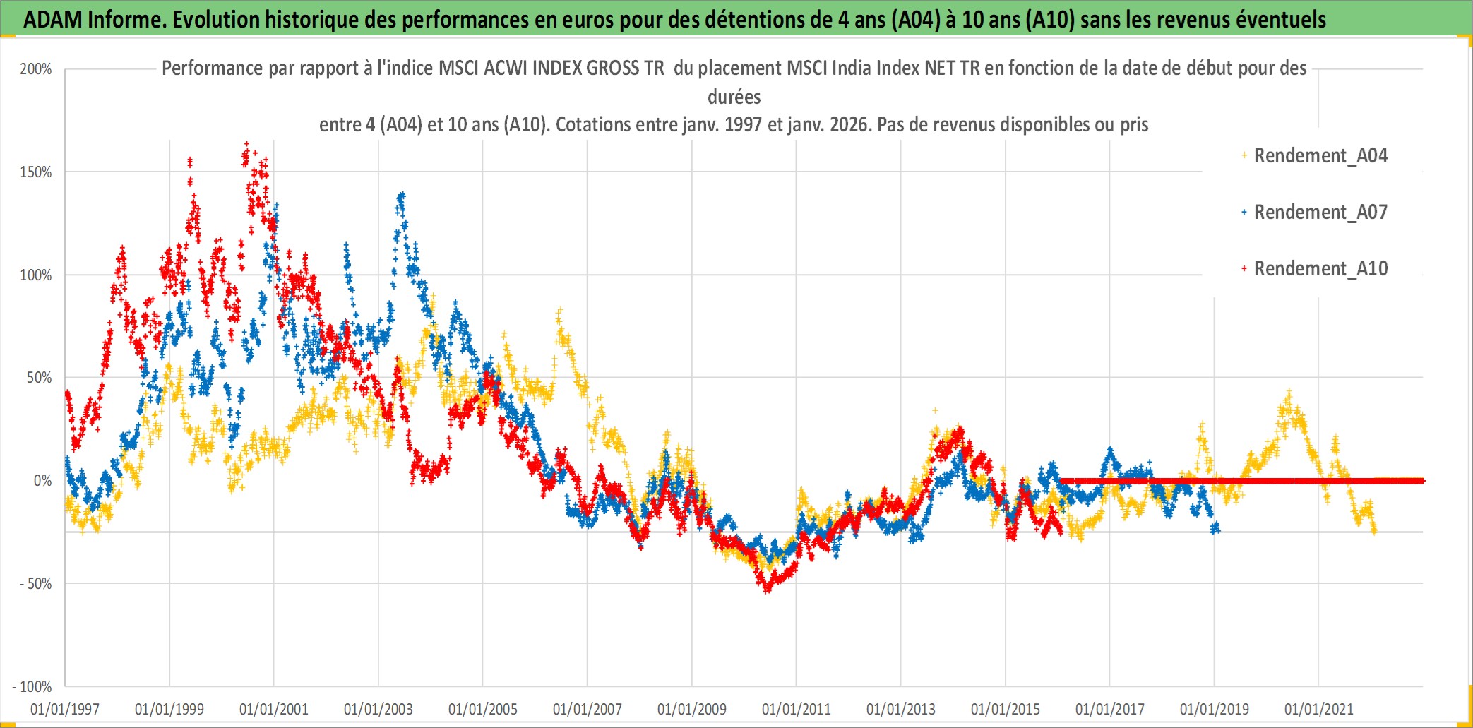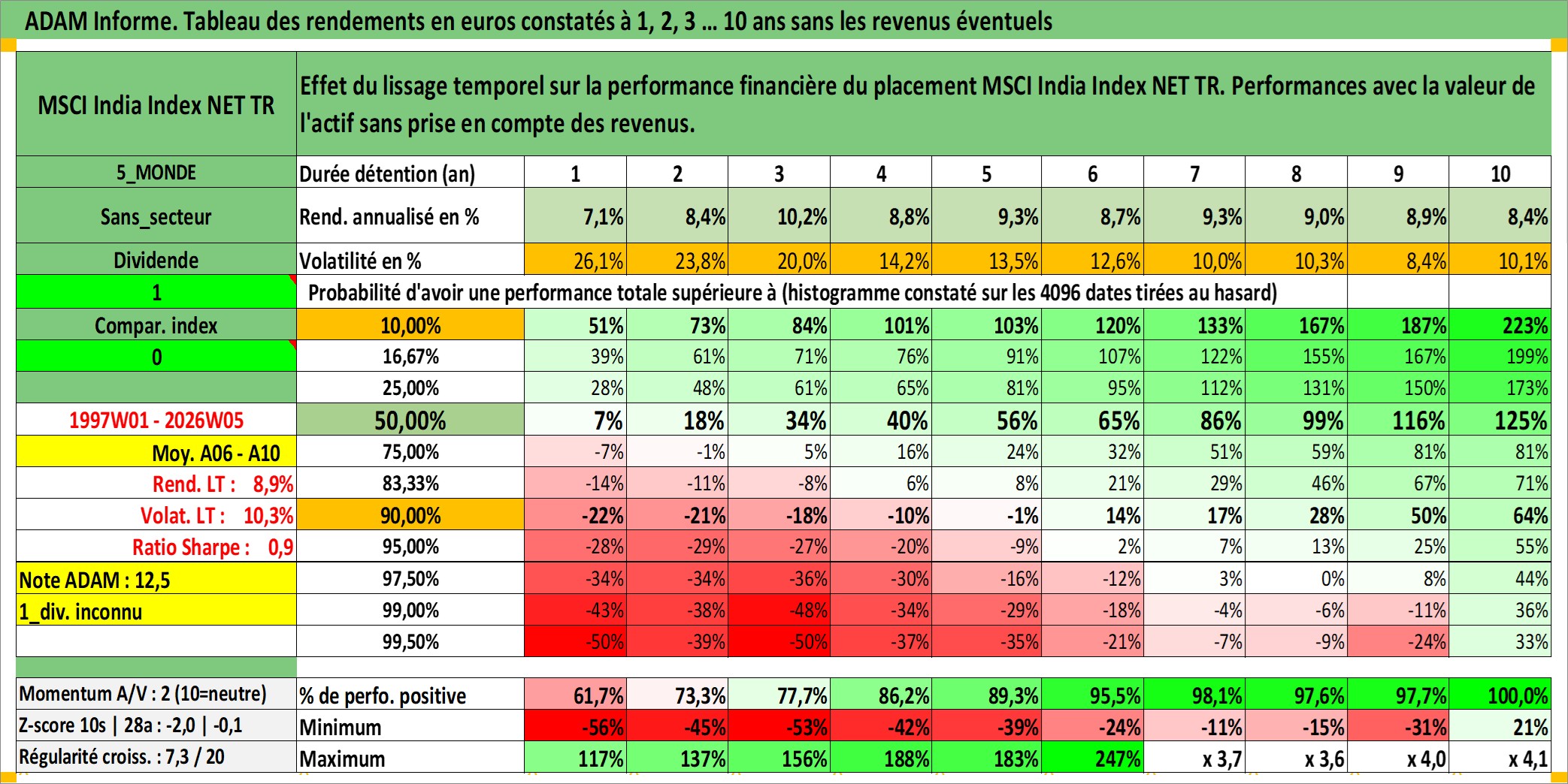 Site dédié aux investisseursPage dédiée sur site financeAnalyse des valorisations hebdomadaires de l'actif MSCI India Index NET TR. Cet actif est cote en USD. Les valorisations sont en contrevaleur EURO et couvrent les semaines 1997W01 a 2026W05. Les revenus de cet actif financier ne sont pas connus car non existants ou non disponibles sur le site Yahoo Finance. La note ESG de cet actif n'est pas connue.