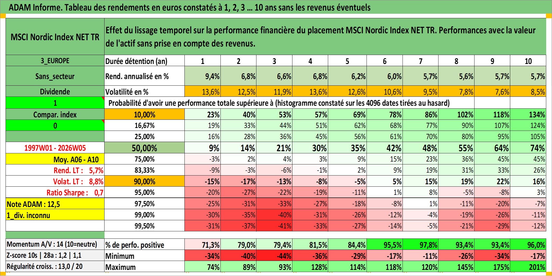 Site dédié aux investisseursPage dédiée sur site financeAnalyse des valorisations hebdomadaires de l'actif MSCI Nordic Index NET TR. Cet actif est cote en EUR. Les valorisations couvrent les semaines 1997W01 a 2026W05. Les revenus de cet actif financier ne sont pas connus car non existants ou non disponibles sur le site Yahoo Finance. La note ESG de cet actif n'est pas connue.