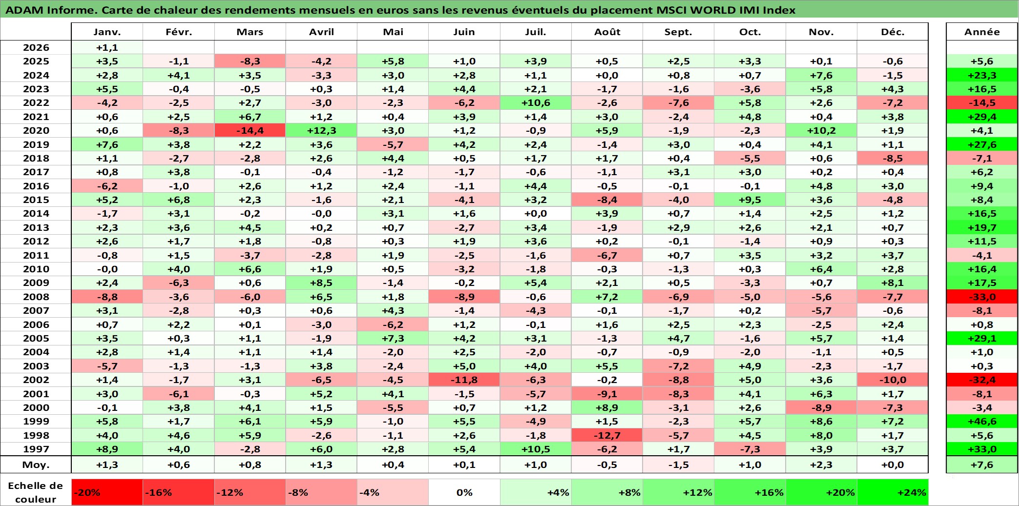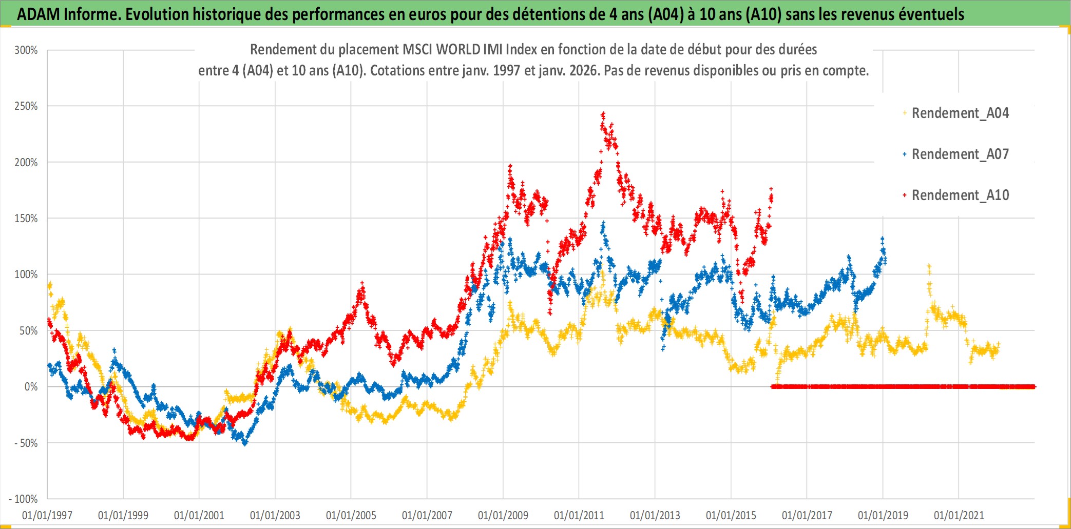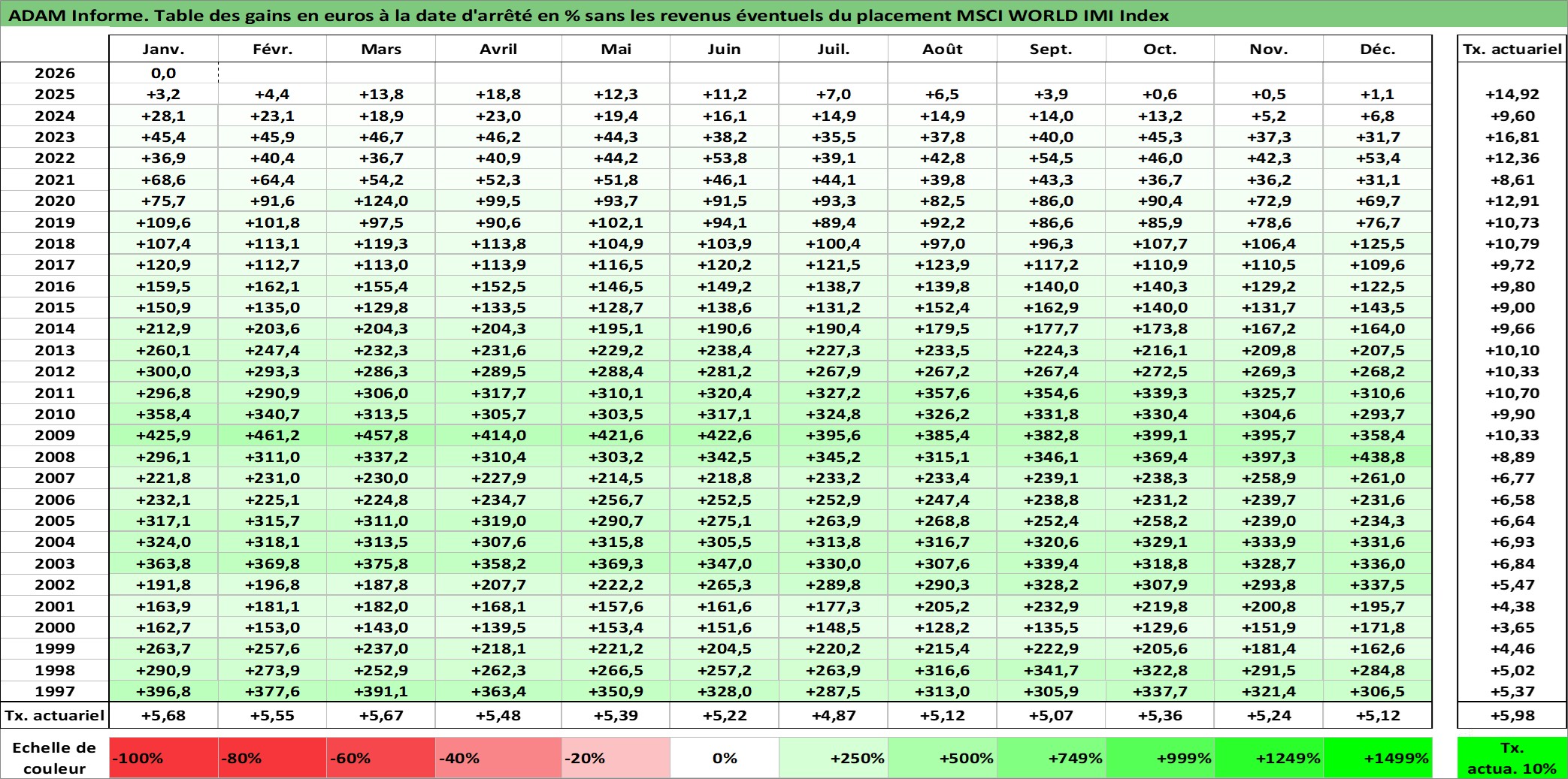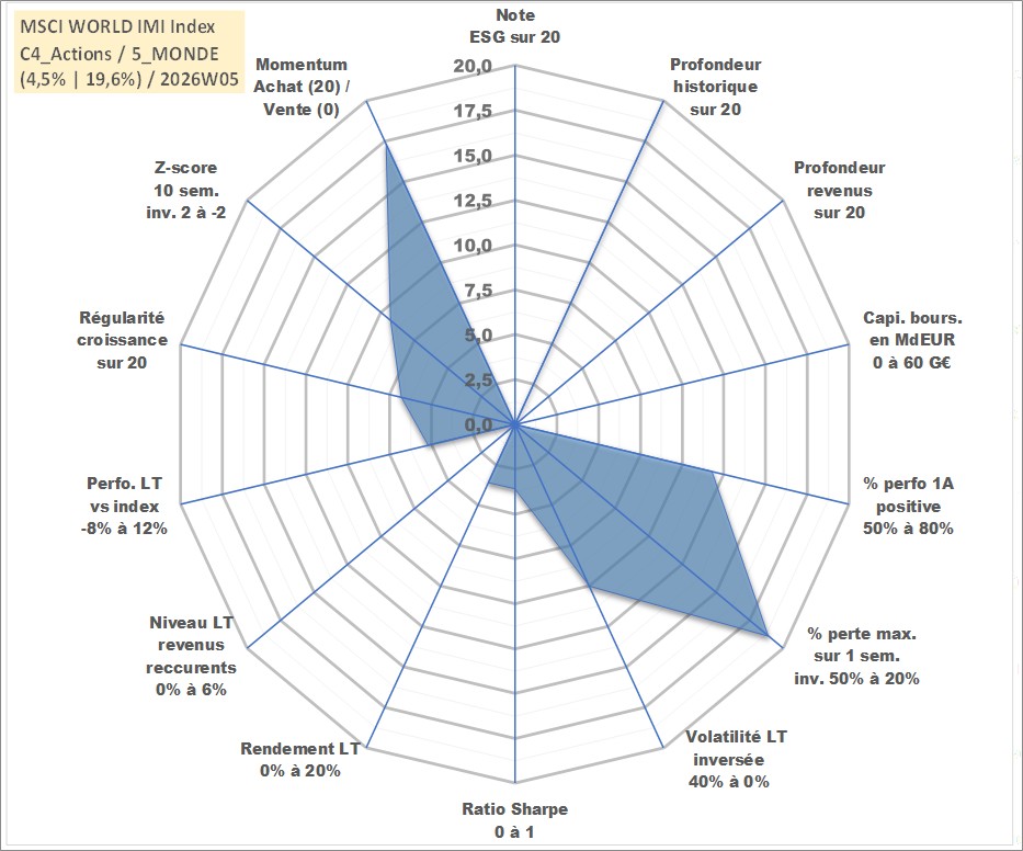 Site dédié aux investisseursPage dédiée sur site financeAnalyse des valorisations hebdomadaires de l'actif MSCI WORLD IMI Index. Cet actif est cote en USD. Les valorisations sont en contrevaleur EURO et couvrent les semaines 1997W01 a 2026W05. Les revenus de cet actif financier ne sont pas connus car non existants ou non disponibles sur le site Yahoo Finance. La note ESG de cet actif n'est pas connue.