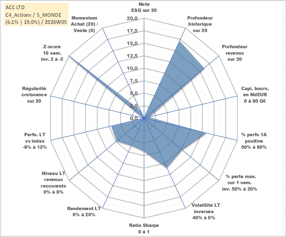 Site dédié aux investisseursPage dédiée sur site financeAnalyse des valorisations hebdomadaires de l'action ACC LTD. Cet actif est cote en INR. Les valorisations sont en contrevaleur EURO et couvrent les semaines 2002W27 a 2026W05. Les revenus de cet actif financier sont pris en compte depuis la semaine 2003W27. La note ESG de cet actif n'est pas connue.