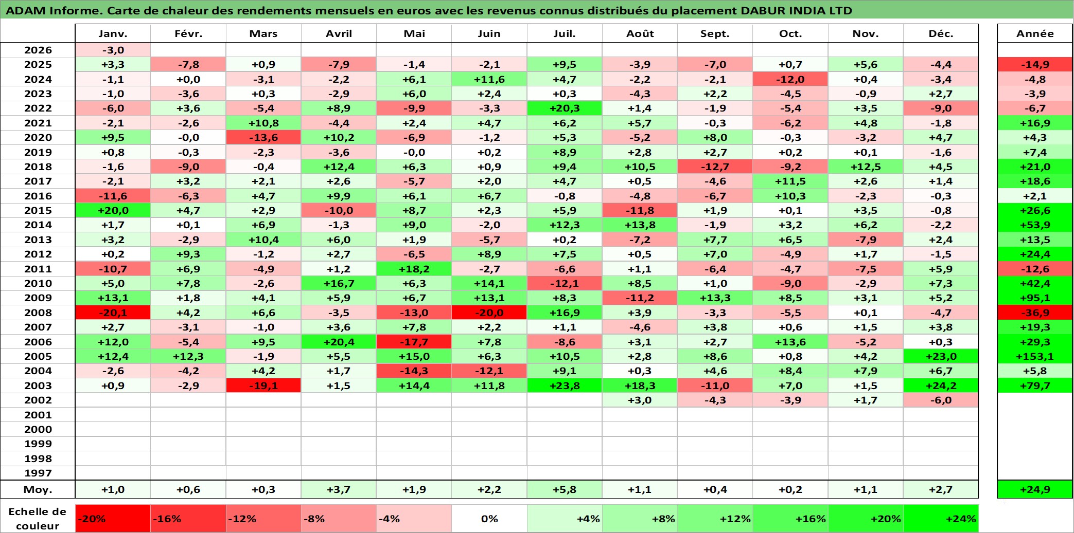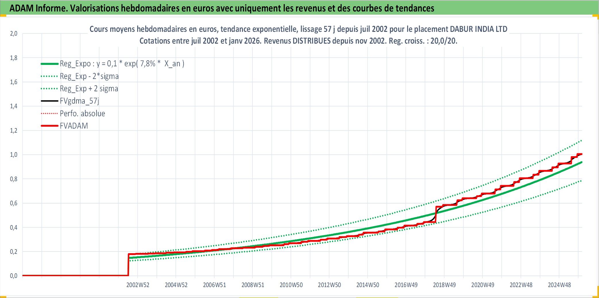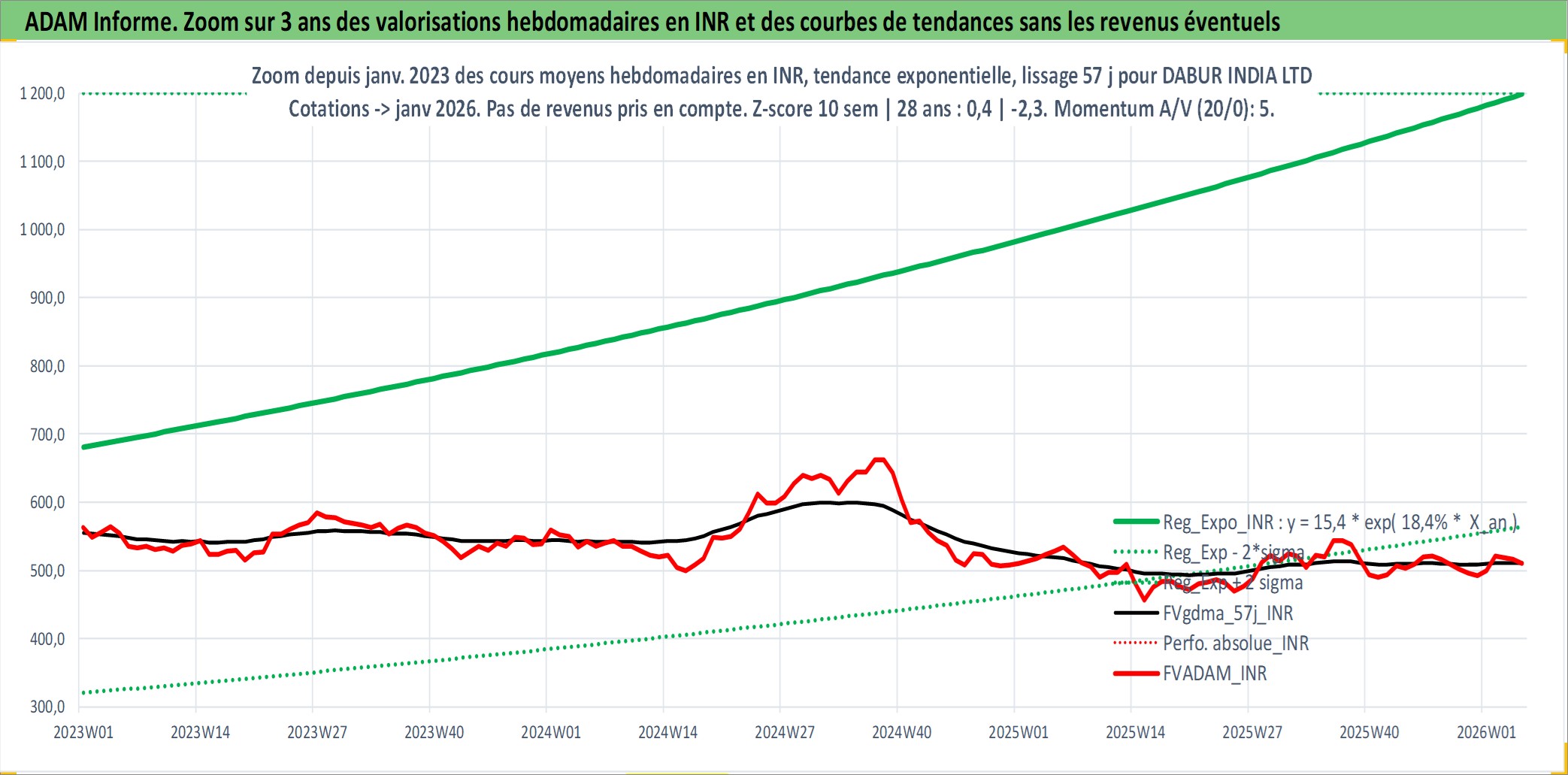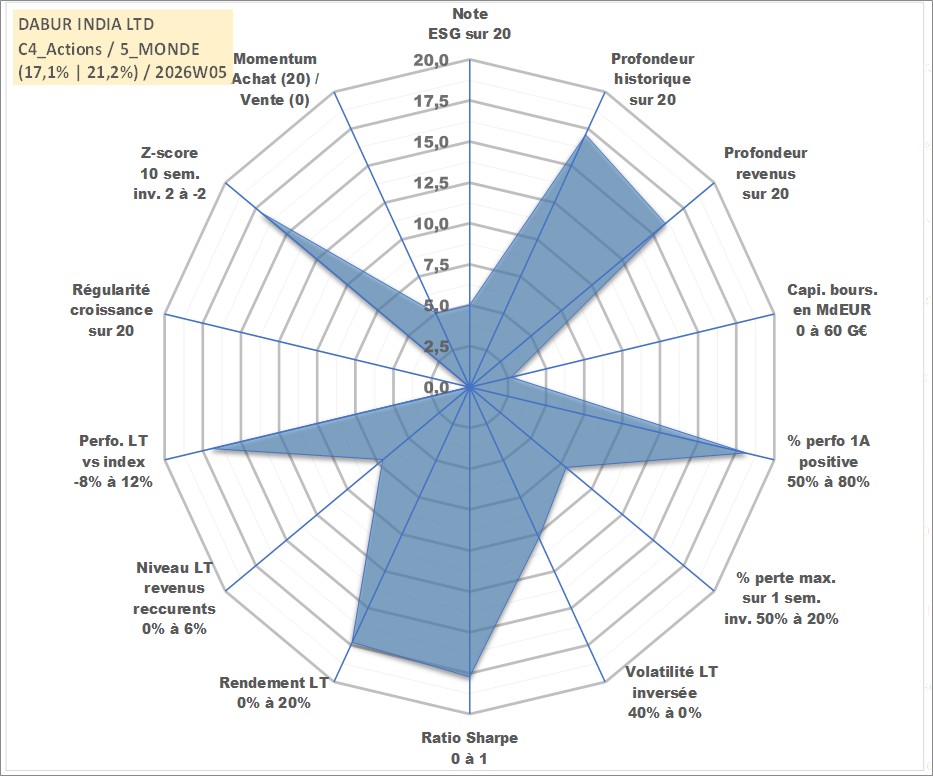 Site dédié aux investisseursPage dédiée sur site financeAnalyse des valorisations hebdomadaires de l'action DABUR INDIA LTD. Cet actif est cote en INR. Les valorisations sont en contrevaleur EURO et couvrent les semaines 2002W27 a 2026W05. Les revenus de cet actif financier sont pris en compte depuis la semaine 2002W46. La note globale ESG de cet actif est estimee a 5.0 (apres rebasage entre 0 et 20).
