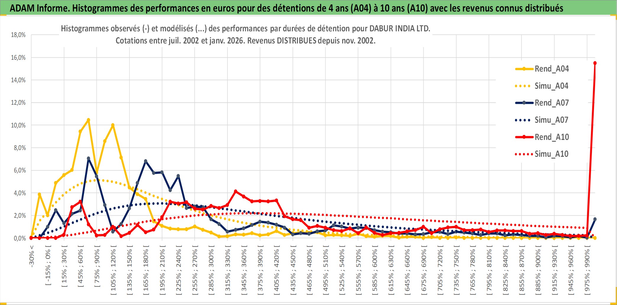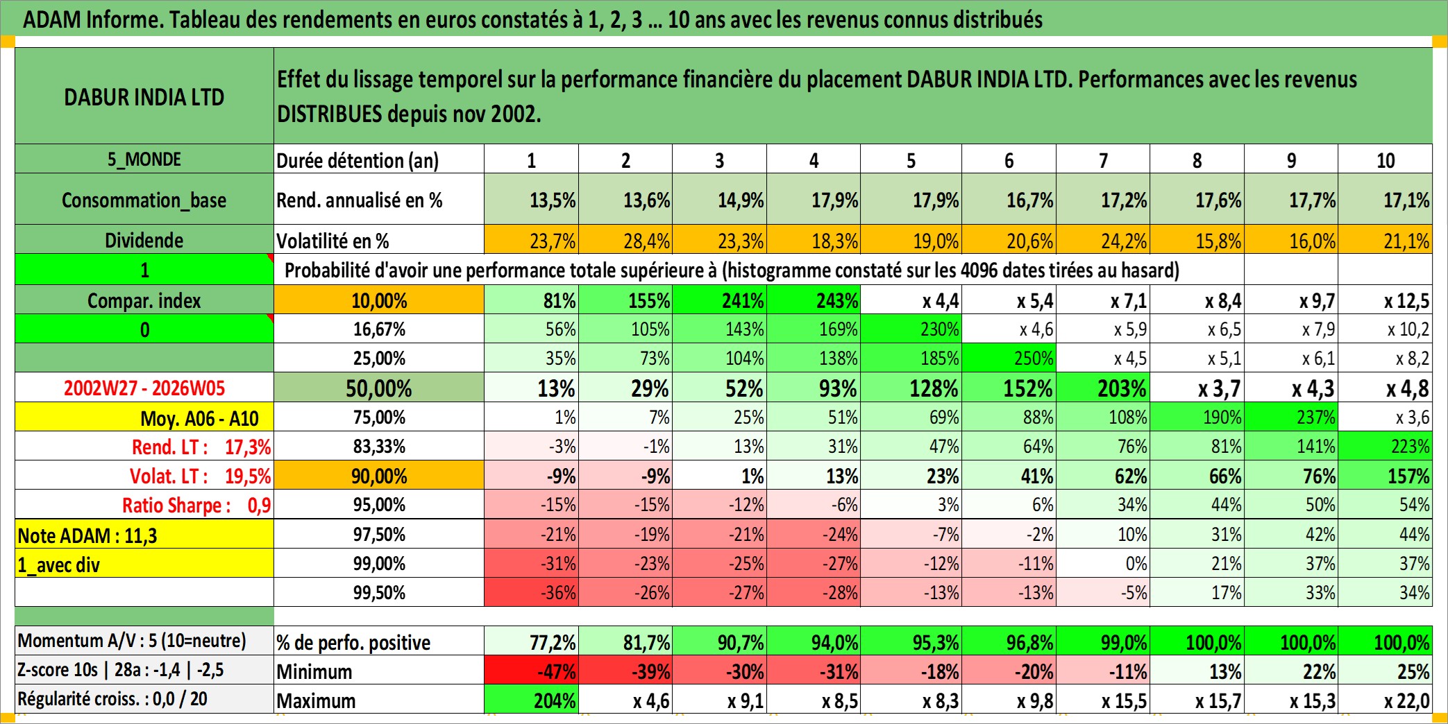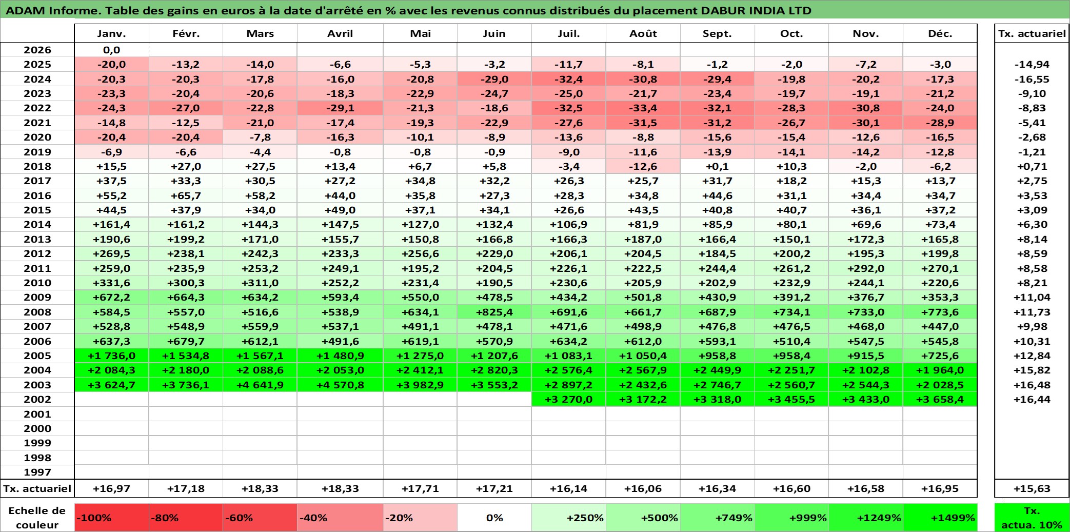 Site dédié aux investisseursPage dédiée sur site financeAnalyse des valorisations hebdomadaires de l'action DABUR INDIA LTD. Cet actif est cote en INR. Les valorisations sont en contrevaleur EURO et couvrent les semaines 2002W27 a 2026W05. Les revenus de cet actif financier sont pris en compte depuis la semaine 2002W46. La note globale ESG de cet actif est estimee a 5.0 (apres rebasage entre 0 et 20).