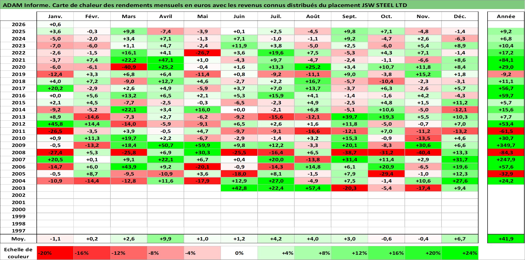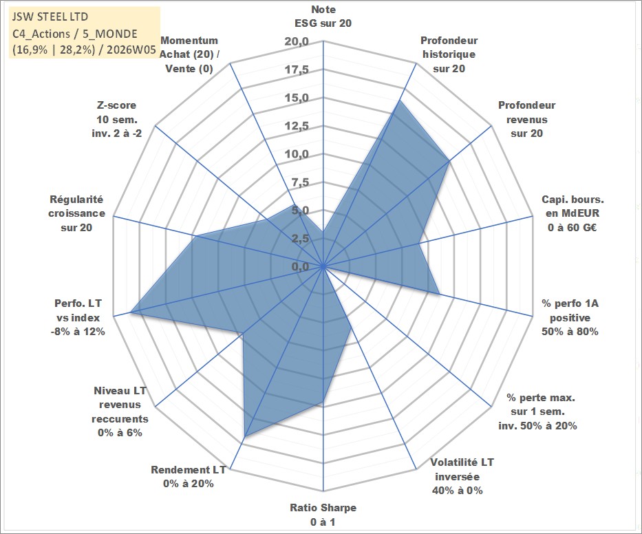 Site dédié aux investisseursPage dédiée sur site financeAnalyse des valorisations hebdomadaires de l'action JSW STEEL LTD. Cet actif est cote en INR. Les valorisations sont en contrevaleur EURO et couvrent les semaines 2003W19 a 2026W05. Les revenus de cet actif financier sont pris en compte depuis la semaine 2005W17. La note globale ESG de cet actif est estimee a 3.0 (apres rebasage entre 0 et 20).