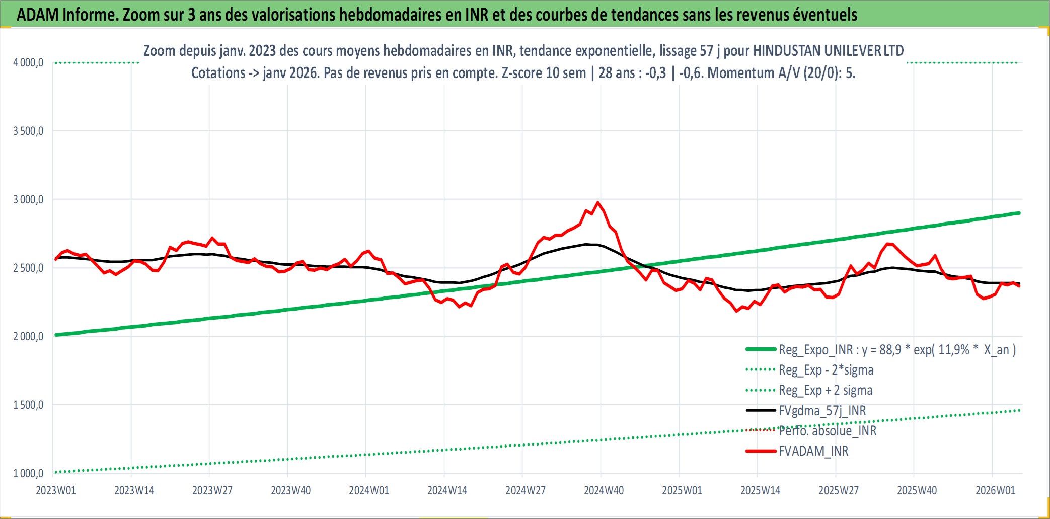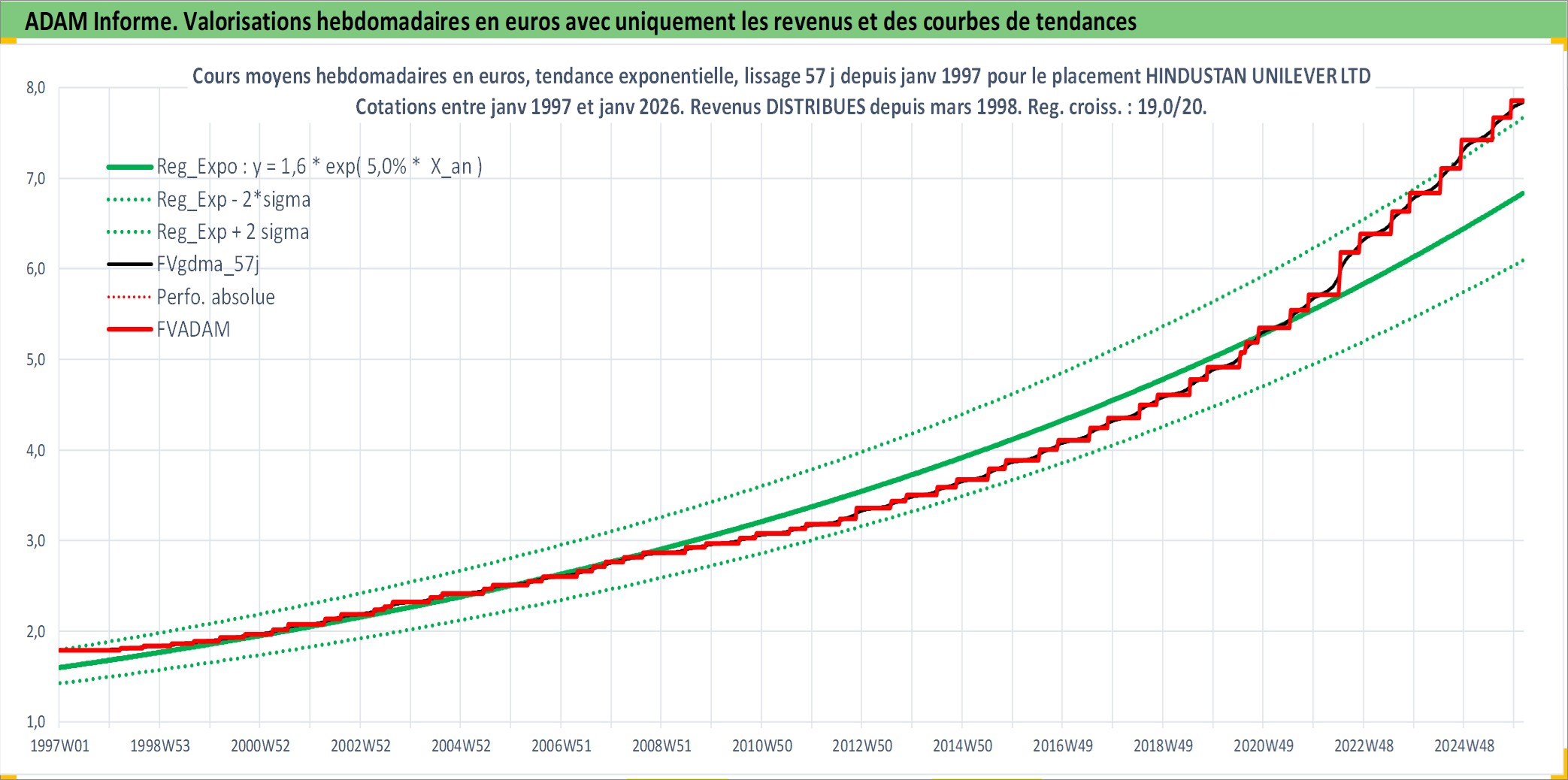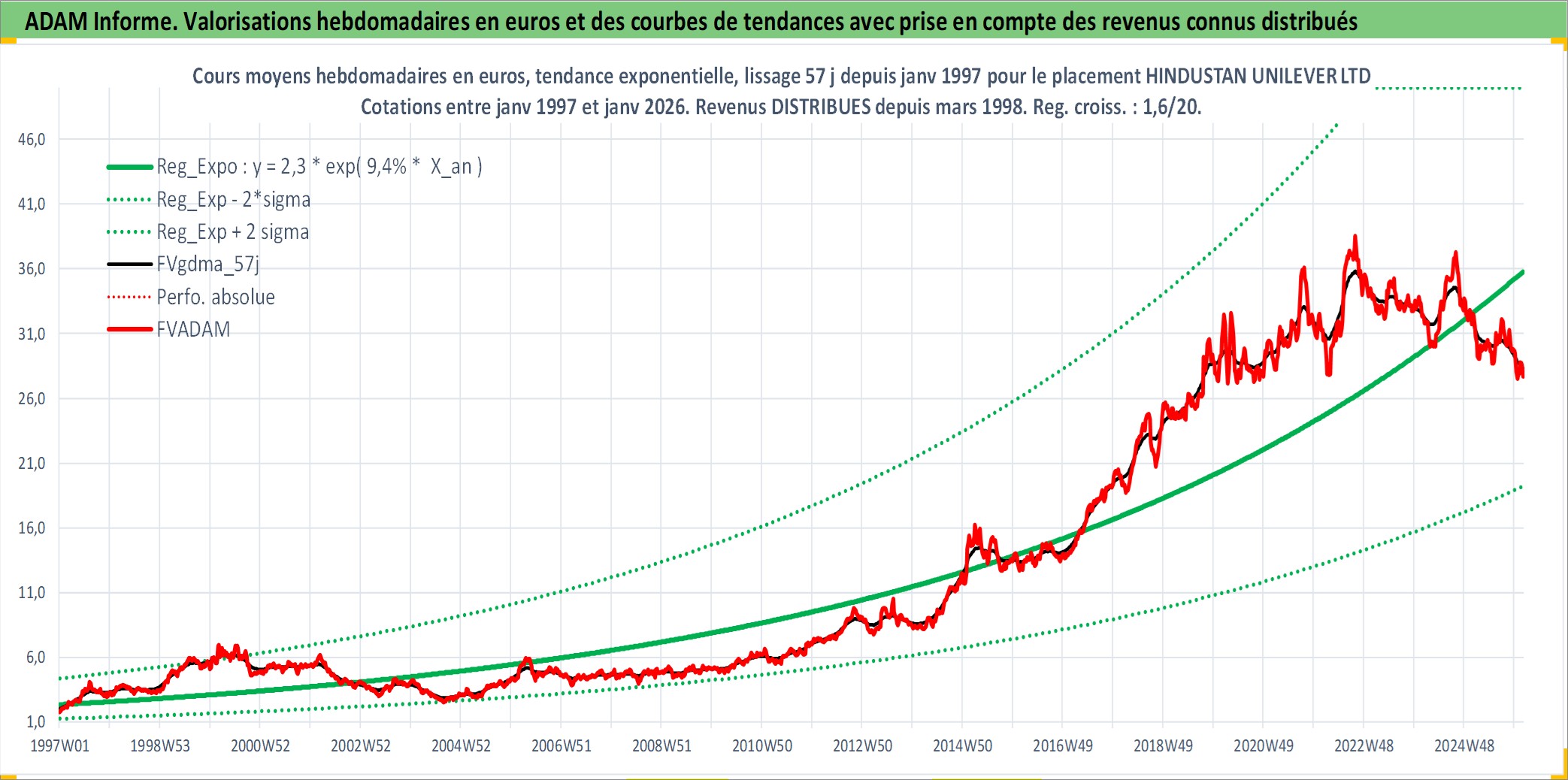 Site dédié aux investisseursPage dédiée sur site financeAnalyse des valorisations hebdomadaires de l'action HINDUSTAN UNILEVER LTD. Cet actif est cote en INR. Les valorisations sont en contrevaleur EURO et couvrent les semaines 1997W01 a 2026W05. Les revenus de cet actif financier sont pris en compte depuis la semaine 1998W12. La note globale ESG de cet actif est estimee a 7.0 (apres rebasage entre 0 et 20).