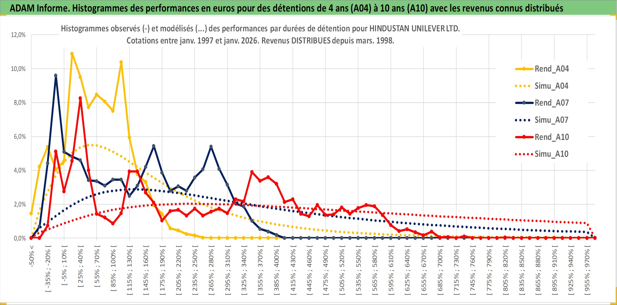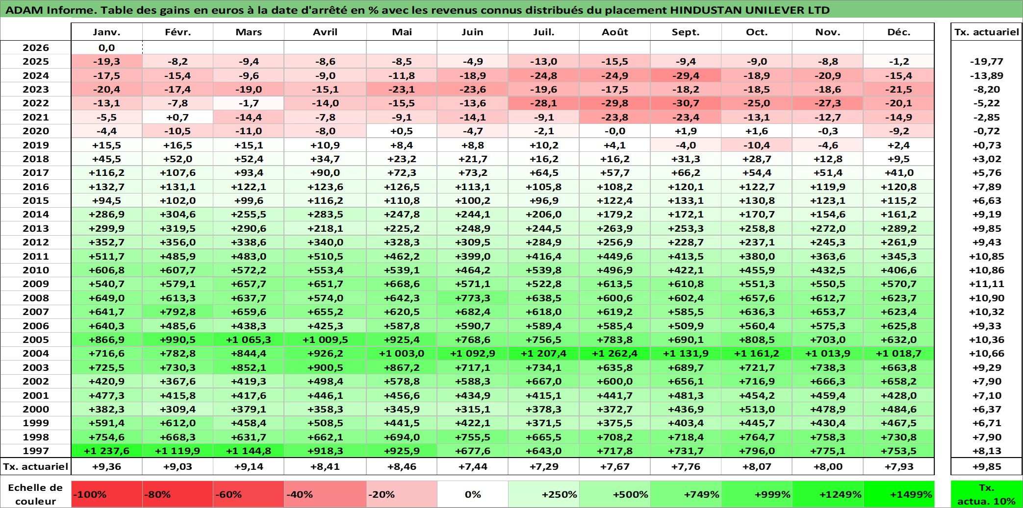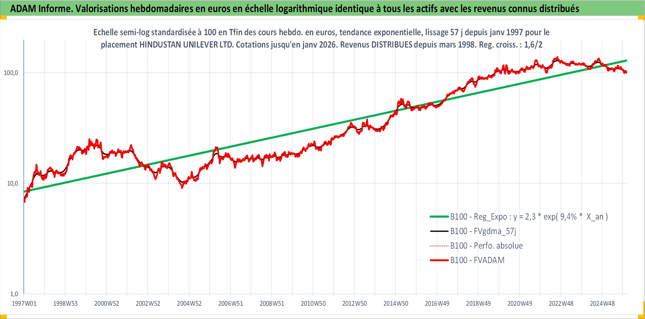 Site dédié aux investisseursPage dédiée sur site financeAnalyse des valorisations hebdomadaires de l'action HINDUSTAN UNILEVER LTD. Cet actif est cote en INR. Les valorisations sont en contrevaleur EURO et couvrent les semaines 1997W01 a 2026W05. Les revenus de cet actif financier sont pris en compte depuis la semaine 1998W12. La note globale ESG de cet actif est estimee a 7.0 (apres rebasage entre 0 et 20).