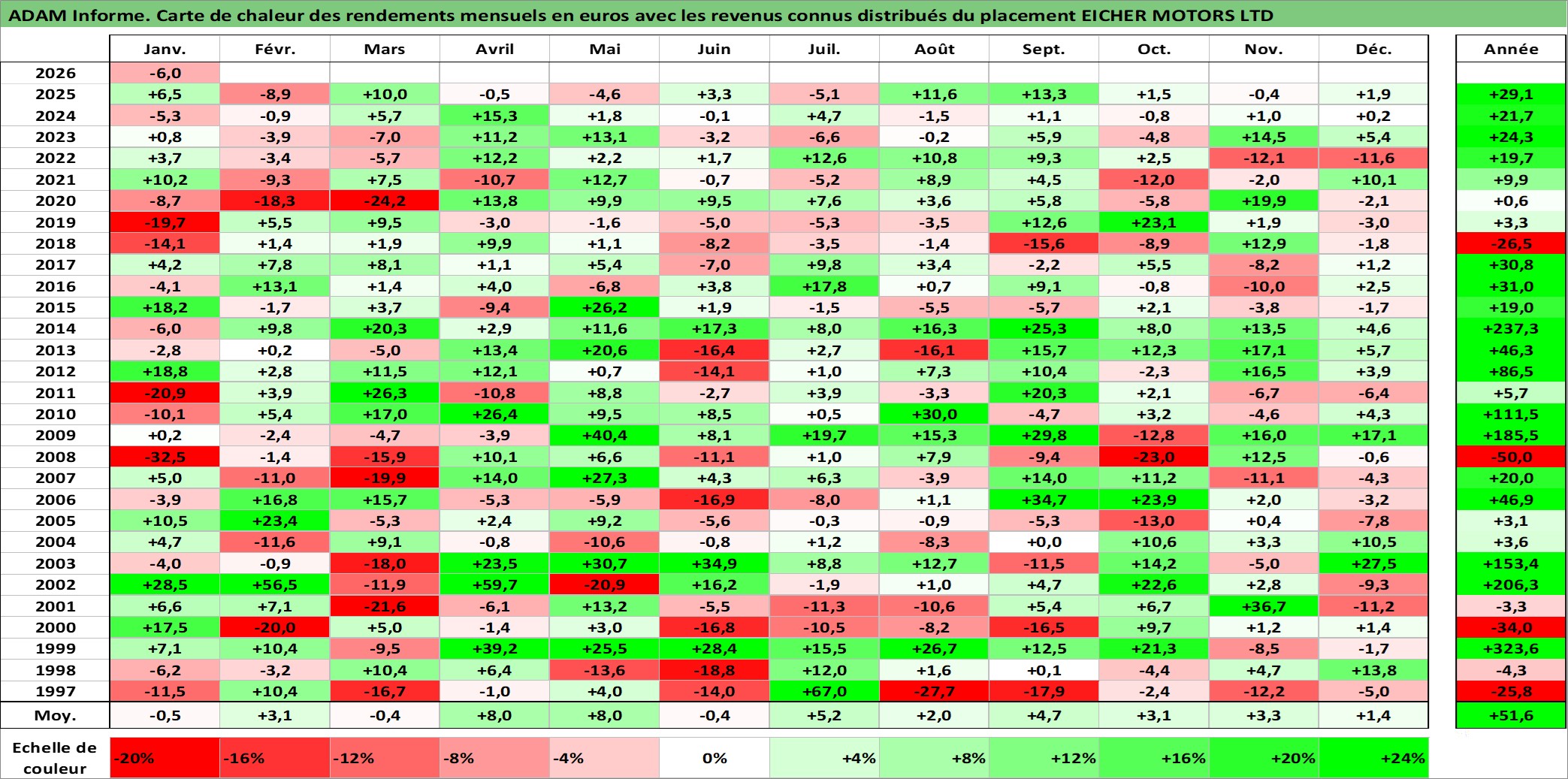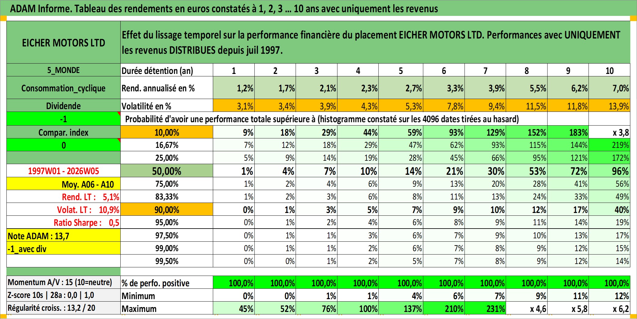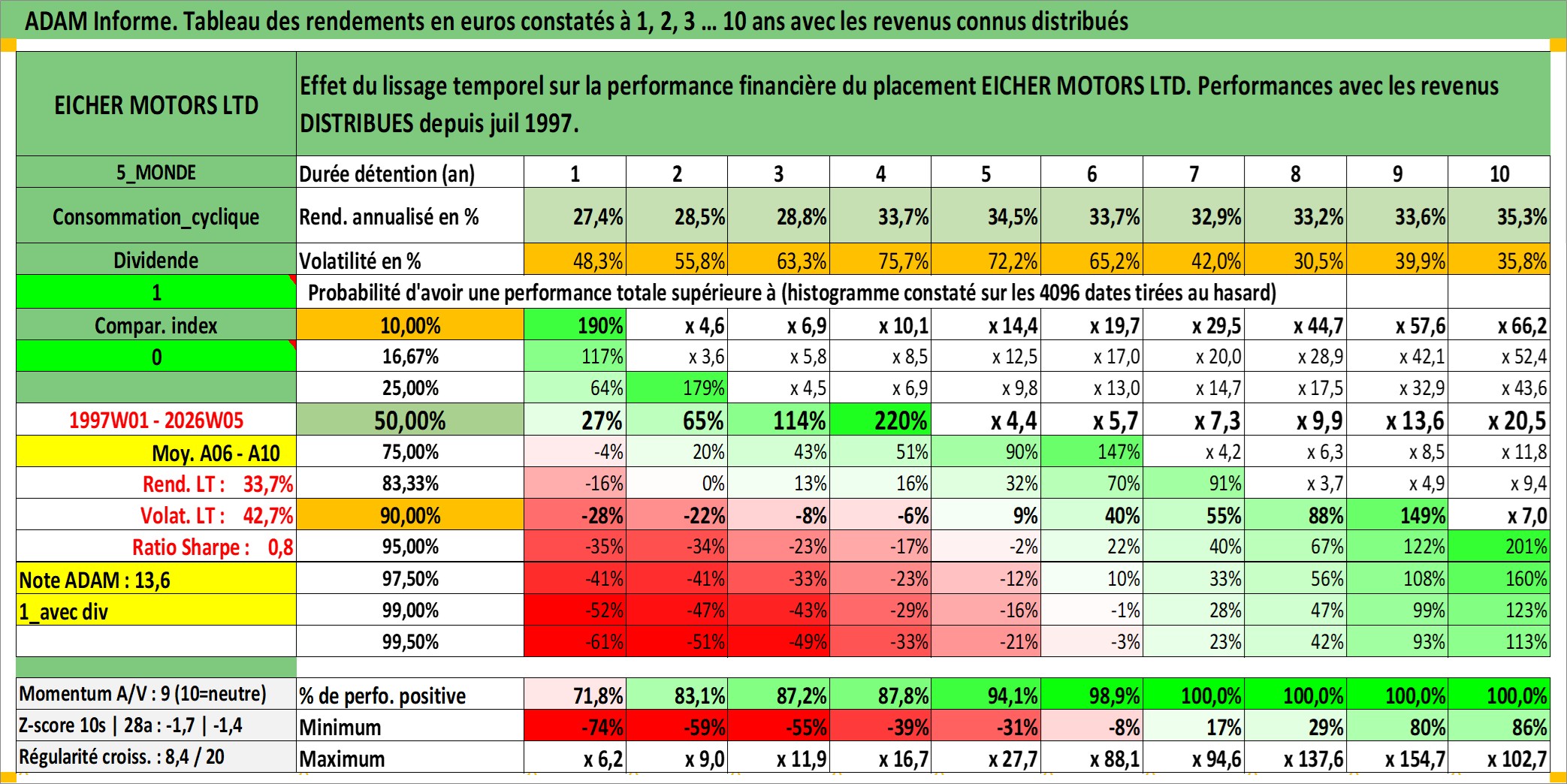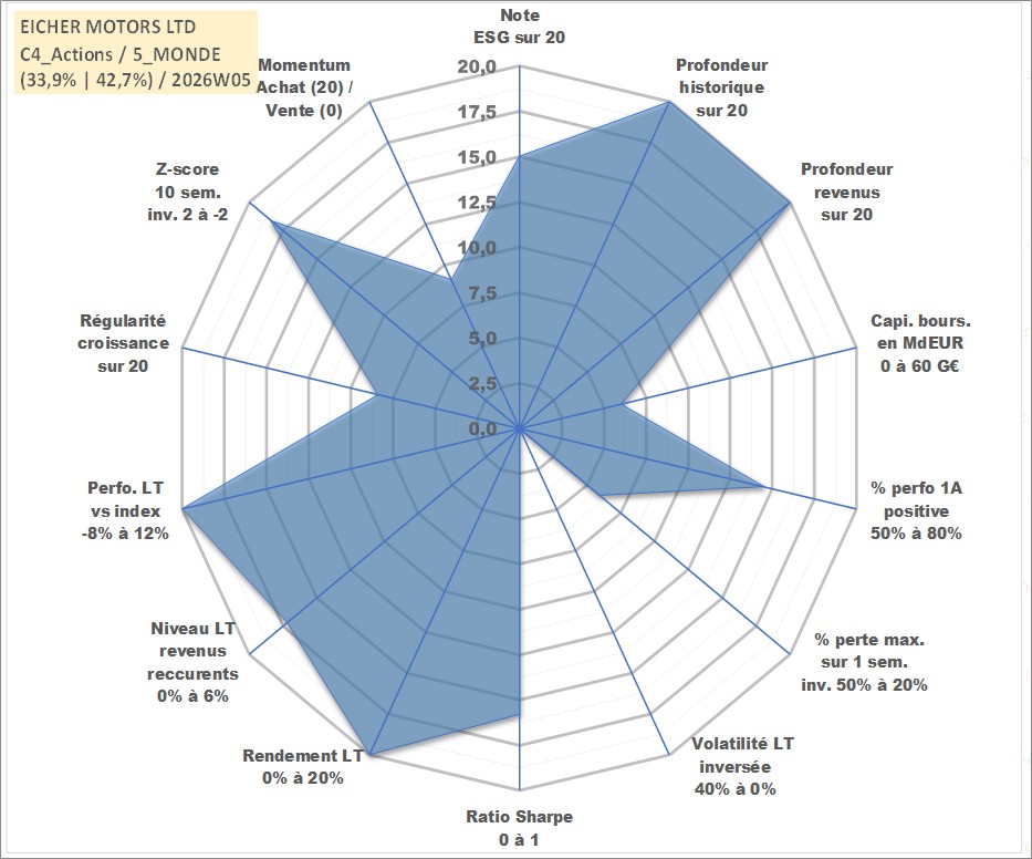 Site dédié aux investisseursPage dédiée sur site financeAnalyse des valorisations hebdomadaires de l'action EICHER MOTORS LTD. Cet actif est cote en INR. Les valorisations sont en contrevaleur EURO et couvrent les semaines 1997W01 a 2026W05. Les revenus de cet actif financier sont pris en compte depuis la semaine 1997W30. La note globale ESG de cet actif est estimee a 15.0 (apres rebasage entre 0 et 20).