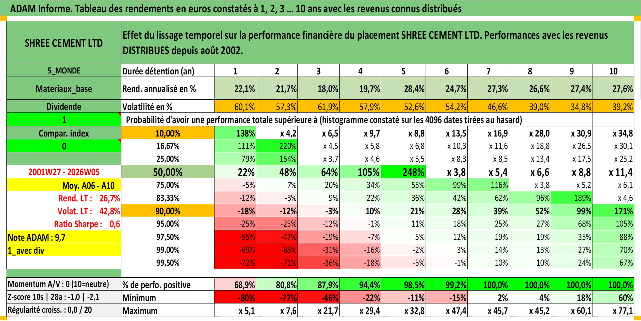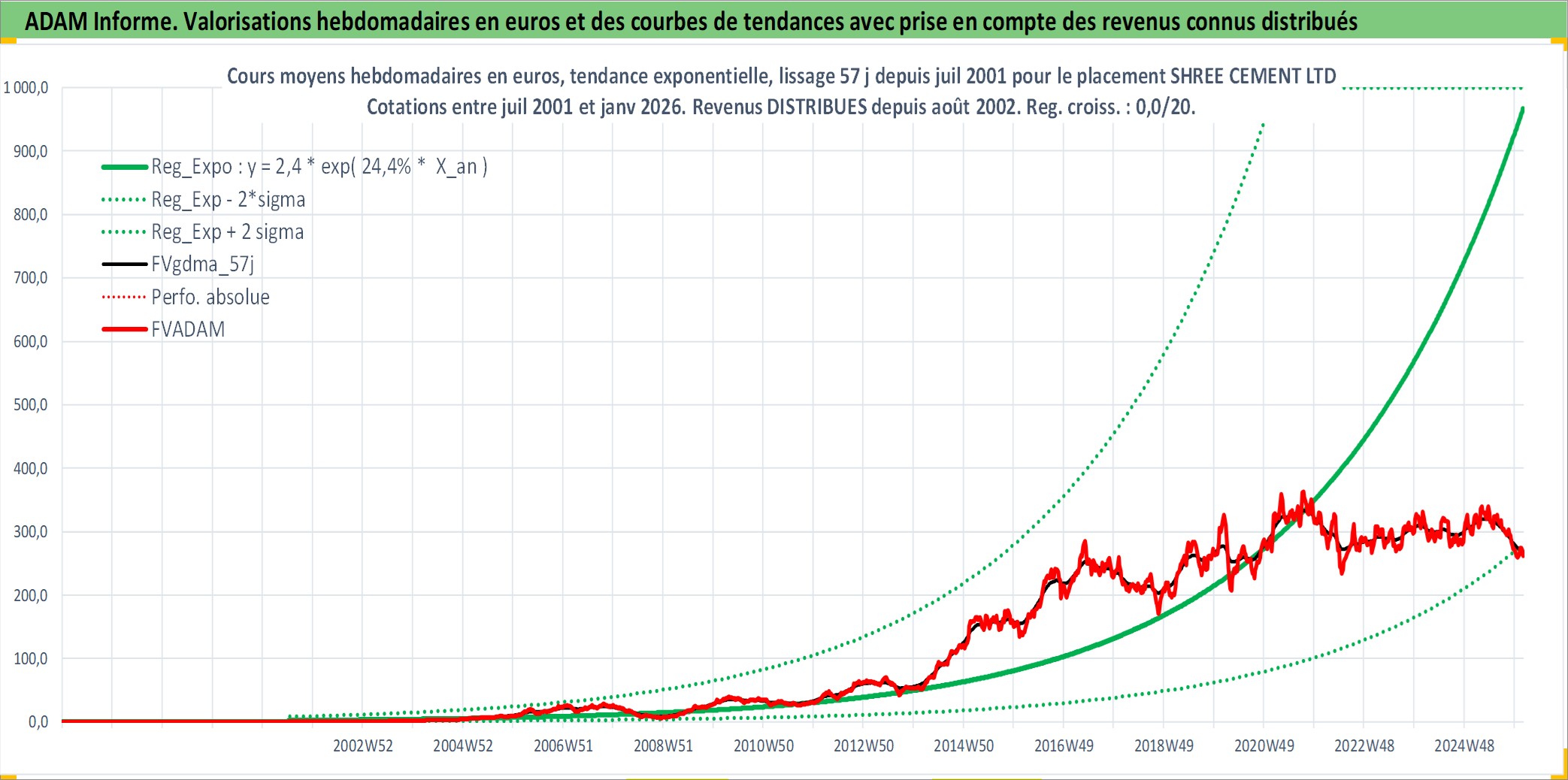 Site dédié aux investisseursPage dédiée sur site financeAnalyse des valorisations hebdomadaires de l'action SHREE CEMENT LTD. Cet actif est cote en INR. Les valorisations sont en contrevaleur EURO et couvrent les semaines 2001W27 a 2026W05. Les revenus de cet actif financier sont pris en compte depuis la semaine 2002W33. La note globale ESG de cet actif est estimee a 6.0 (apres rebasage entre 0 et 20).
