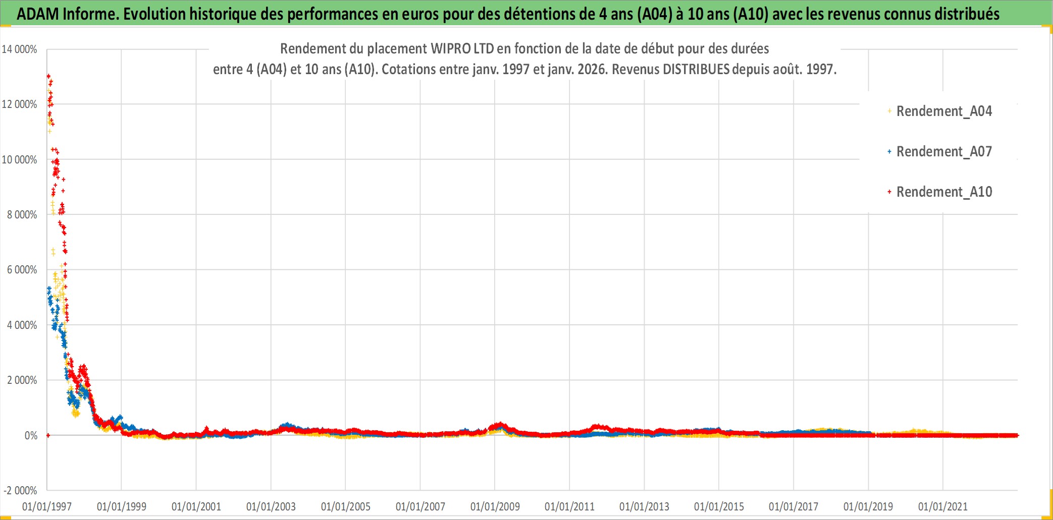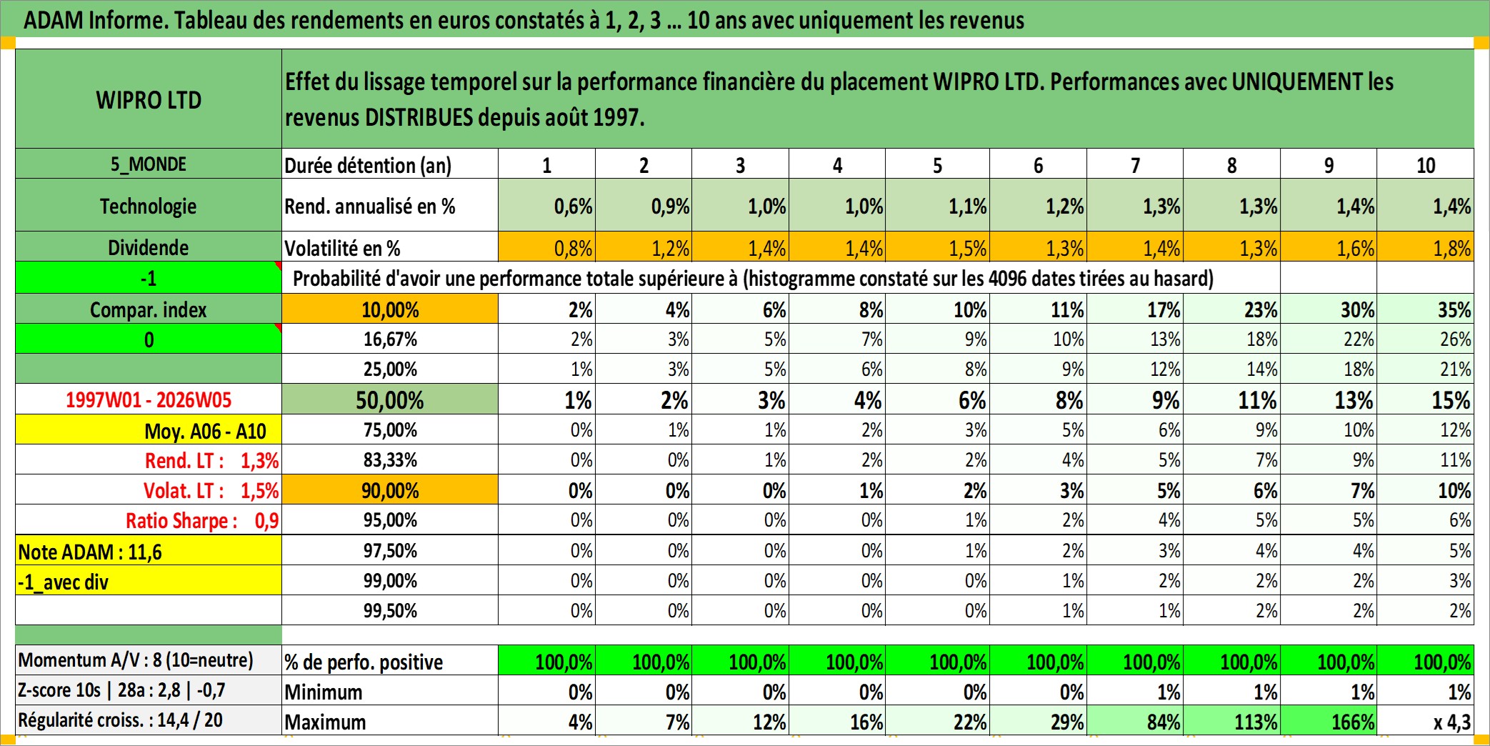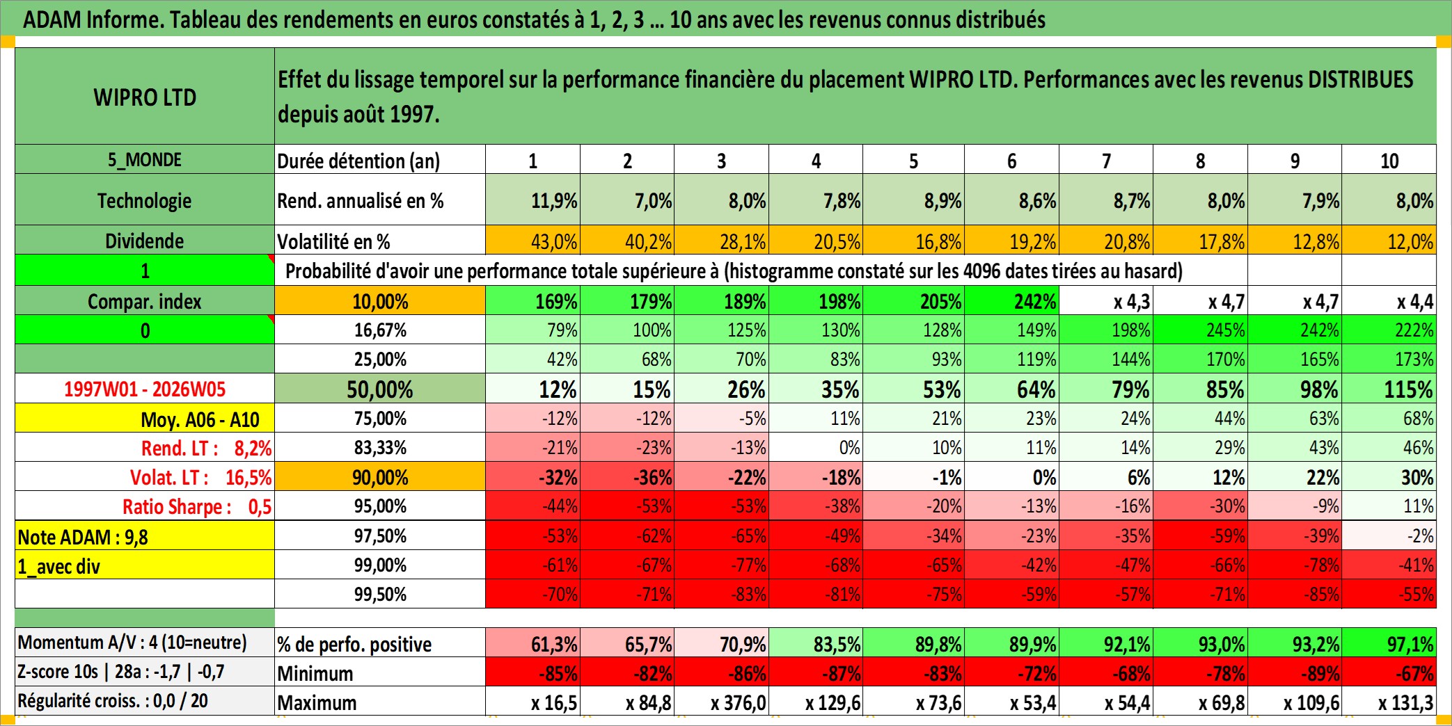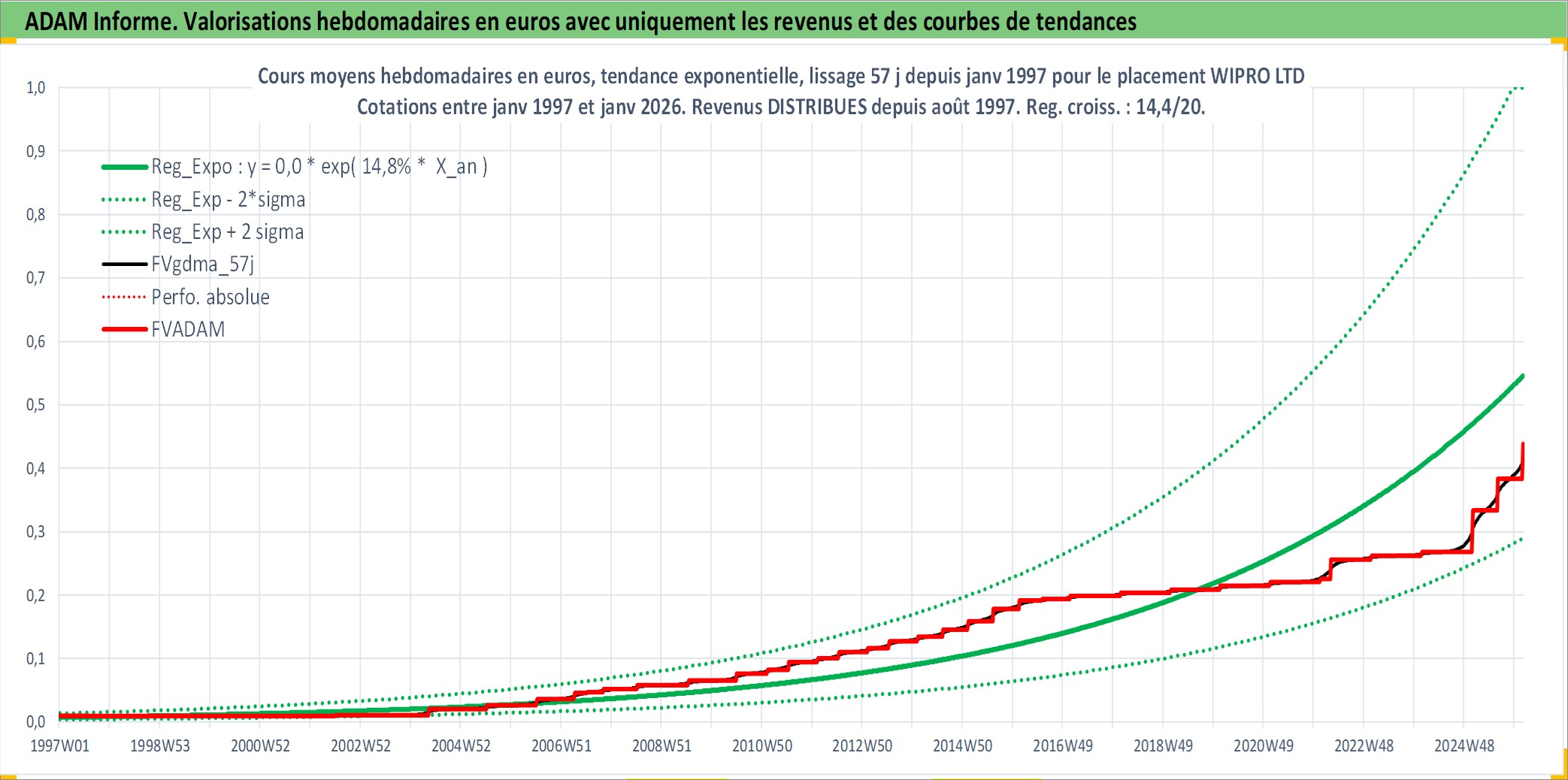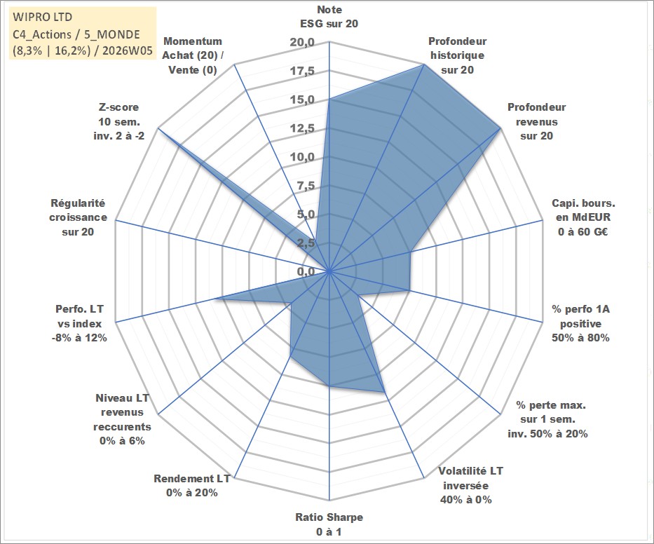Site dédié aux investisseursPage dédiée sur site financeAnalyse des valorisations hebdomadaires de l'action WIPRO LTD. Cet actif est cote en INR. Les valorisations sont en contrevaleur EURO et couvrent les semaines 1997W01 a 2026W05. Les revenus de cet actif financier sont pris en compte depuis la semaine 1997W32. La note globale ESG de cet actif est estimee a 15.0 (apres rebasage entre 0 et 20).