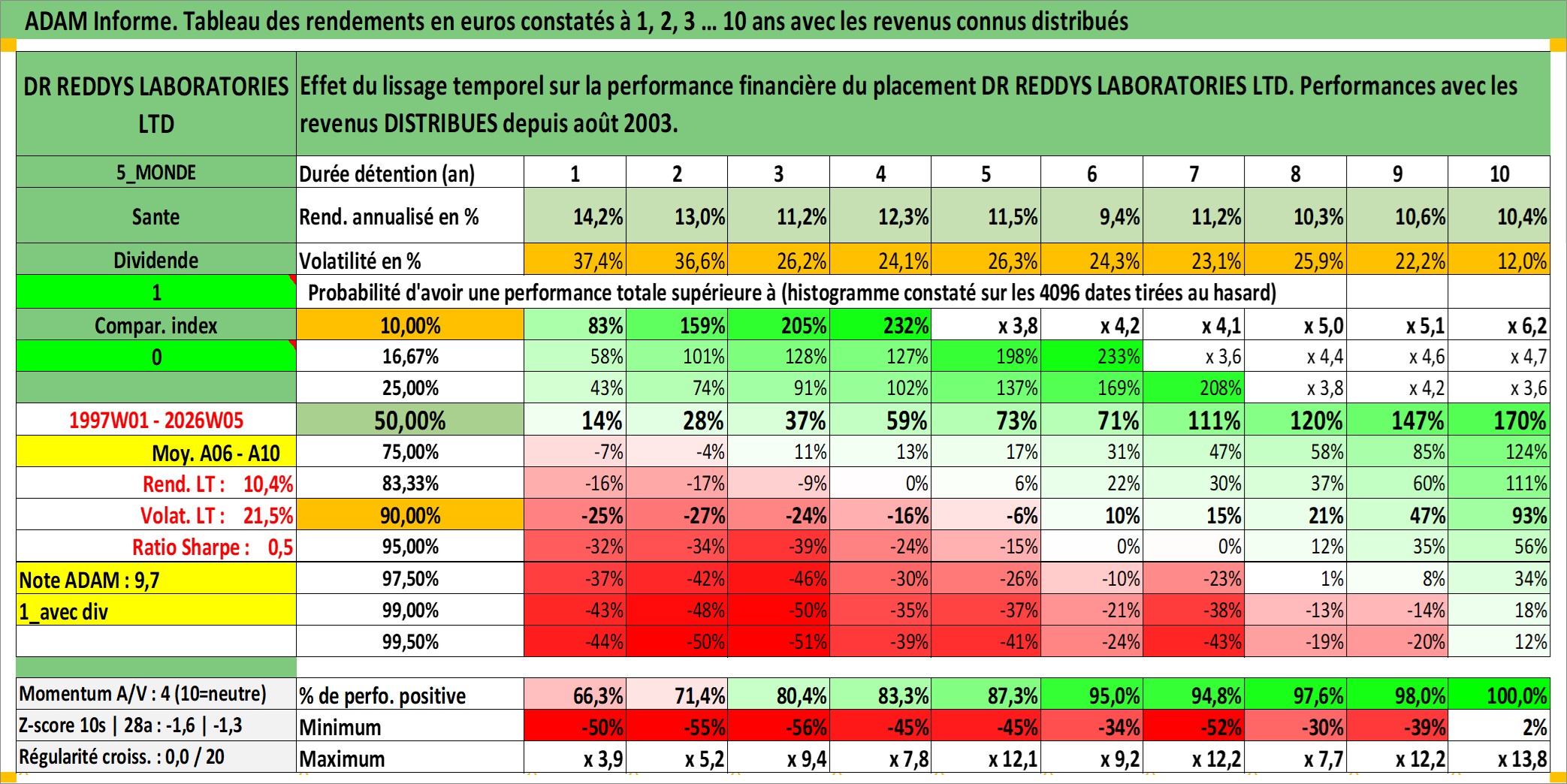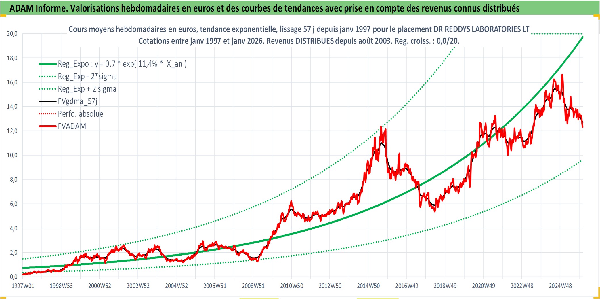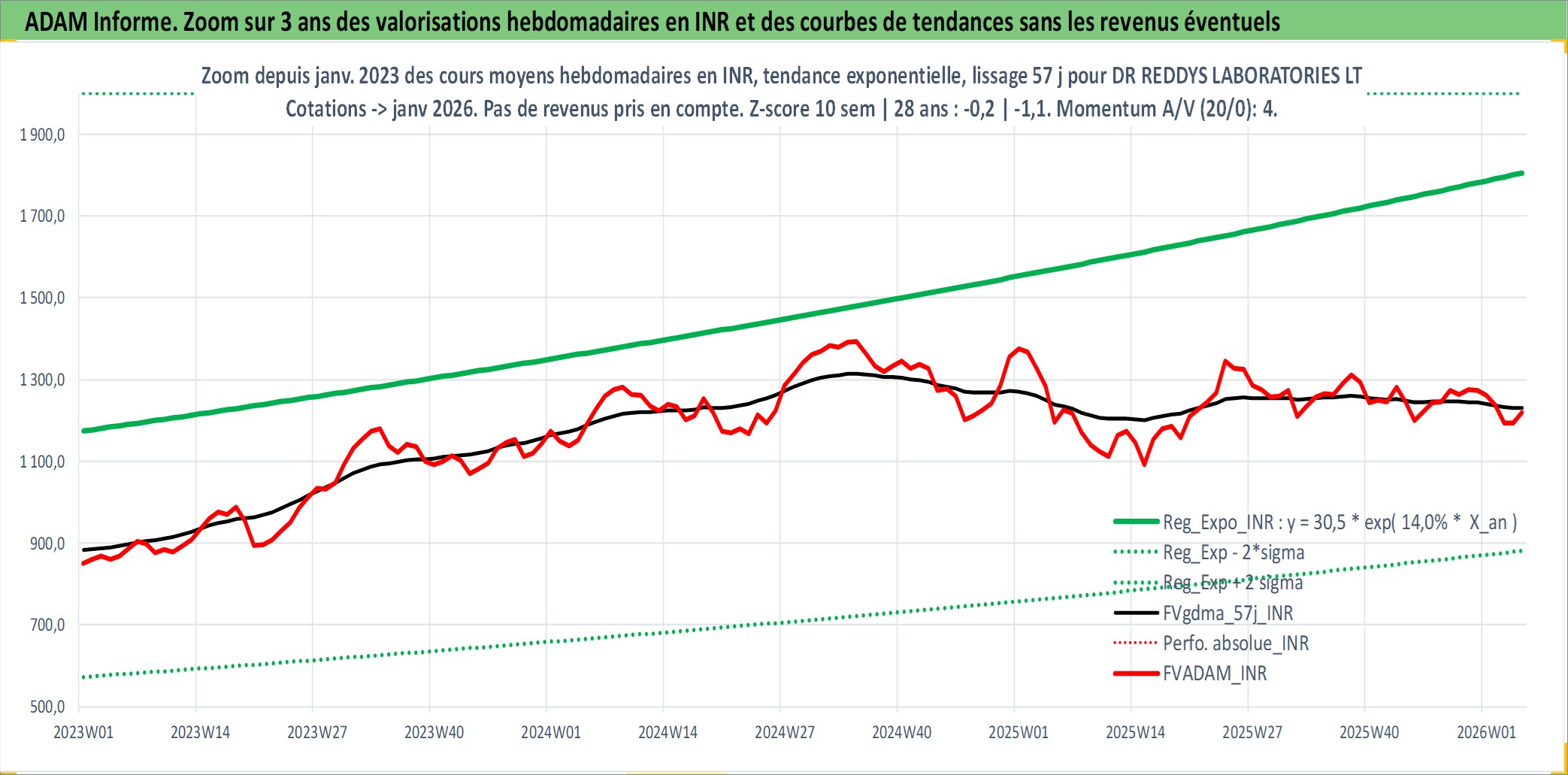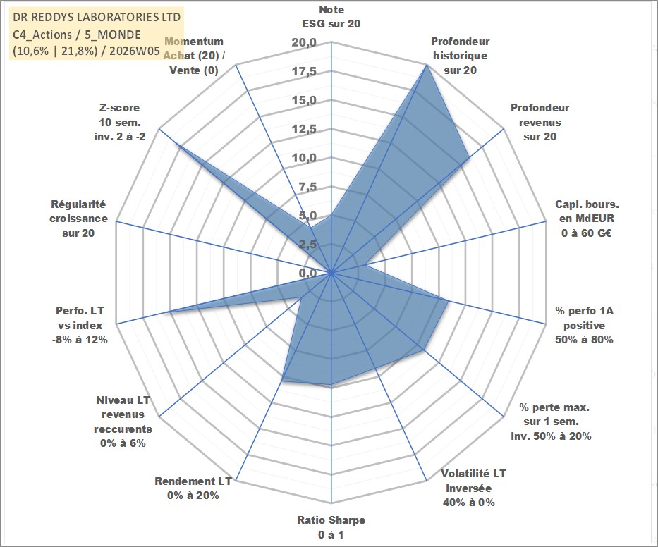 Site dédié aux investisseursPage dédiée sur site financeAnalyse des valorisations hebdomadaires de l'action DR REDDYS LABORATORIES LTD. Cet actif est cote en INR. Les valorisations sont en contrevaleur EURO et couvrent les semaines 1997W01 a 2026W05. Les revenus de cet actif financier sont pris en compte depuis la semaine 2003W32. La note globale ESG de cet actif est estimee a 5.0 (apres rebasage entre 0 et 20).
