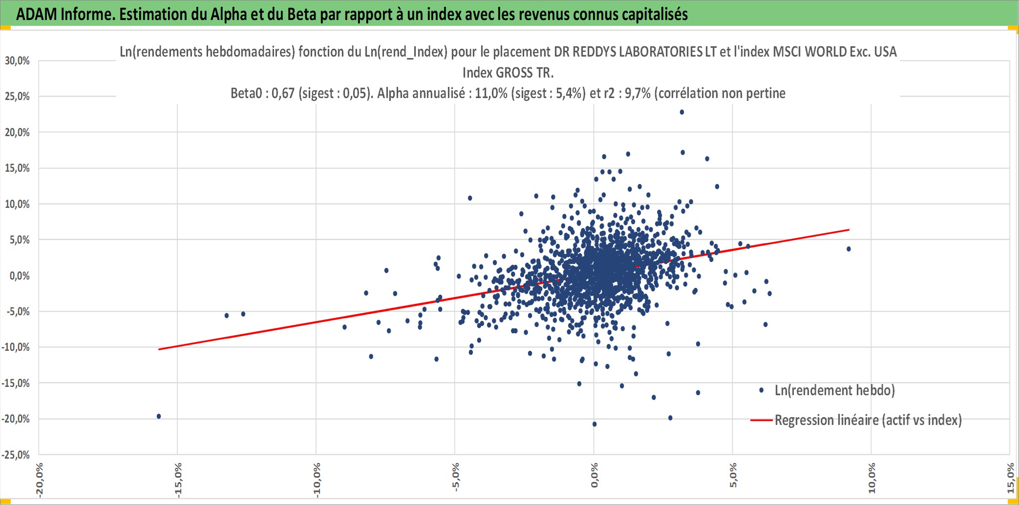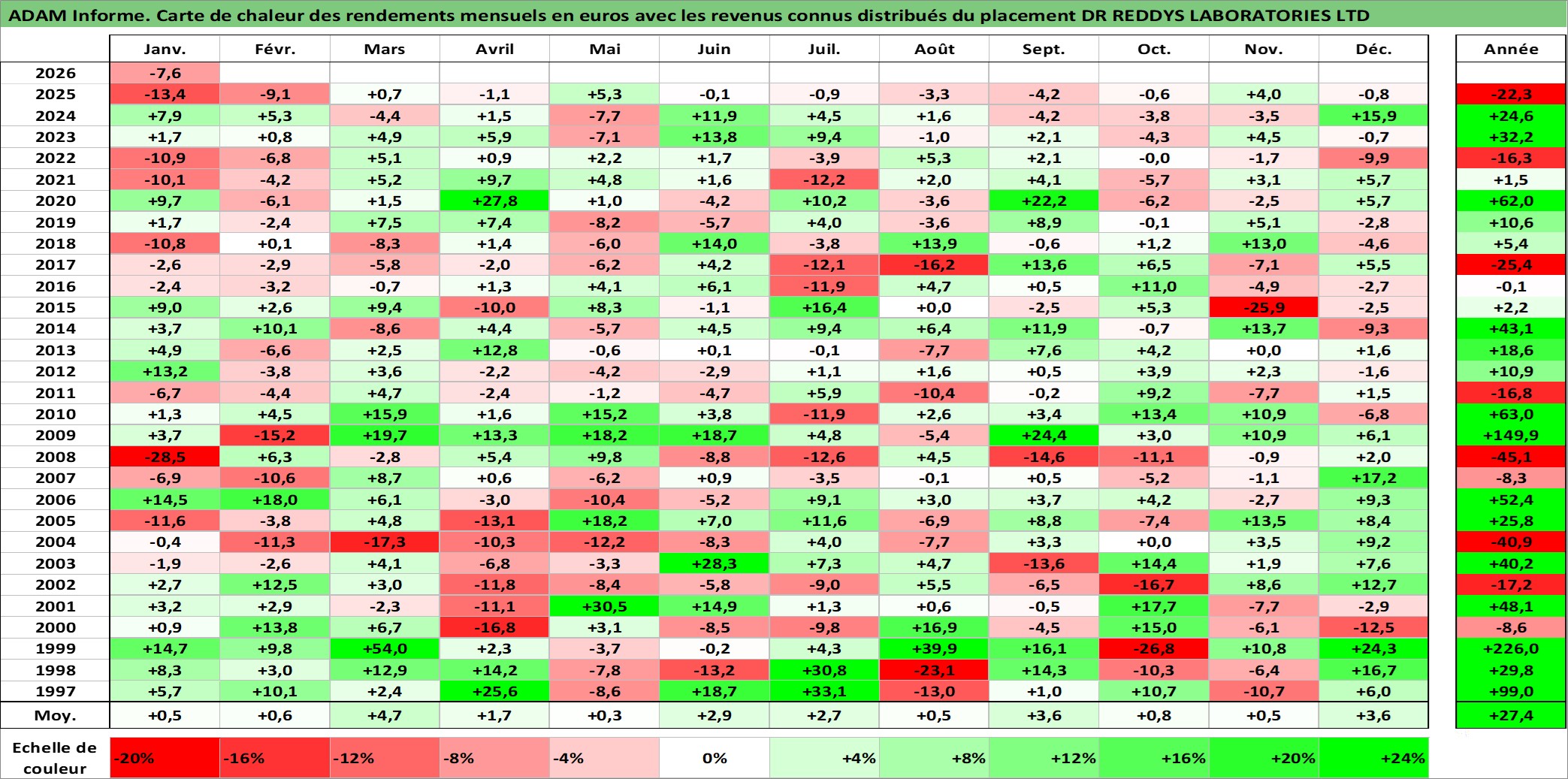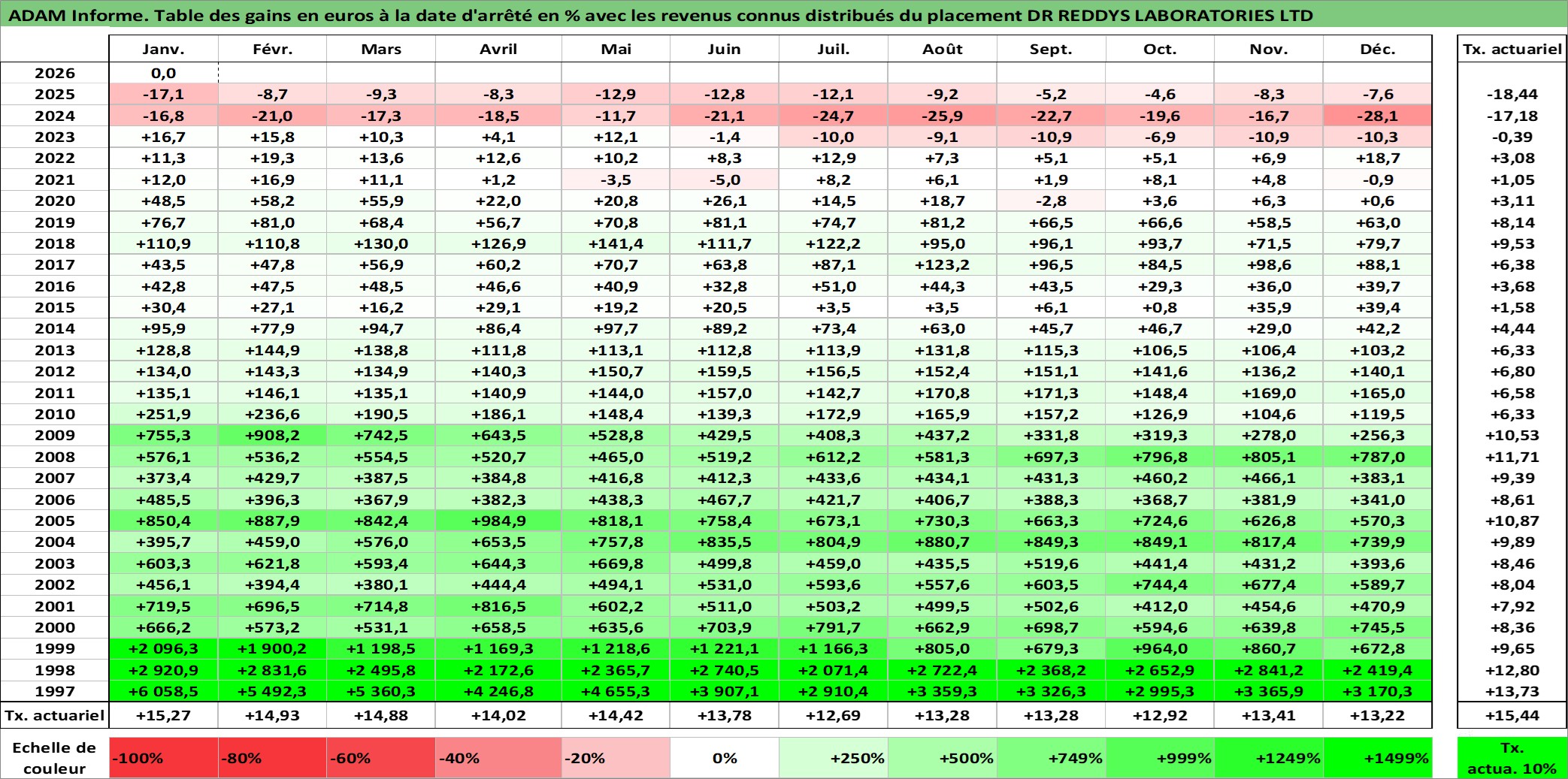 Site dédié aux investisseursPage dédiée sur site financeAnalyse des valorisations hebdomadaires de l'action DR REDDYS LABORATORIES LTD. Cet actif est cote en INR. Les valorisations sont en contrevaleur EURO et couvrent les semaines 1997W01 a 2026W05. Les revenus de cet actif financier sont pris en compte depuis la semaine 2003W32. La note globale ESG de cet actif est estimee a 5.0 (apres rebasage entre 0 et 20).