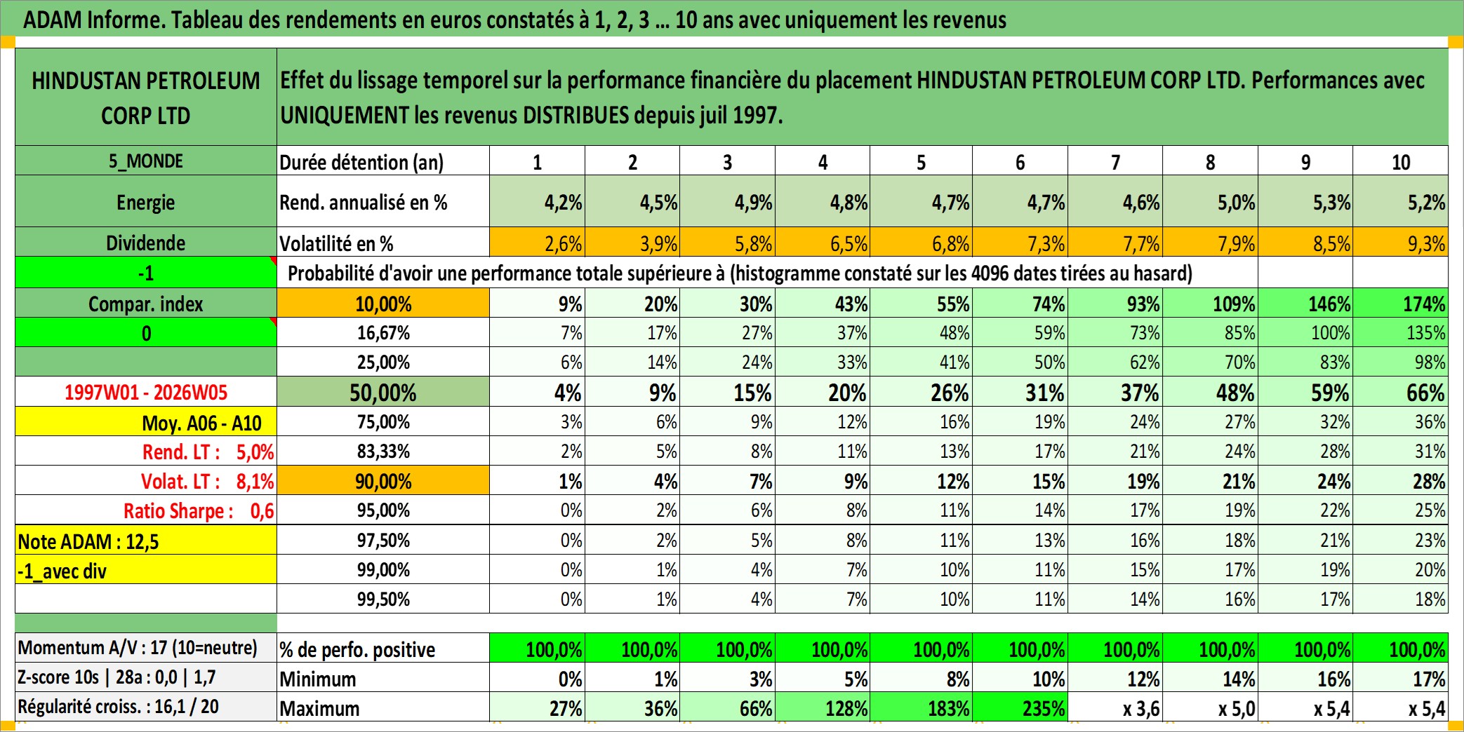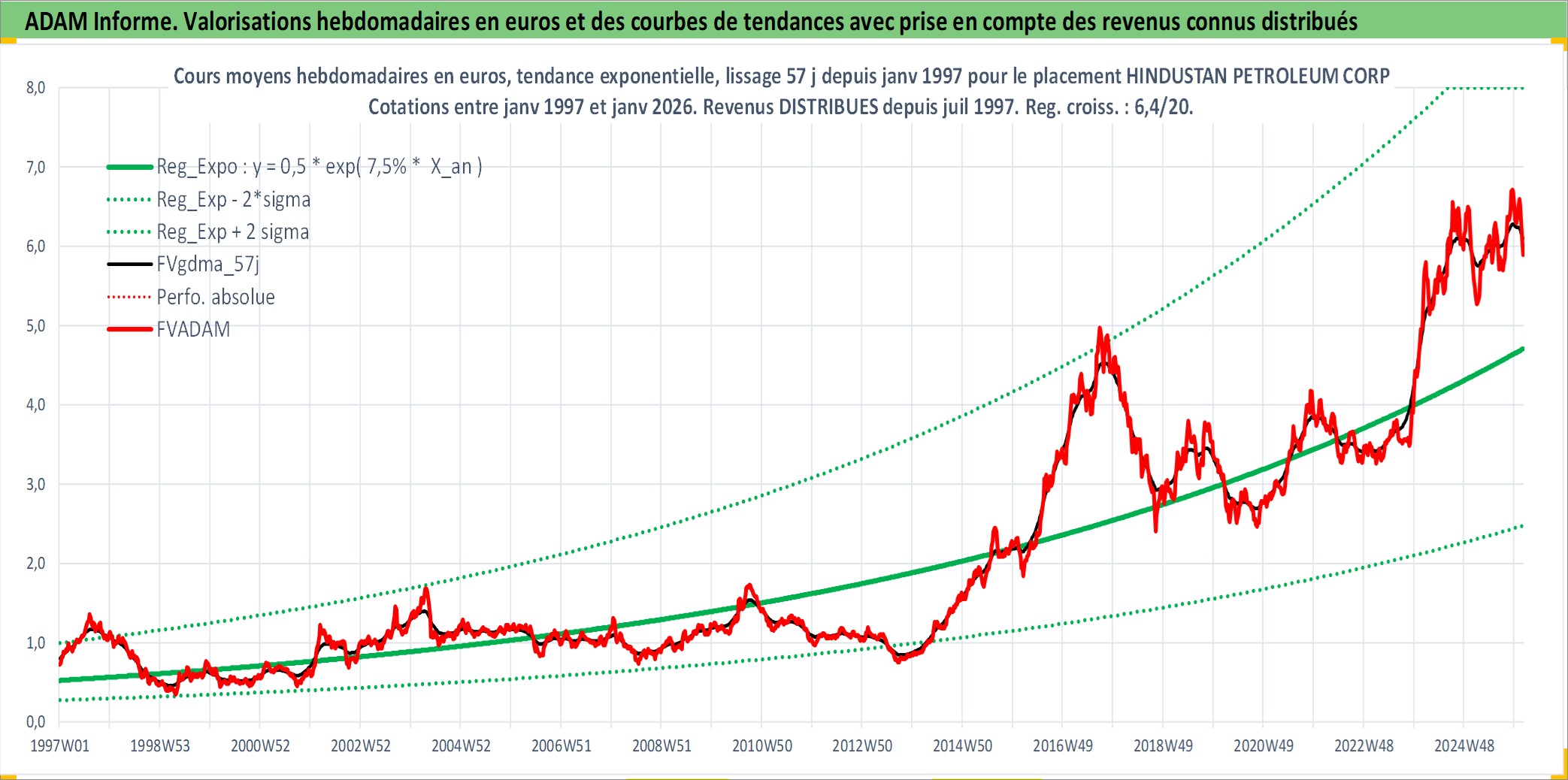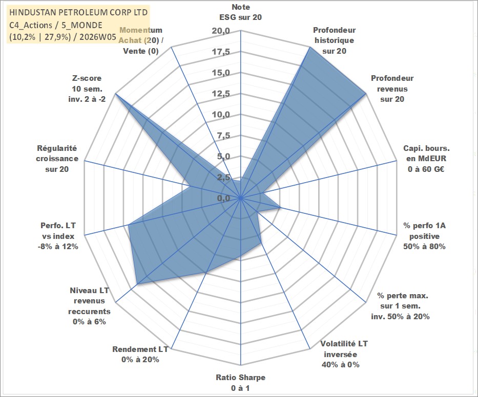 Site dédié aux investisseursPage dédiée sur site financeAnalyse des valorisations hebdomadaires de l'action HINDUSTAN PETROLEUM CORP LTD. Cet actif est cote en INR. Les valorisations sont en contrevaleur EURO et couvrent les semaines 1997W01 a 2026W05. Les revenus de cet actif financier sont pris en compte depuis la semaine 1997W29. La note globale ESG de cet actif est estimee a 2.0 (apres rebasage entre 0 et 20).