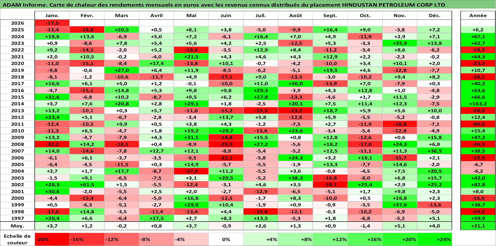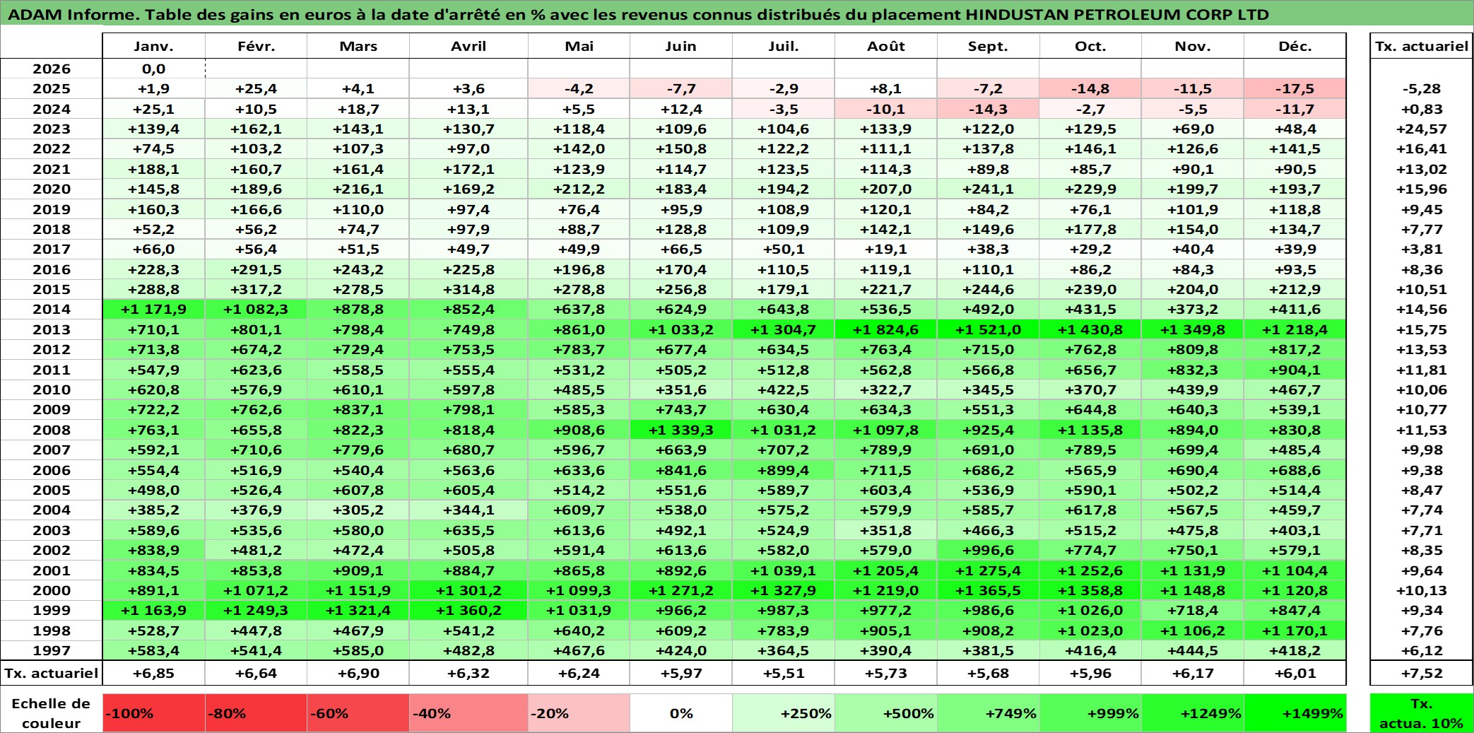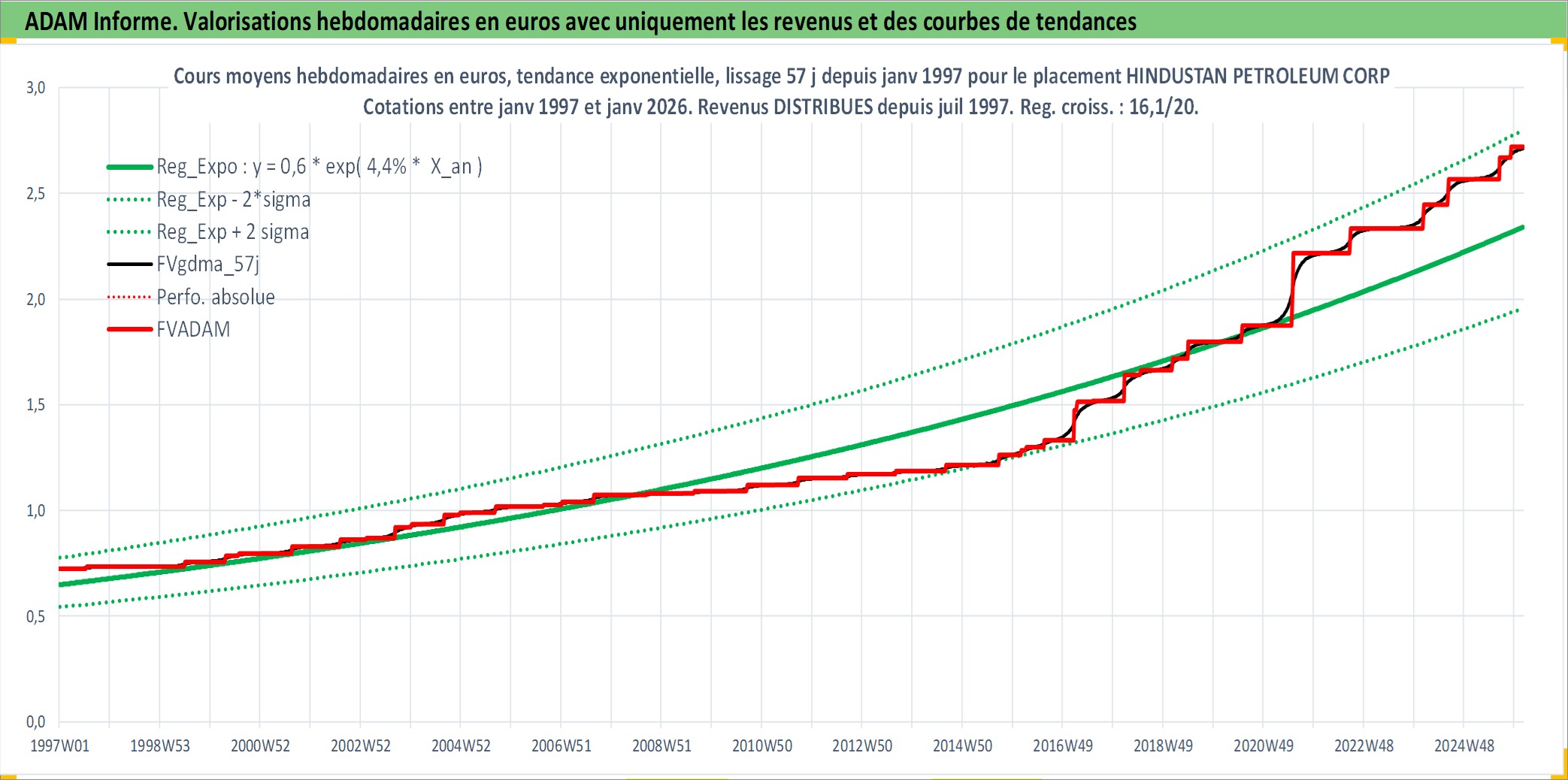 Site dédié aux investisseursPage dédiée sur site financeAnalyse des valorisations hebdomadaires de l'action HINDUSTAN PETROLEUM CORP LTD. Cet actif est cote en INR. Les valorisations sont en contrevaleur EURO et couvrent les semaines 1997W01 a 2026W05. Les revenus de cet actif financier sont pris en compte depuis la semaine 1997W29. La note globale ESG de cet actif est estimee a 2.0 (apres rebasage entre 0 et 20).