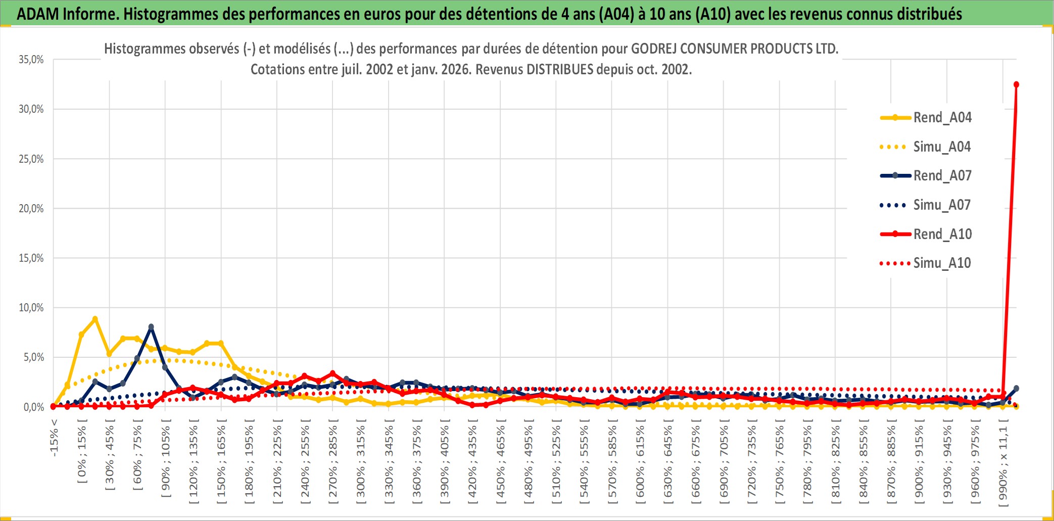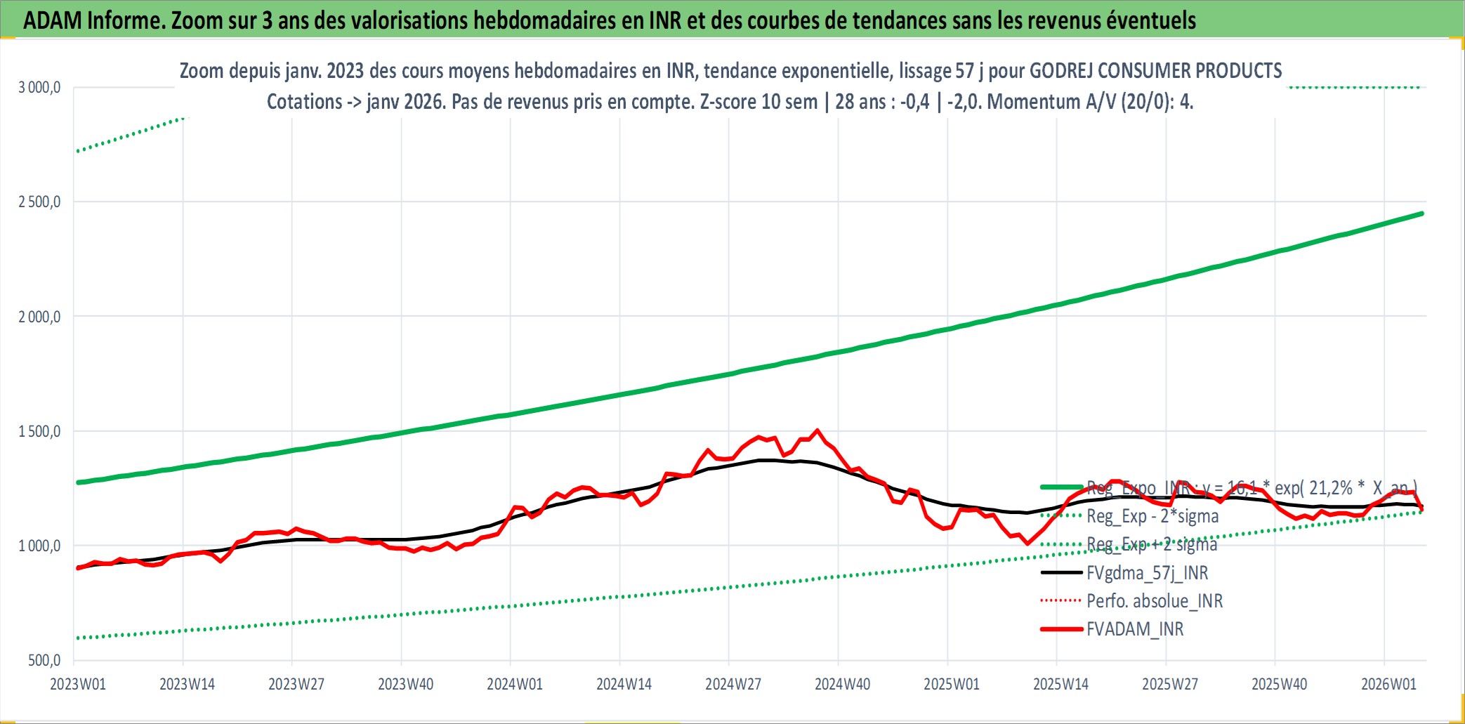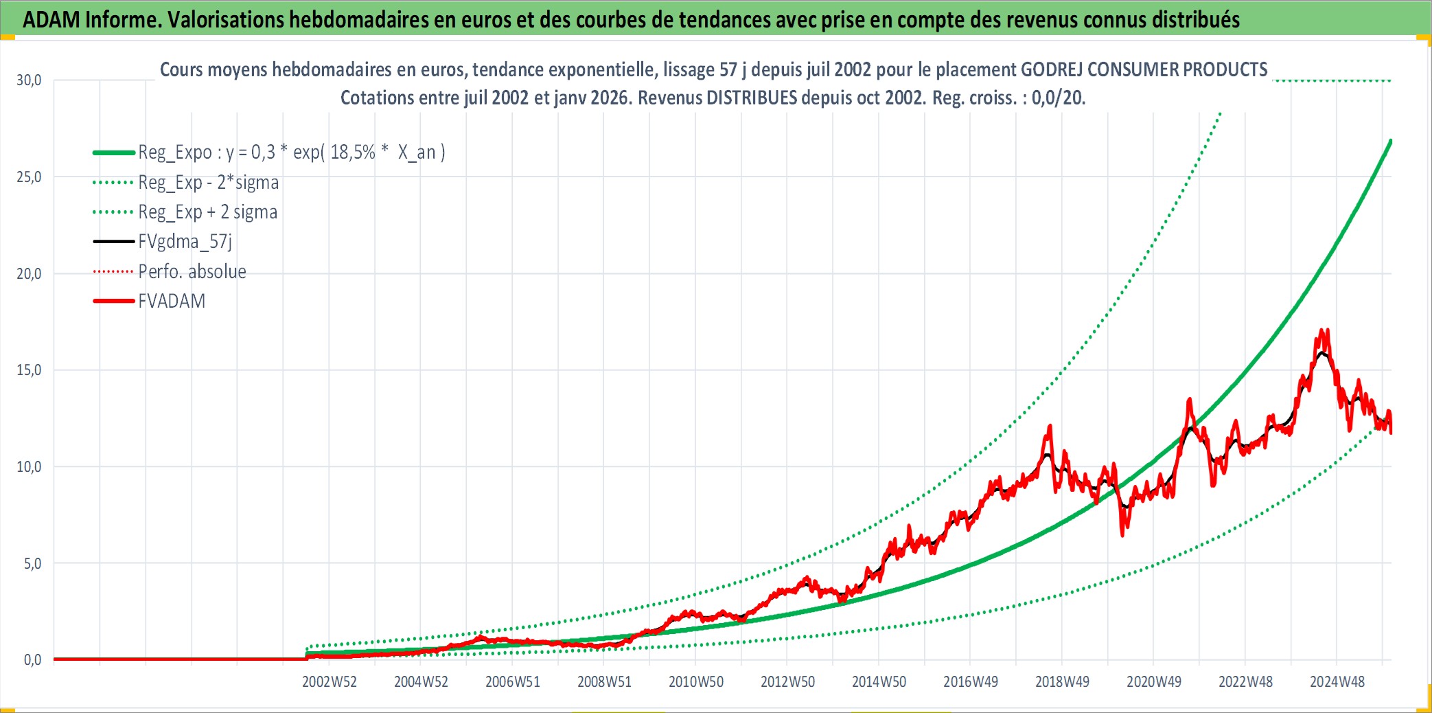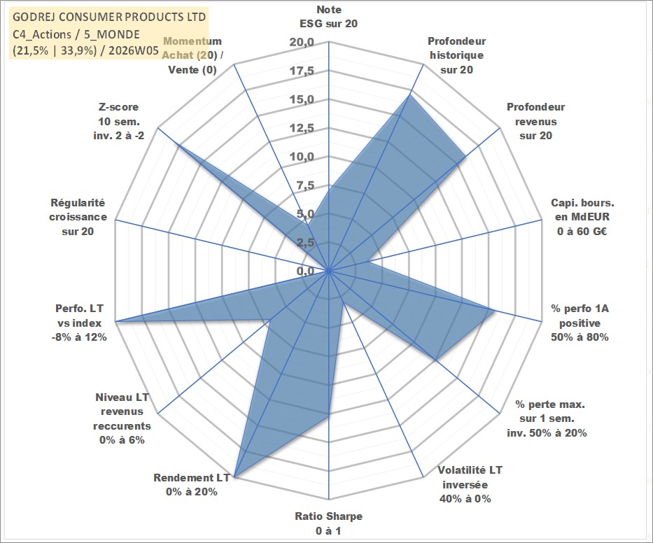 Site dédié aux investisseursPage dédiée sur site financeAnalyse des valorisations hebdomadaires de l'action GODREJ CONSUMER PRODUCTS LTD. Cet actif est cote en INR. Les valorisations sont en contrevaleur EURO et couvrent les semaines 2002W27 a 2026W05. Les revenus de cet actif financier sont pris en compte depuis la semaine 2002W44. La note globale ESG de cet actif est estimee a 7.0 (apres rebasage entre 0 et 20).