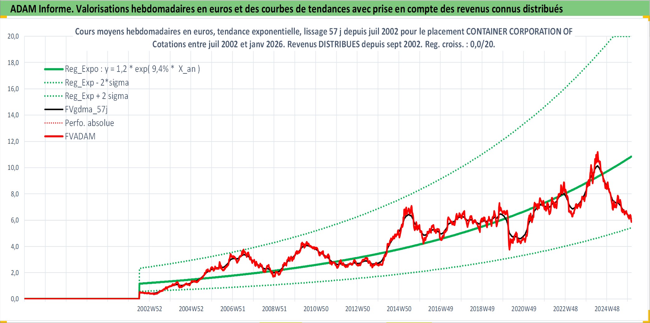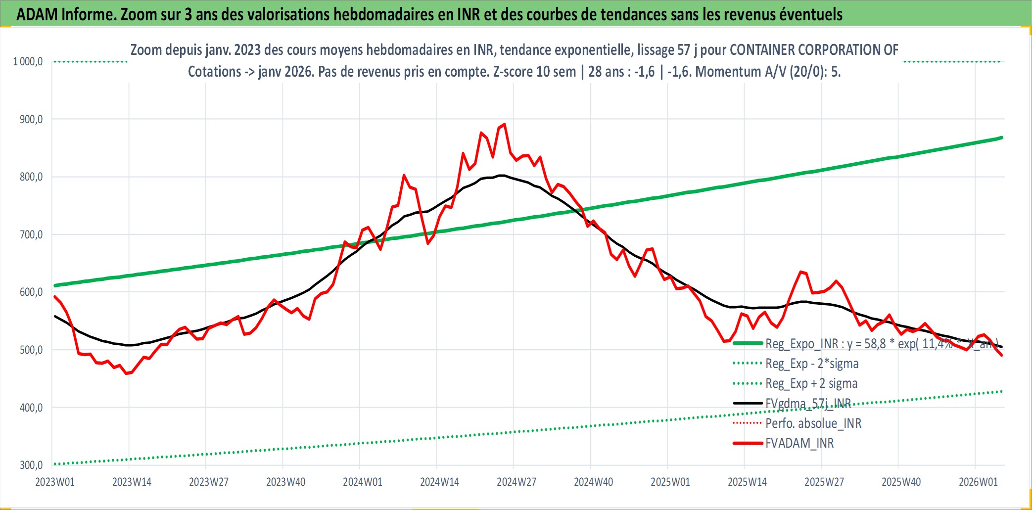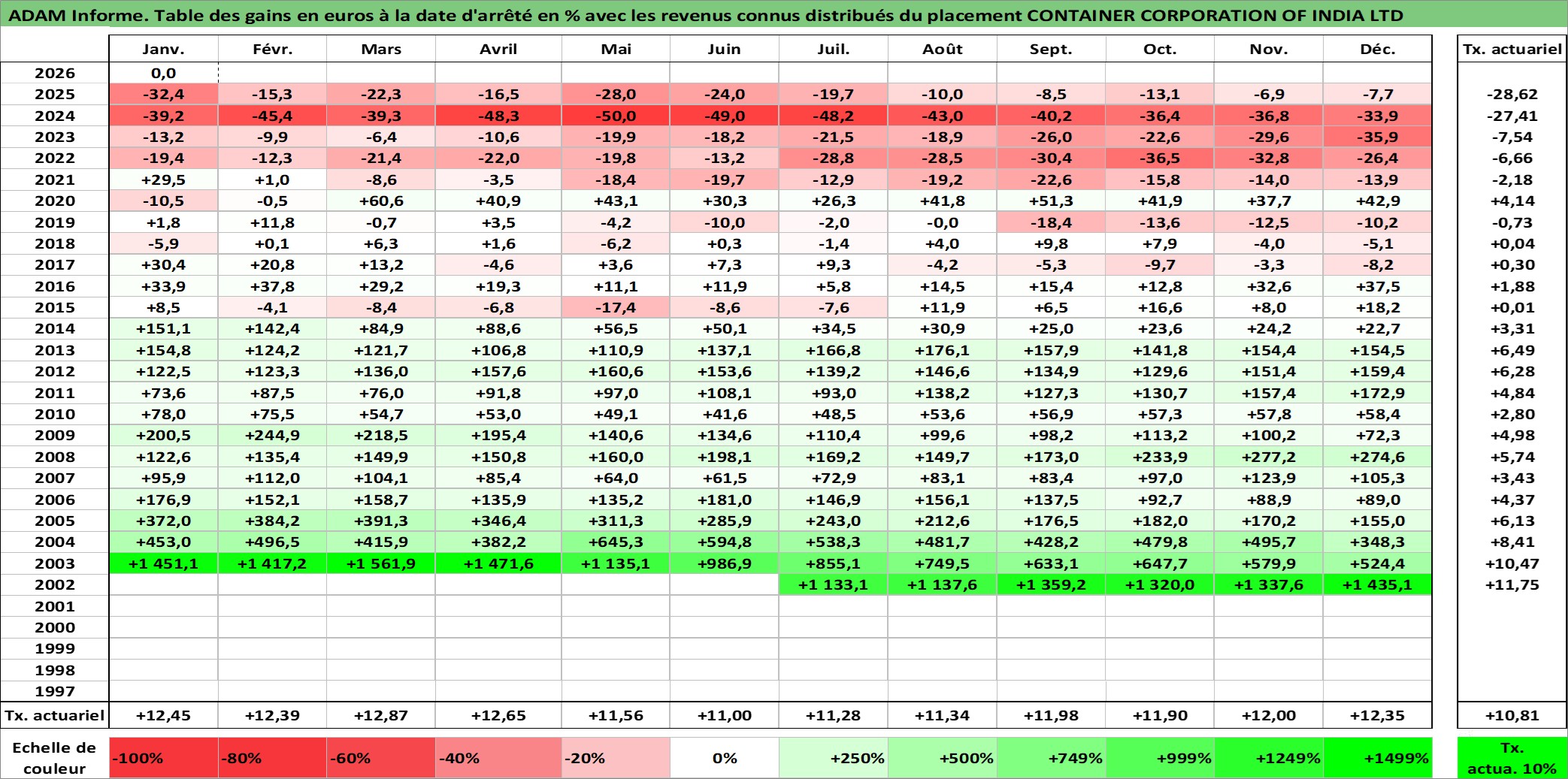 Site dédié aux investisseursPage dédiée sur site financeAnalyse des valorisations hebdomadaires de l'action CONTAINER CORPORATION OF INDIA LTD. Cet actif est cote en INR. Les valorisations sont en contrevaleur EURO et couvrent les semaines 2002W27 a 2026W05. Les revenus de cet actif financier sont pris en compte depuis la semaine 2002W37. La note ESG de cet actif n'est pas connue.