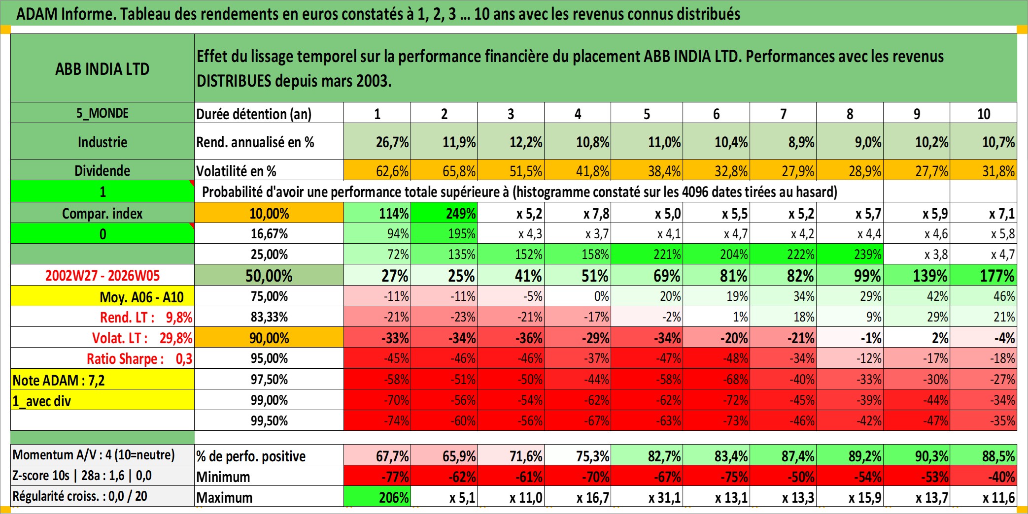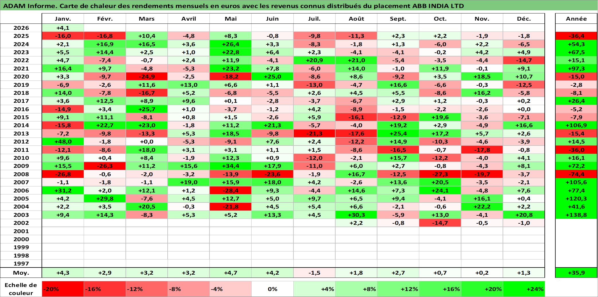 Site dédié aux investisseursPage dédiée sur site financeAnalyse des valorisations hebdomadaires de l'action ABB INDIA LTD. Cet actif est cote en INR. Les valorisations sont en contrevaleur EURO et couvrent les semaines 2002W27 a 2026W05. Les revenus de cet actif financier sont pris en compte depuis la semaine 2003W13. La note ESG de cet actif n'est pas connue.