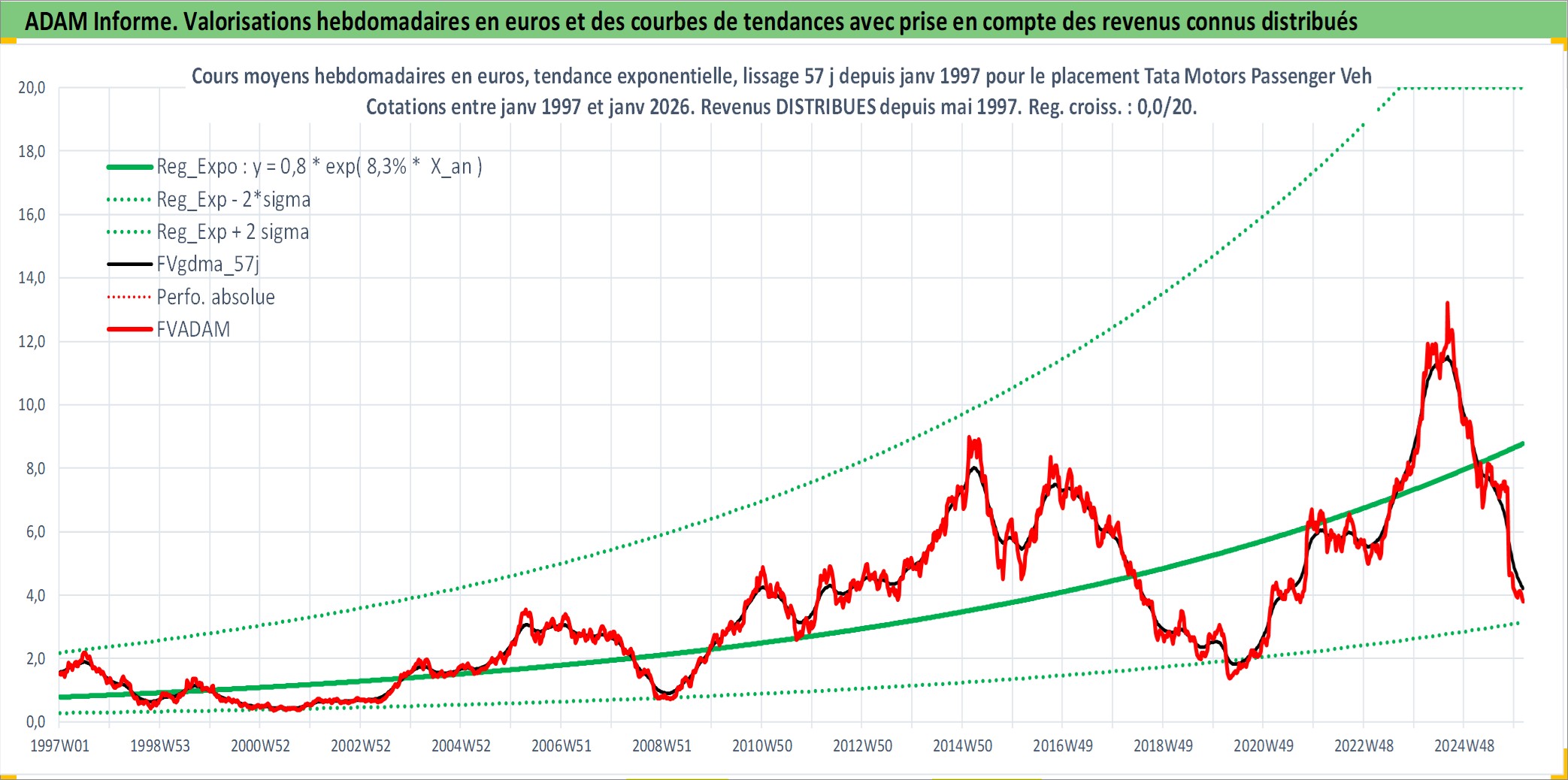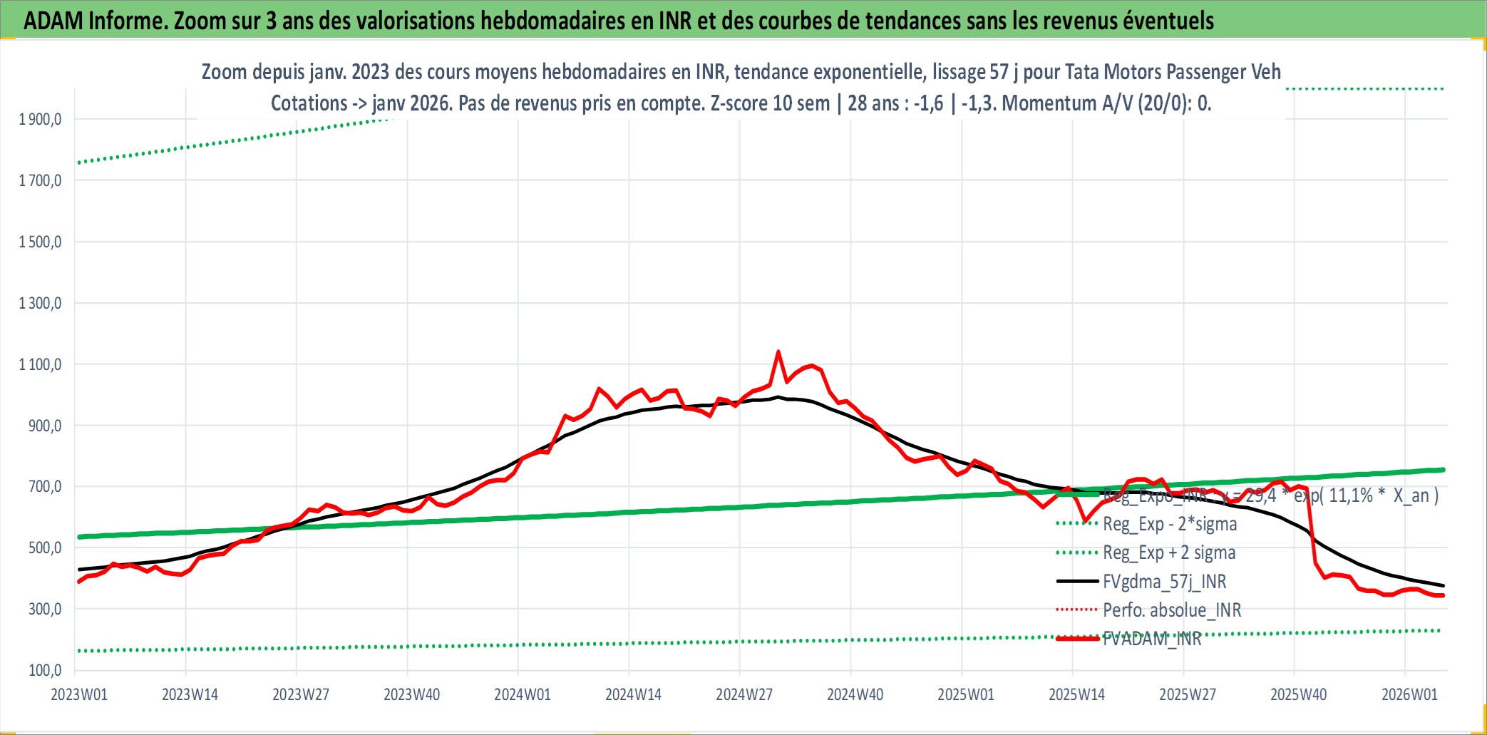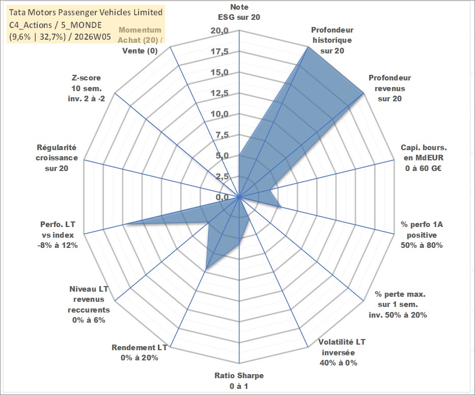 Site dédié aux investisseursPage dédiée sur site financeAnalyse des valorisations hebdomadaires de l'action Tata Motors Passenger Vehicles Limited. Cet actif est cote en INR. Les valorisations sont en contrevaleur EURO et couvrent les semaines 1997W01 a 2026W05. Les revenus de cet actif financier sont pris en compte depuis la semaine 1997W20. La note globale ESG de cet actif est estimee a 5.0 (apres rebasage entre 0 et 20).