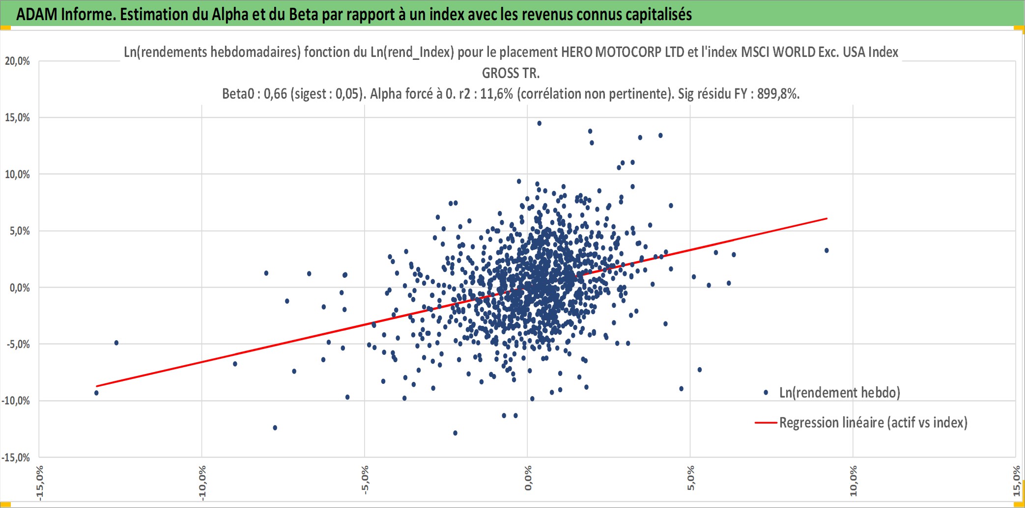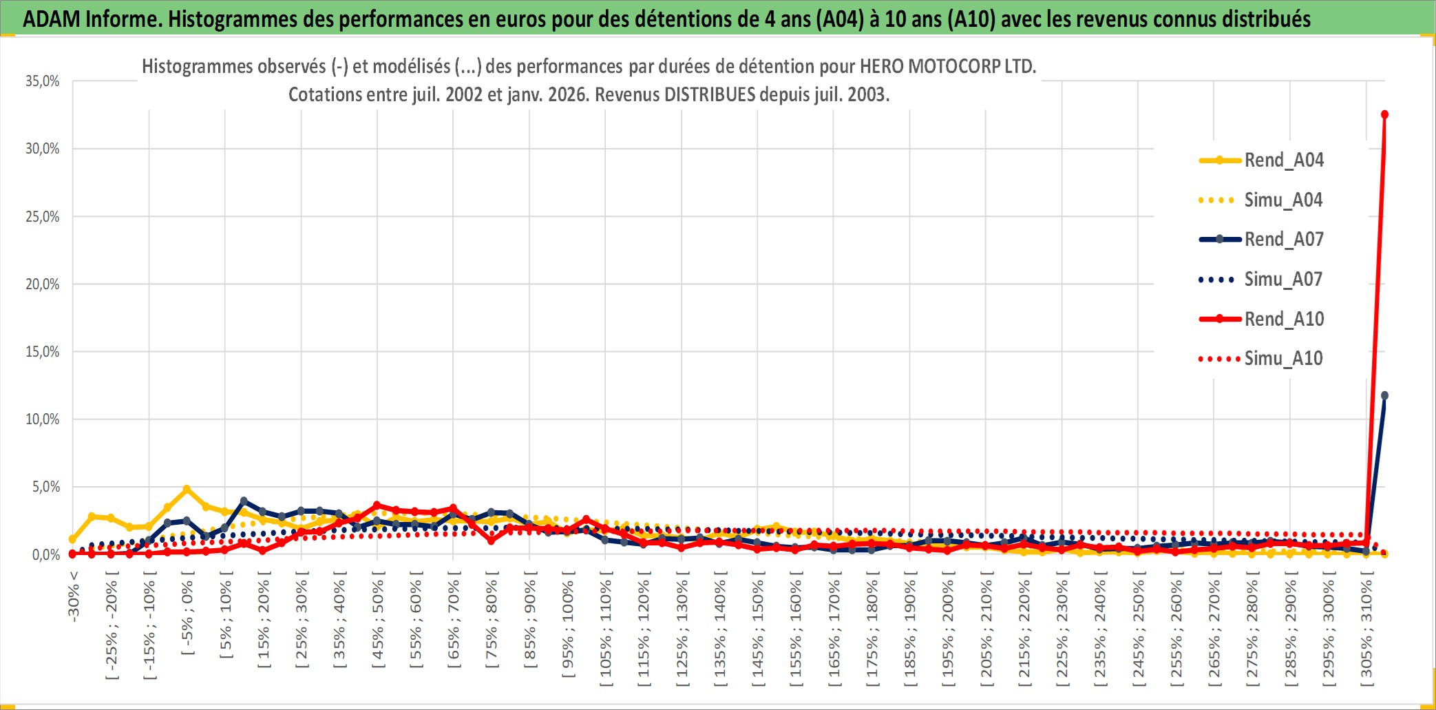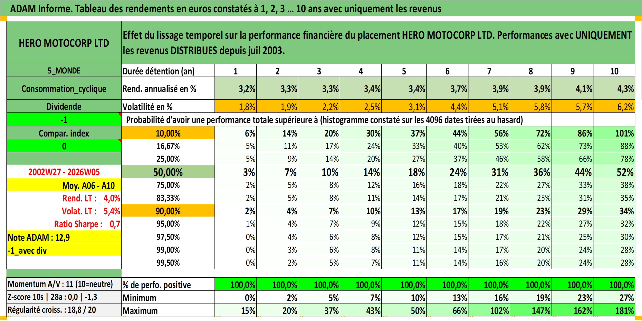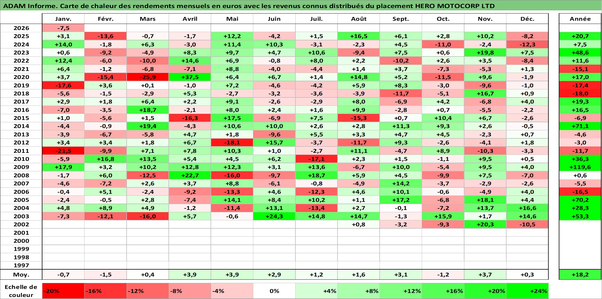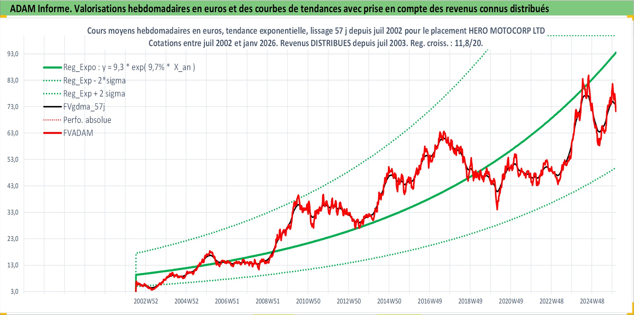 Site dédié aux investisseursPage dédiée sur site financeAnalyse des valorisations hebdomadaires de l'action HERO MOTOCORP LTD. Cet actif est cote en INR. Les valorisations sont en contrevaleur EURO et couvrent les semaines 2002W27 a 2026W05. Les revenus de cet actif financier sont pris en compte depuis la semaine 2003W29. La note globale ESG de cet actif est estimee a 16.0 (apres rebasage entre 0 et 20).