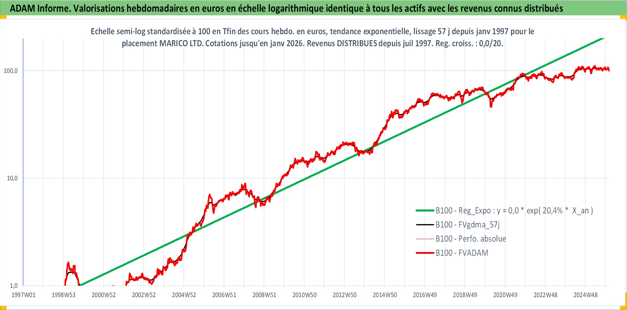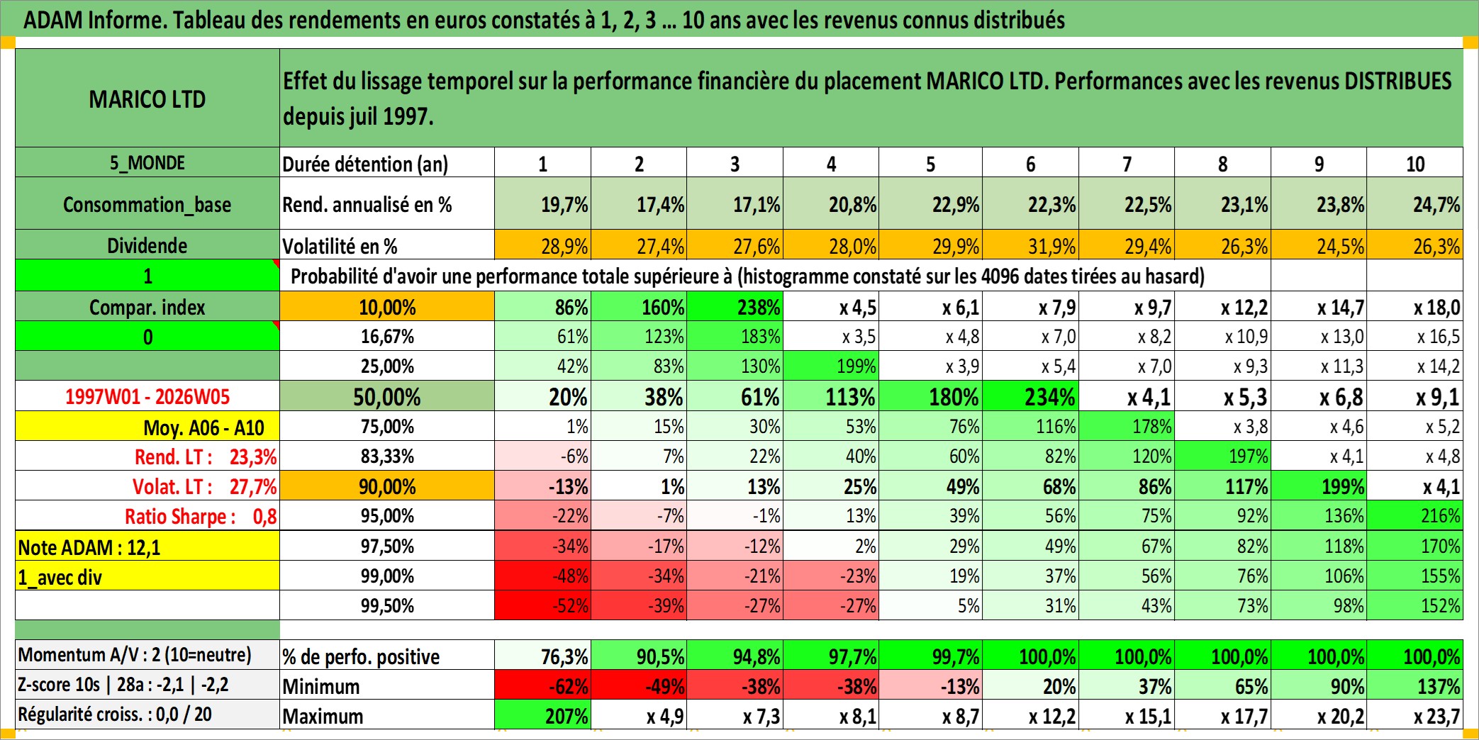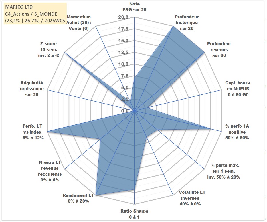 Site dédié aux investisseursPage dédiée sur site financeAnalyse des valorisations hebdomadaires de l'action MARICO LTD. Cet actif est cote en INR. Les valorisations sont en contrevaleur EURO et couvrent les semaines 1997W01 a 2026W05. Les revenus de cet actif financier sont pris en compte depuis la semaine 1997W31. La note globale ESG de cet actif est estimee a 7.0 (apres rebasage entre 0 et 20).